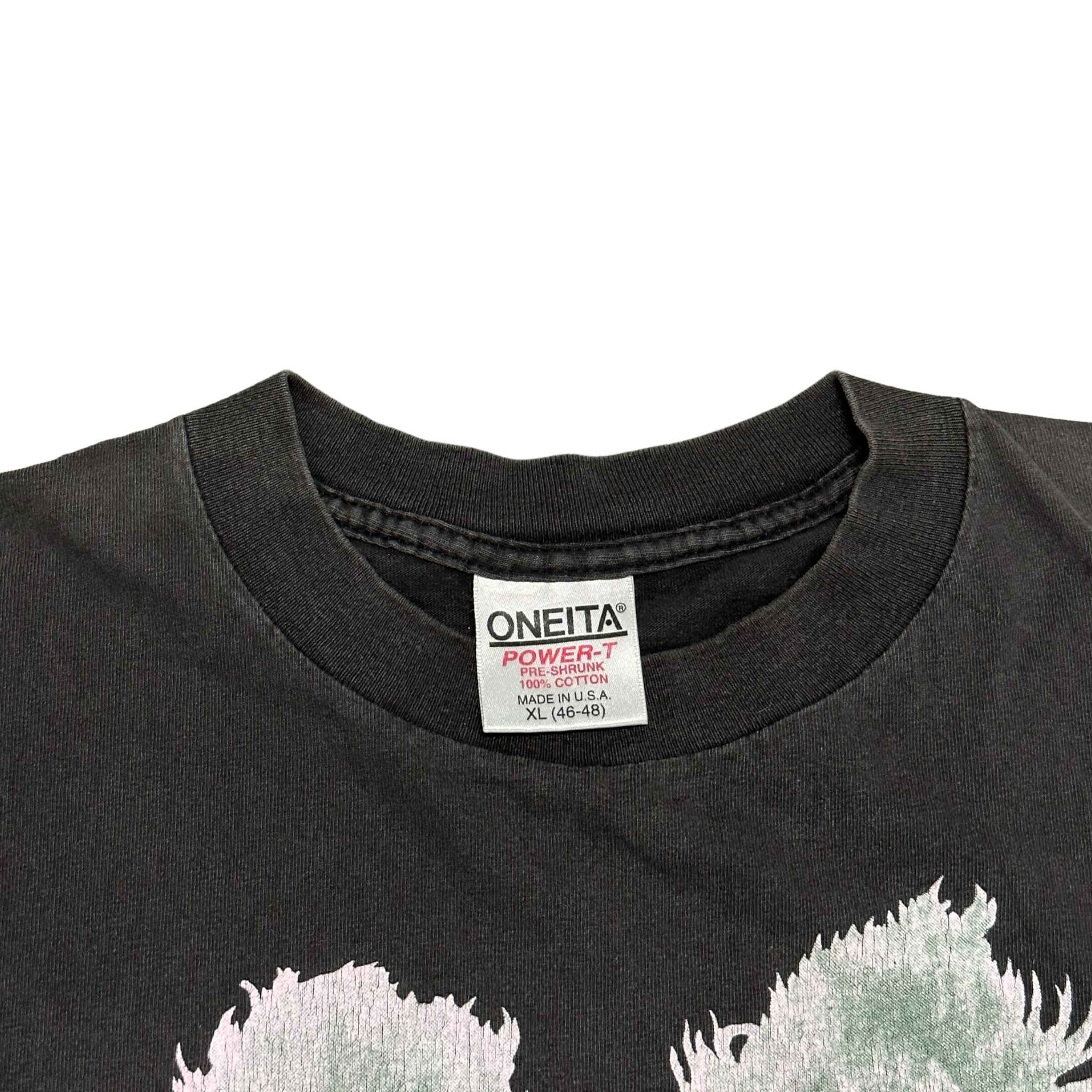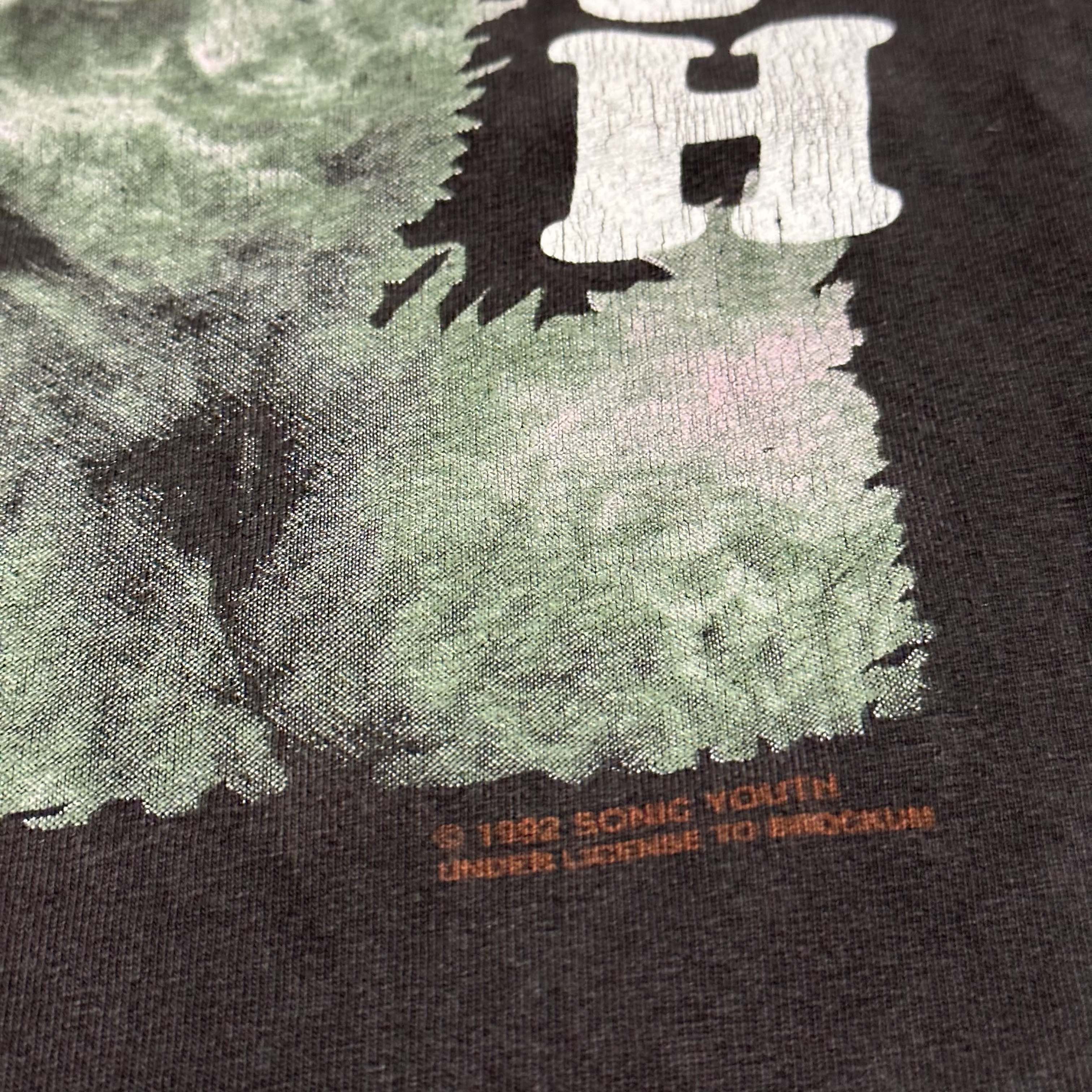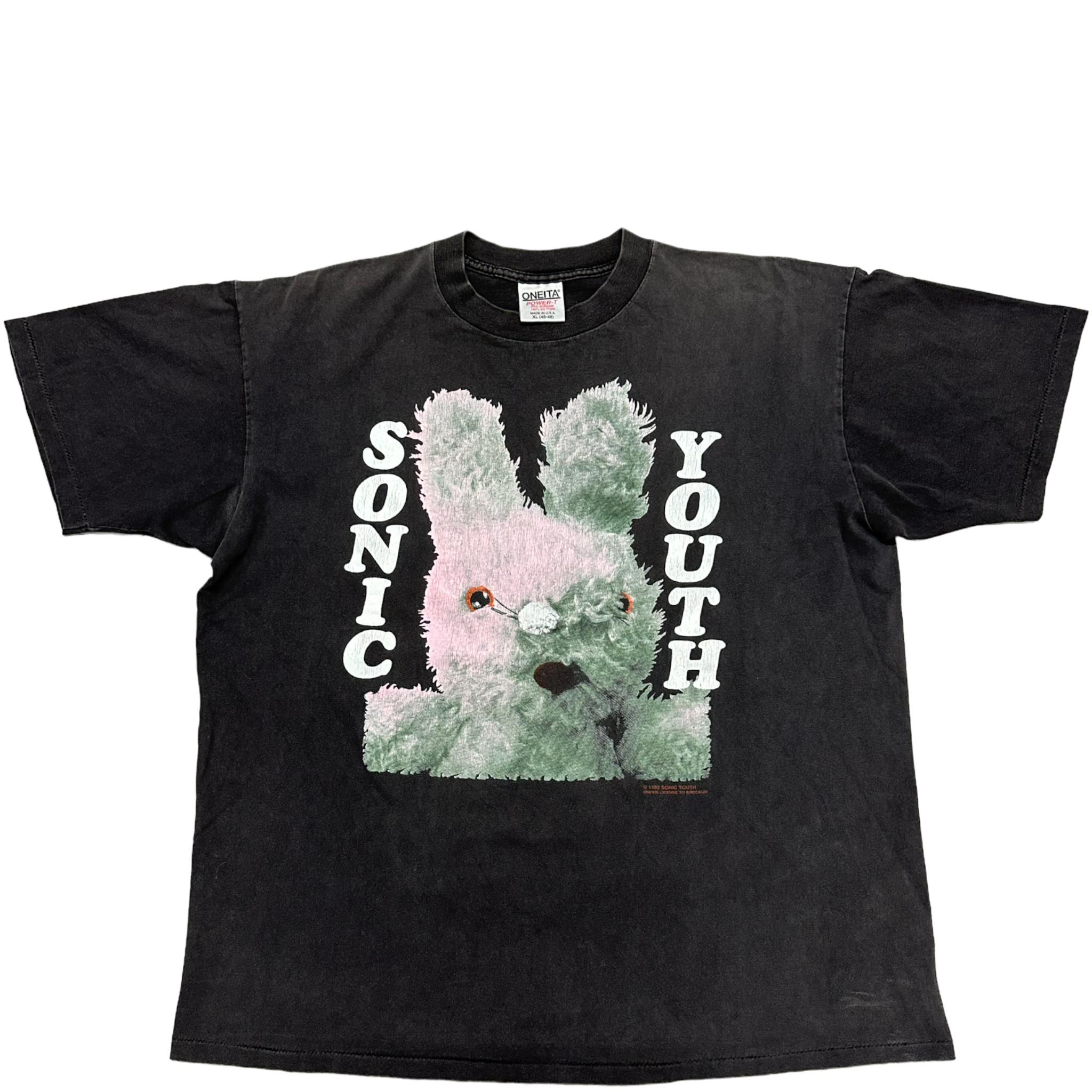 Sonic Youth t-shirt from their 1992 album “Dirty”. The front features the bunny from Mike Kelleys artwork. The back says Gracias. Sonic Youth copyright. Oneita tag size XL. Fits XL. Single stitch.