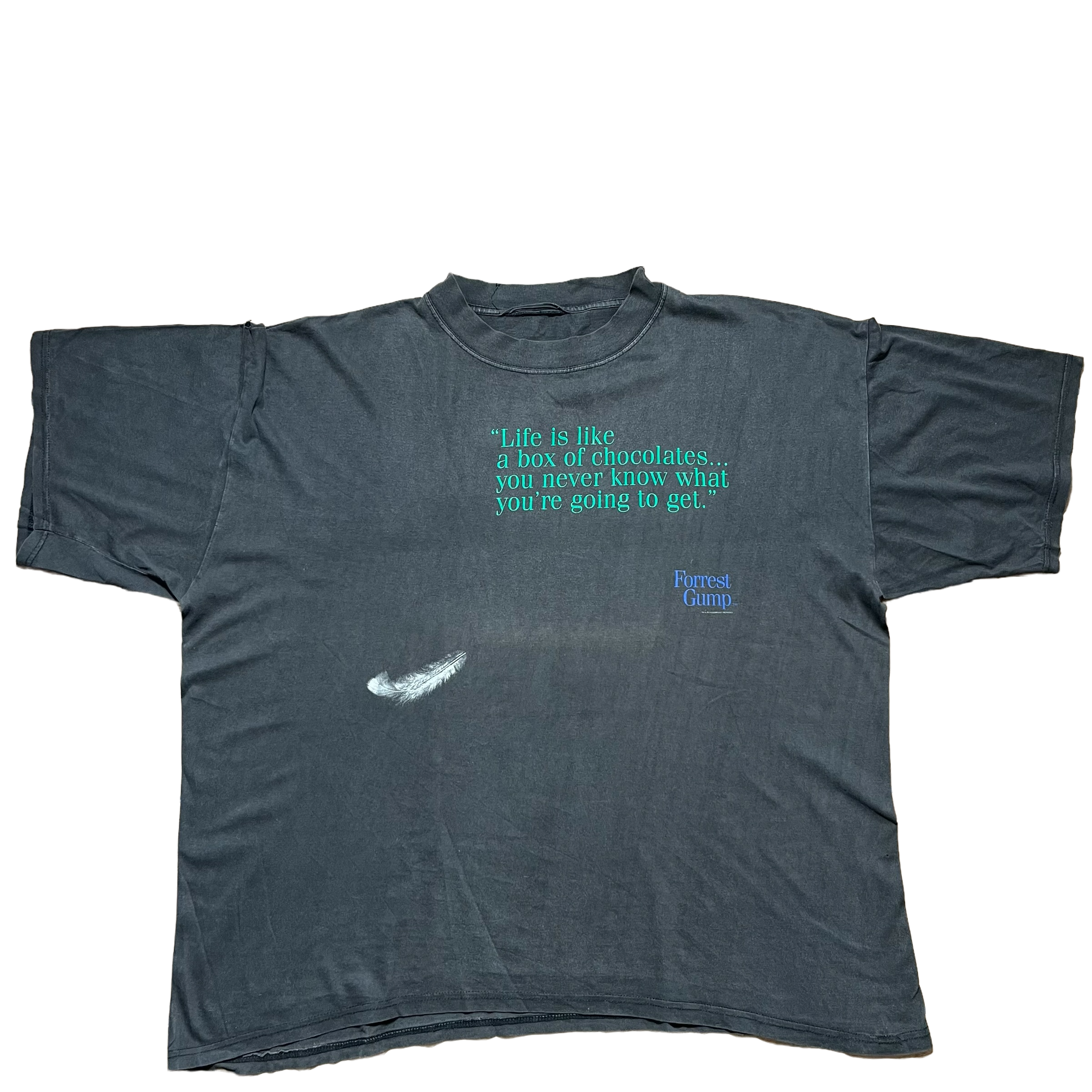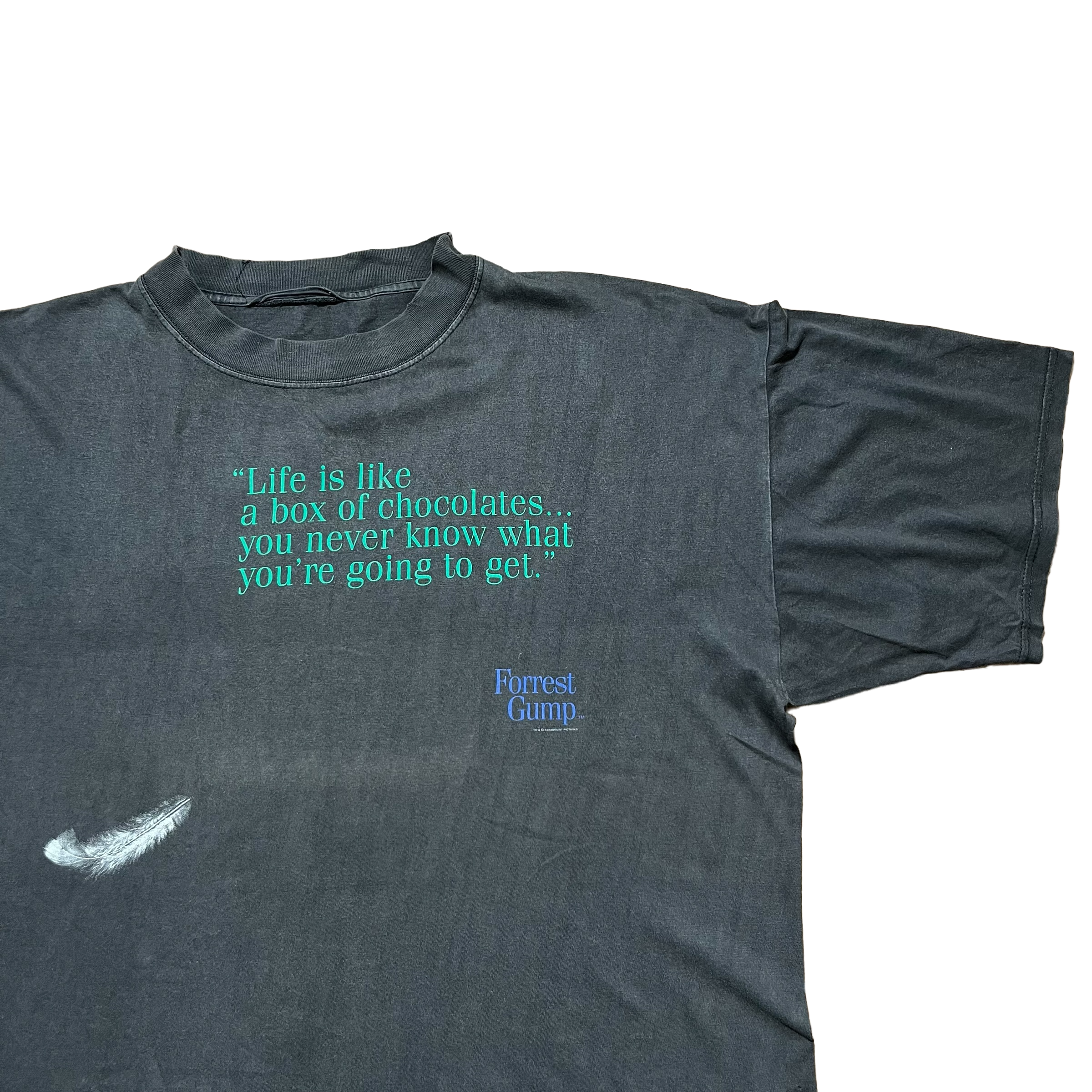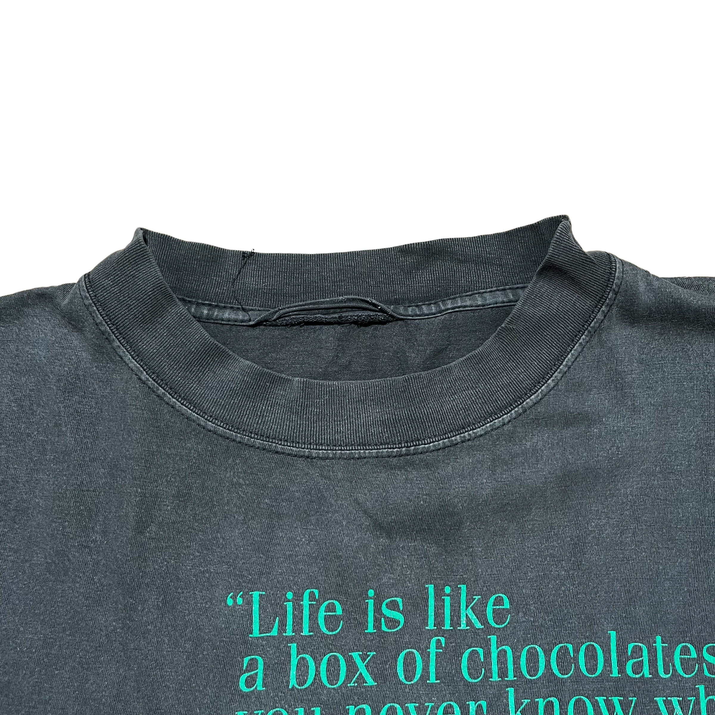 Classic promotional Forrest Gump t-shirt with one of the most famous movie quotes of all time "Life is like a box of chocolates... you never know what you're going to get." and the iconic feather. Paramount Pictures copyright. Tag cut off. Fits boxy XL.