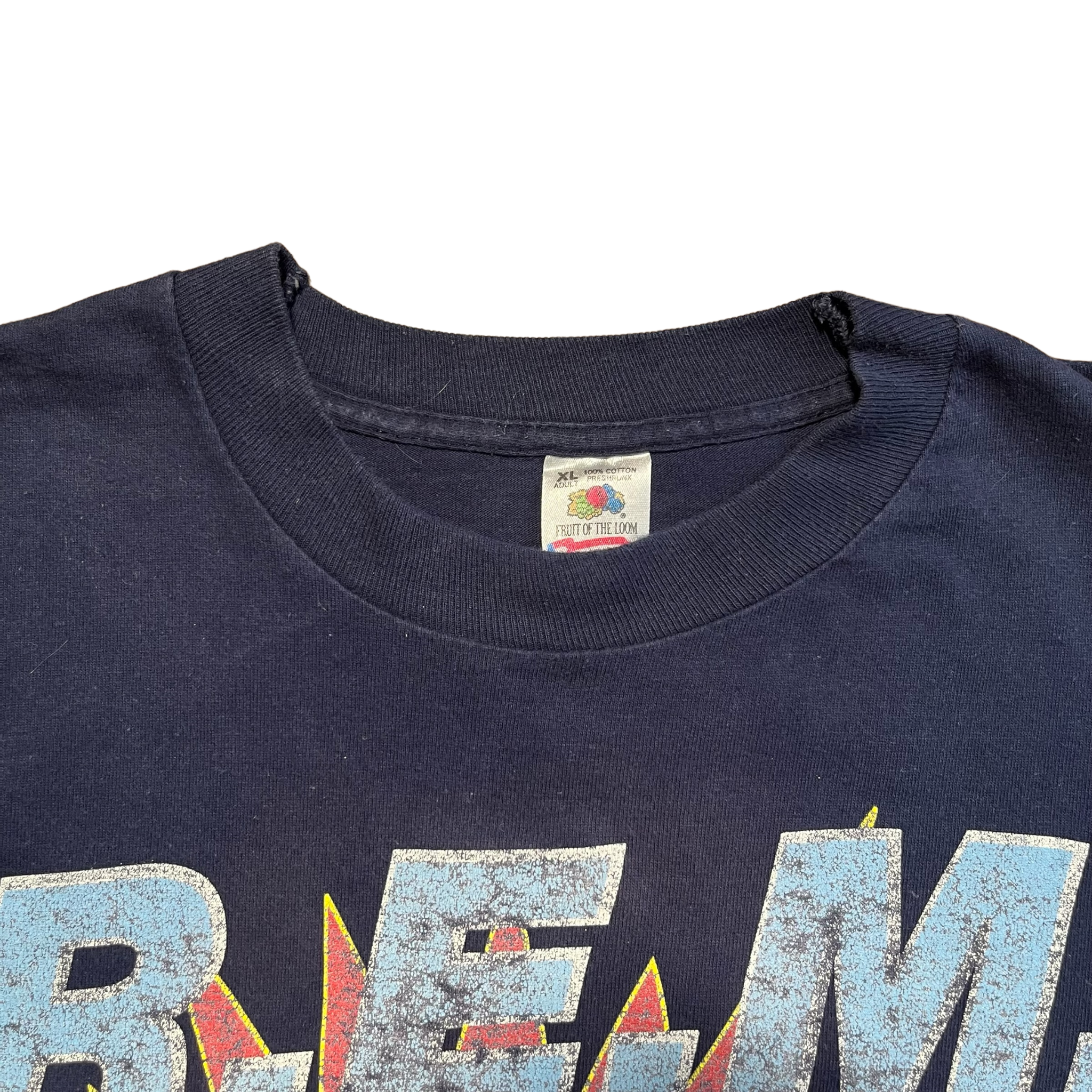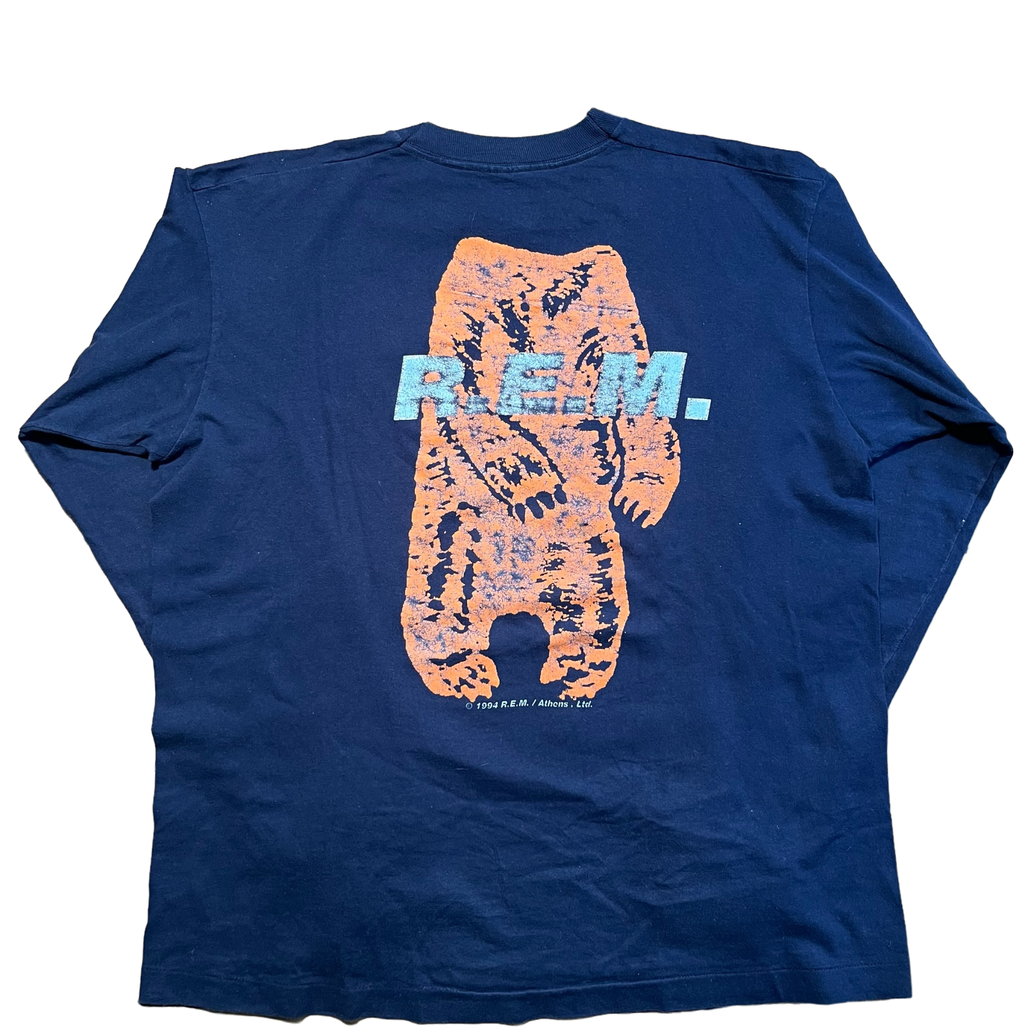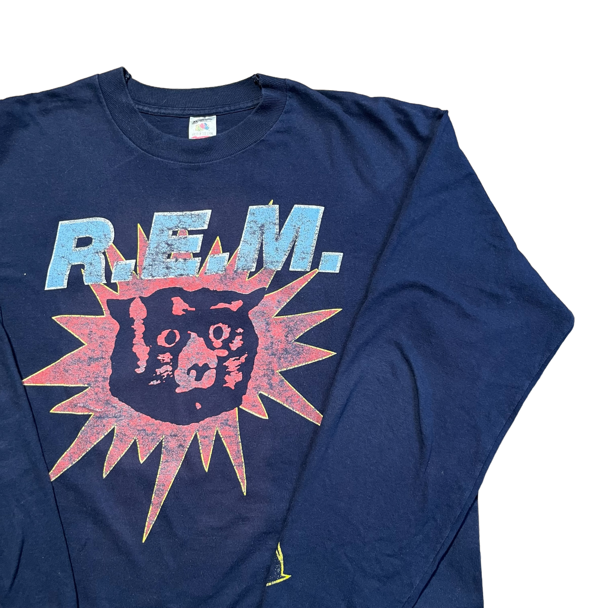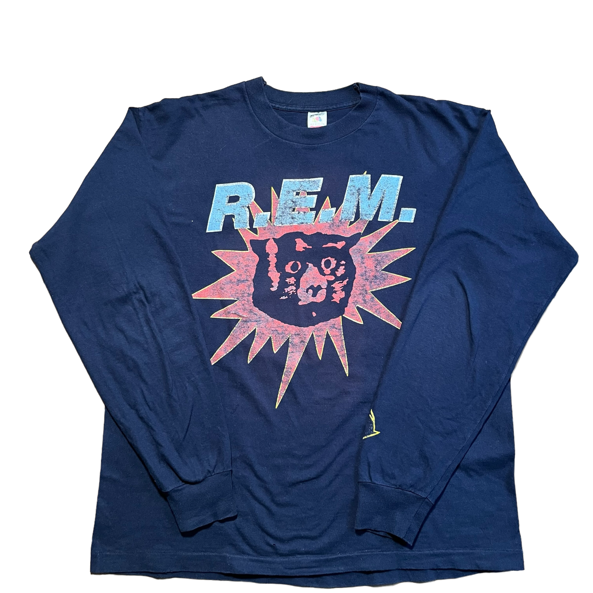 Really good R.E.M. long-sleeved t-shirt featuring artwork from their 1994 album "Monster". R.E.M. copyright. Fruit of the Loom tag size XL. Fits XXL. Single stitch.