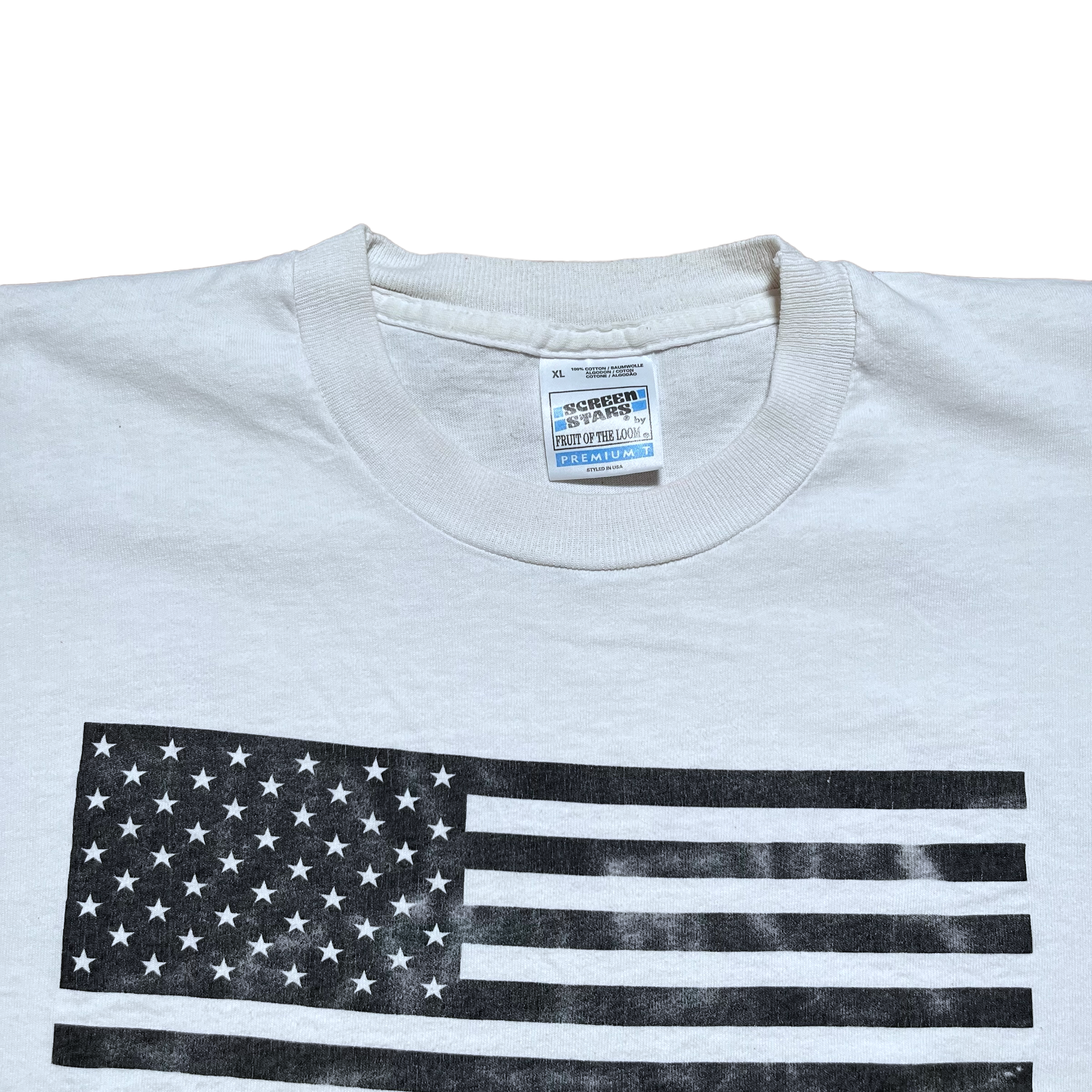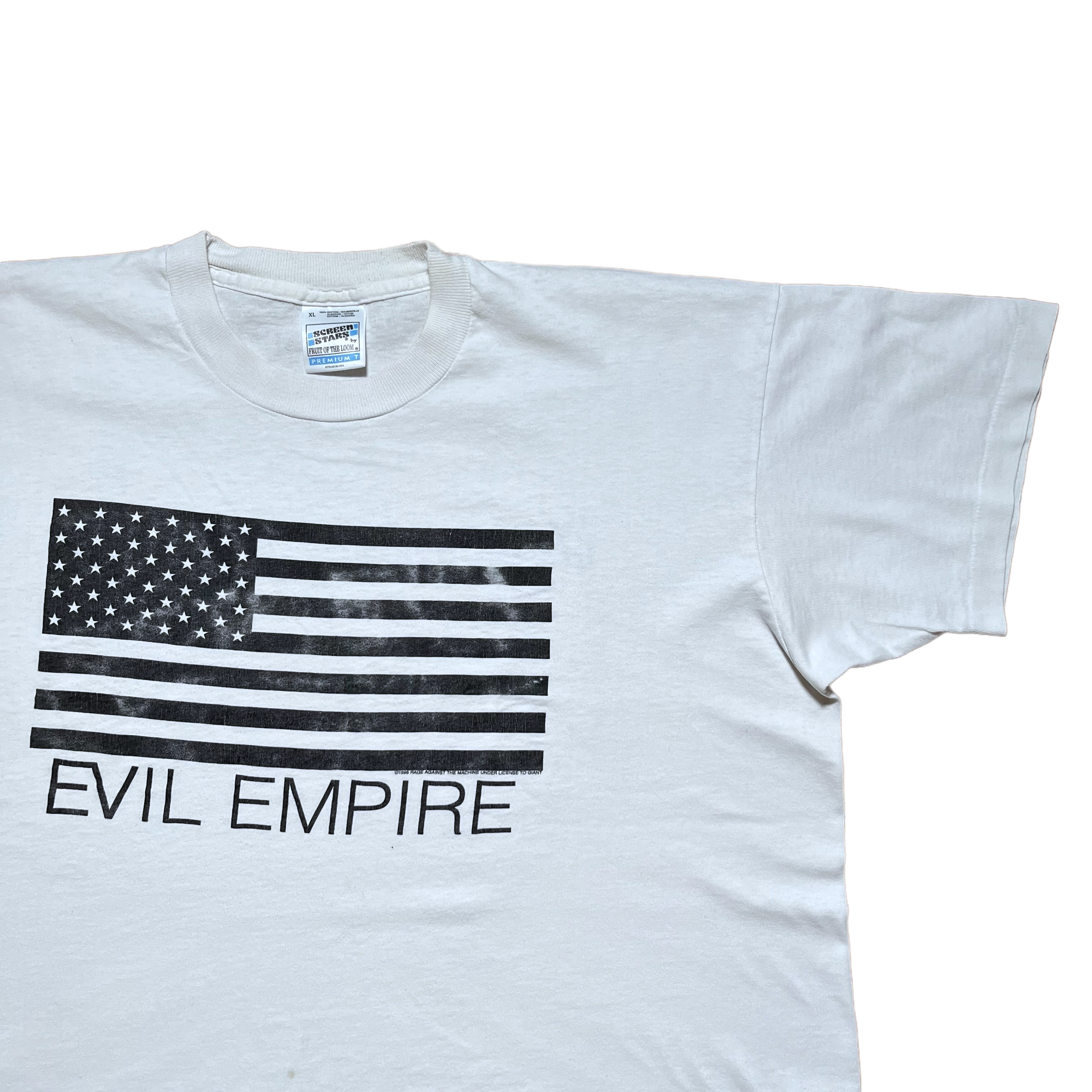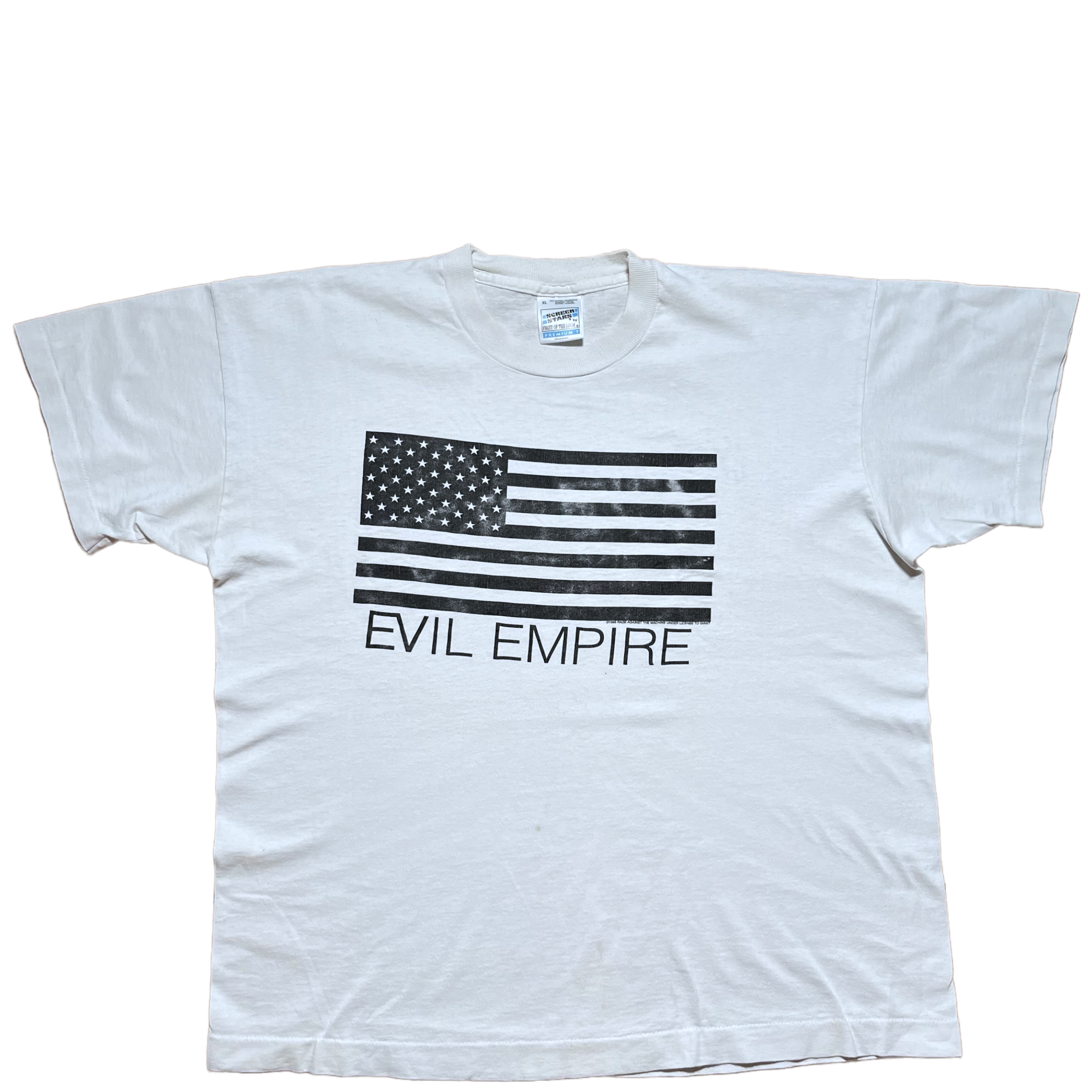 Rage Against The Machine t-shirt from their 1996 album Evil Empire. Rage Against The Machine copyright. Licensed to Giant. Screen Stars tag size XL. Fits boxy XL. Single stitch.