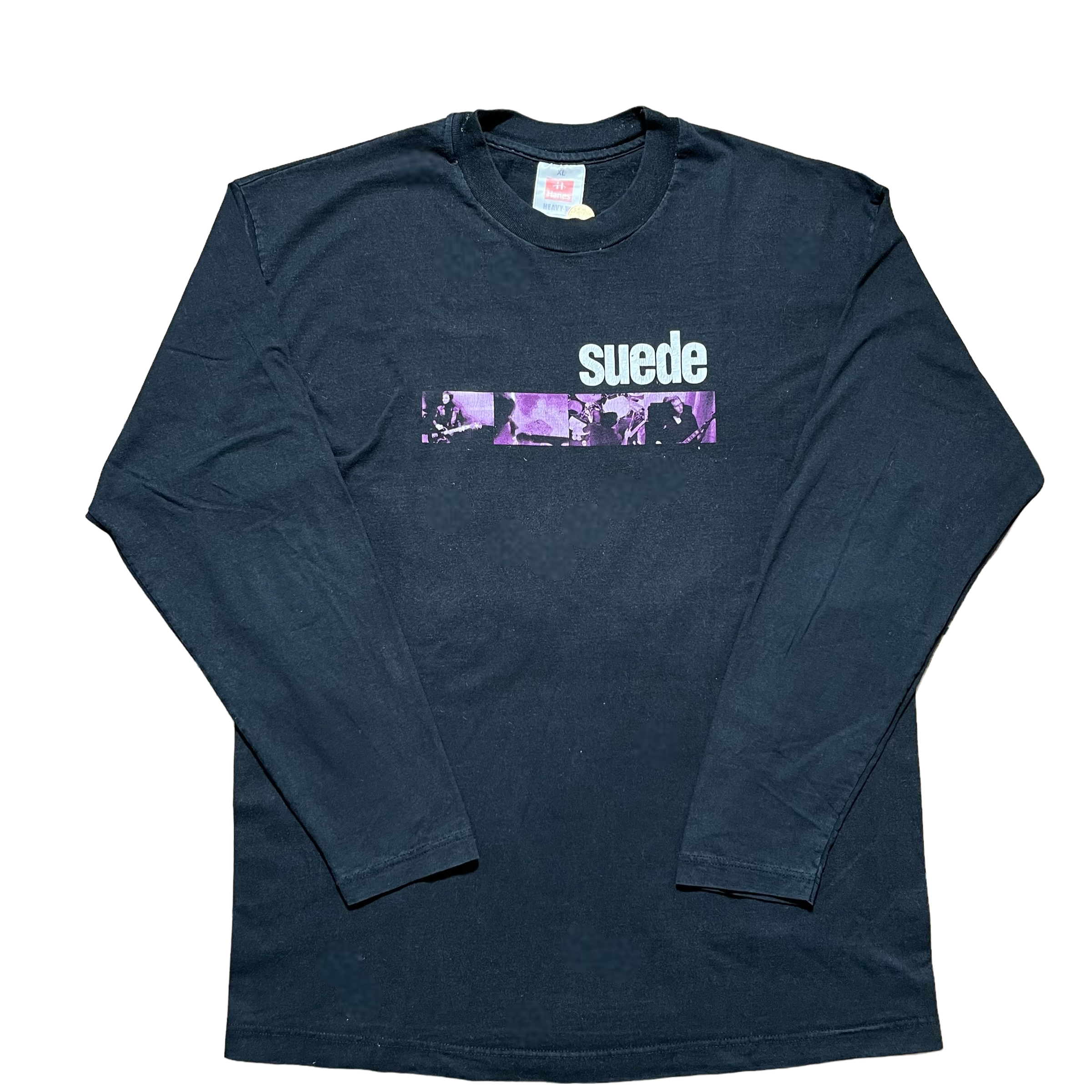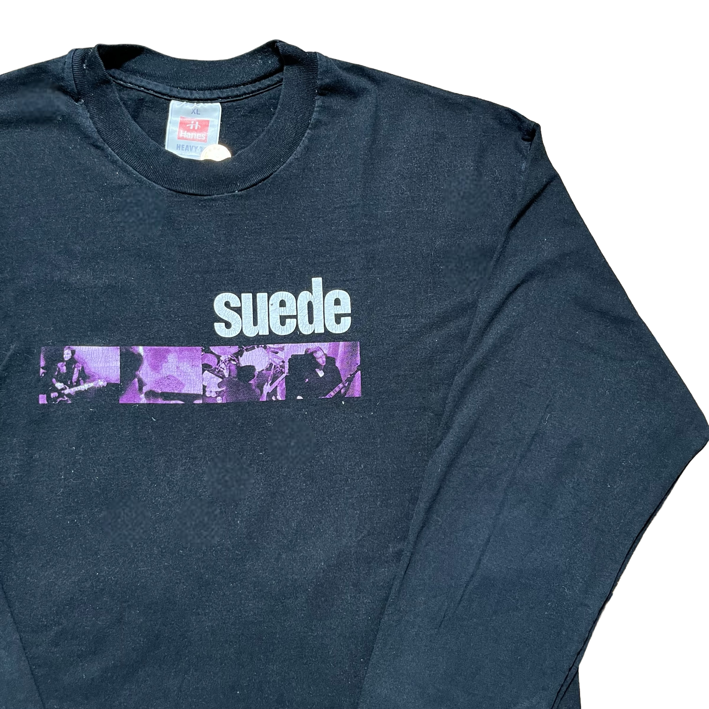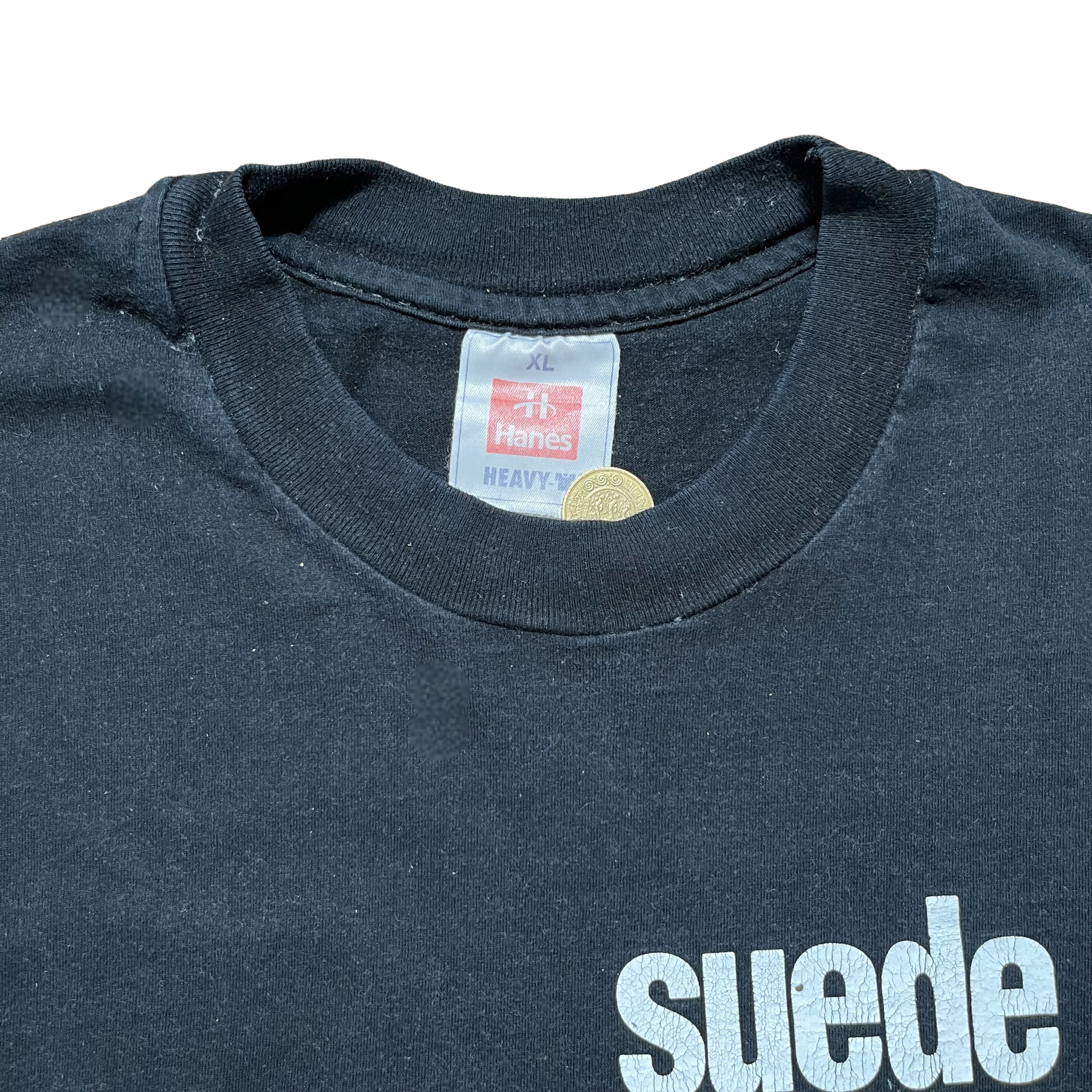 Suede t-shirt featuring artwork from their 1999 "Head Music European Tour". Tour dates on the back. Hanes tag size XL. Fits slighty slimmer XL.