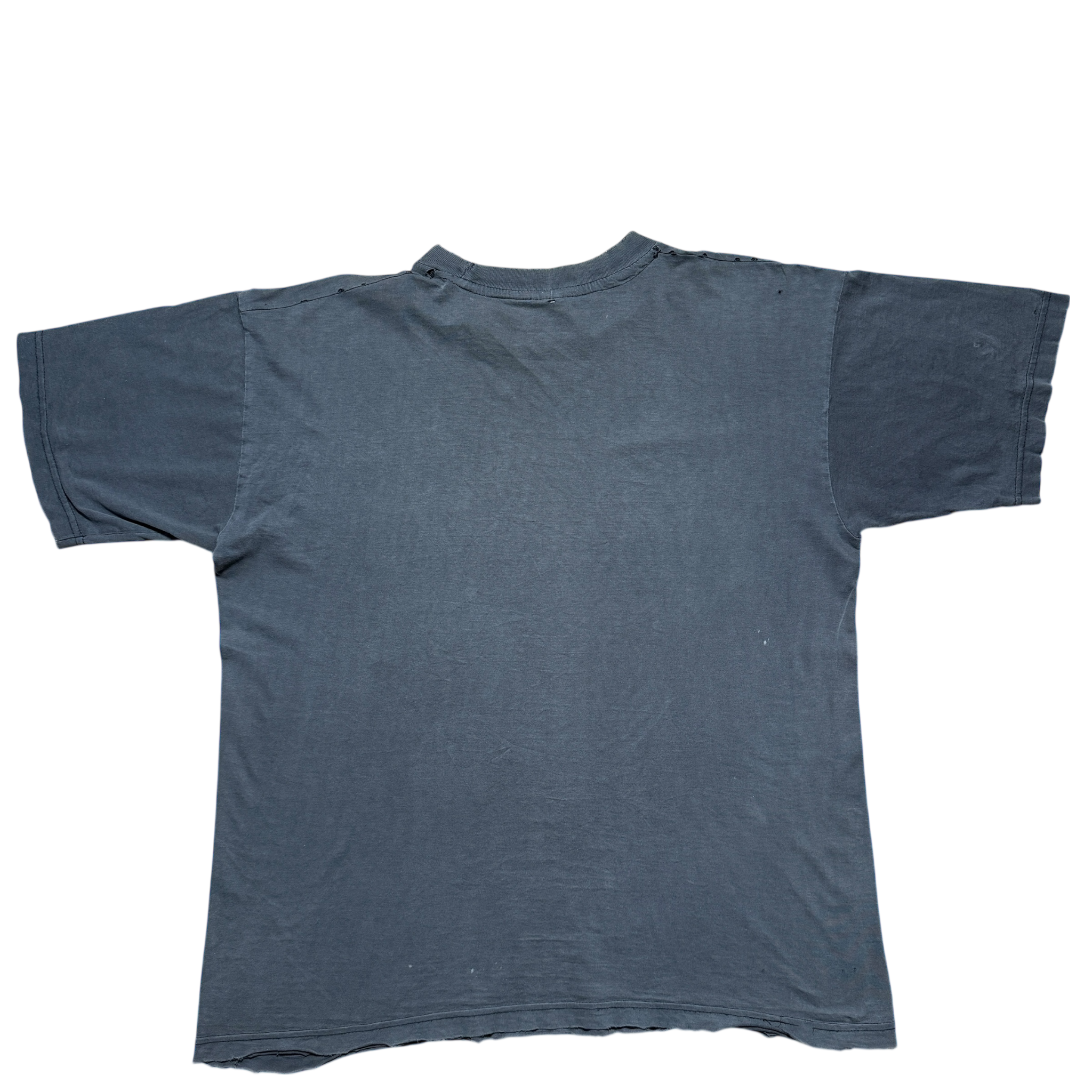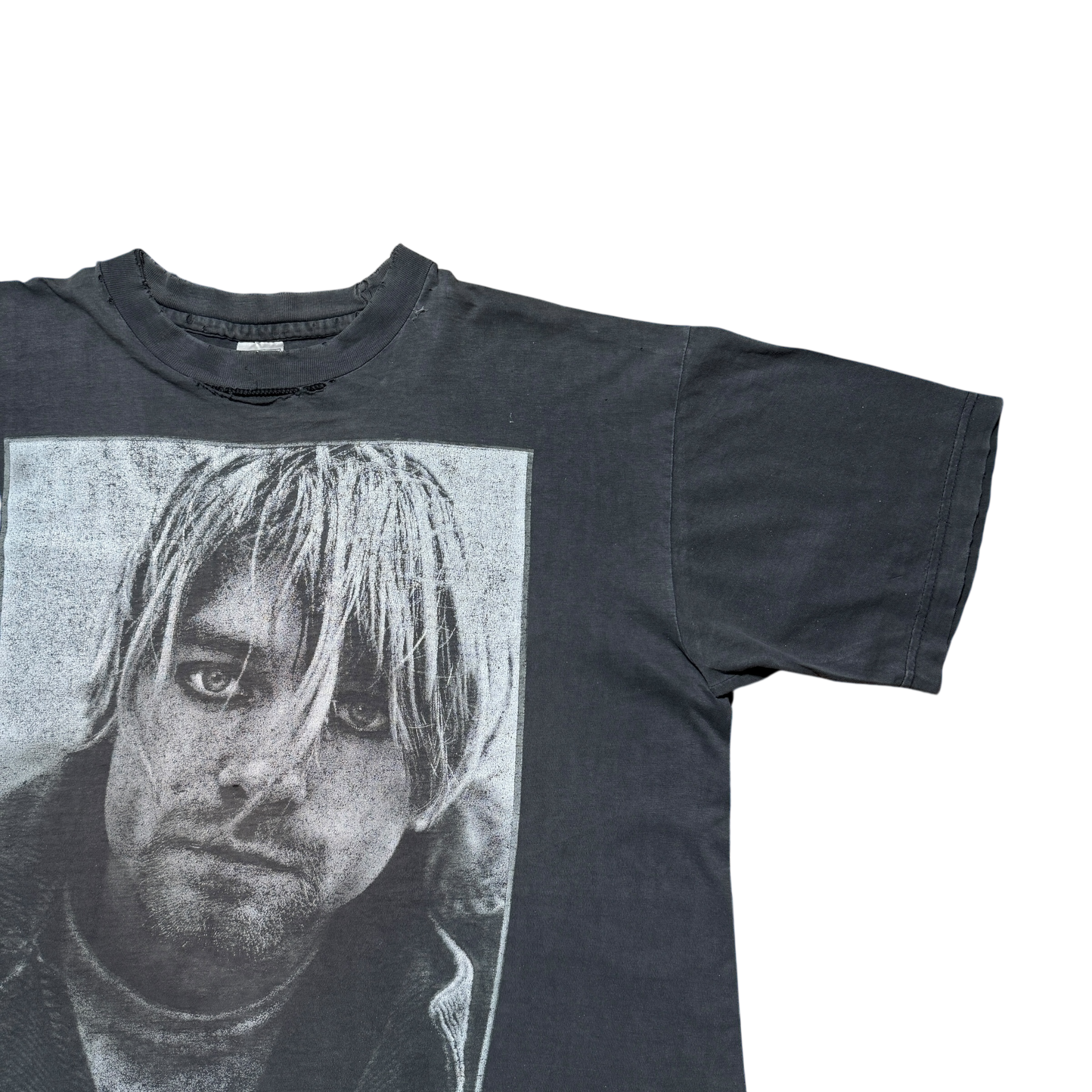 Kurt Cobain memorial t-shirt fra midt-90'erne - et af de mest eftertragtede stykker fan-merch, trykt kort efter Cobains død i 1994. Designet fanger essensen af perioden: det rå sort-hvide portræt, den spartanske typografi og den dybe melankoli, der omgav Nirvana og hele grungeæraens afslutning. 100% cotton-tag størrelse XL. Fitter XL.
