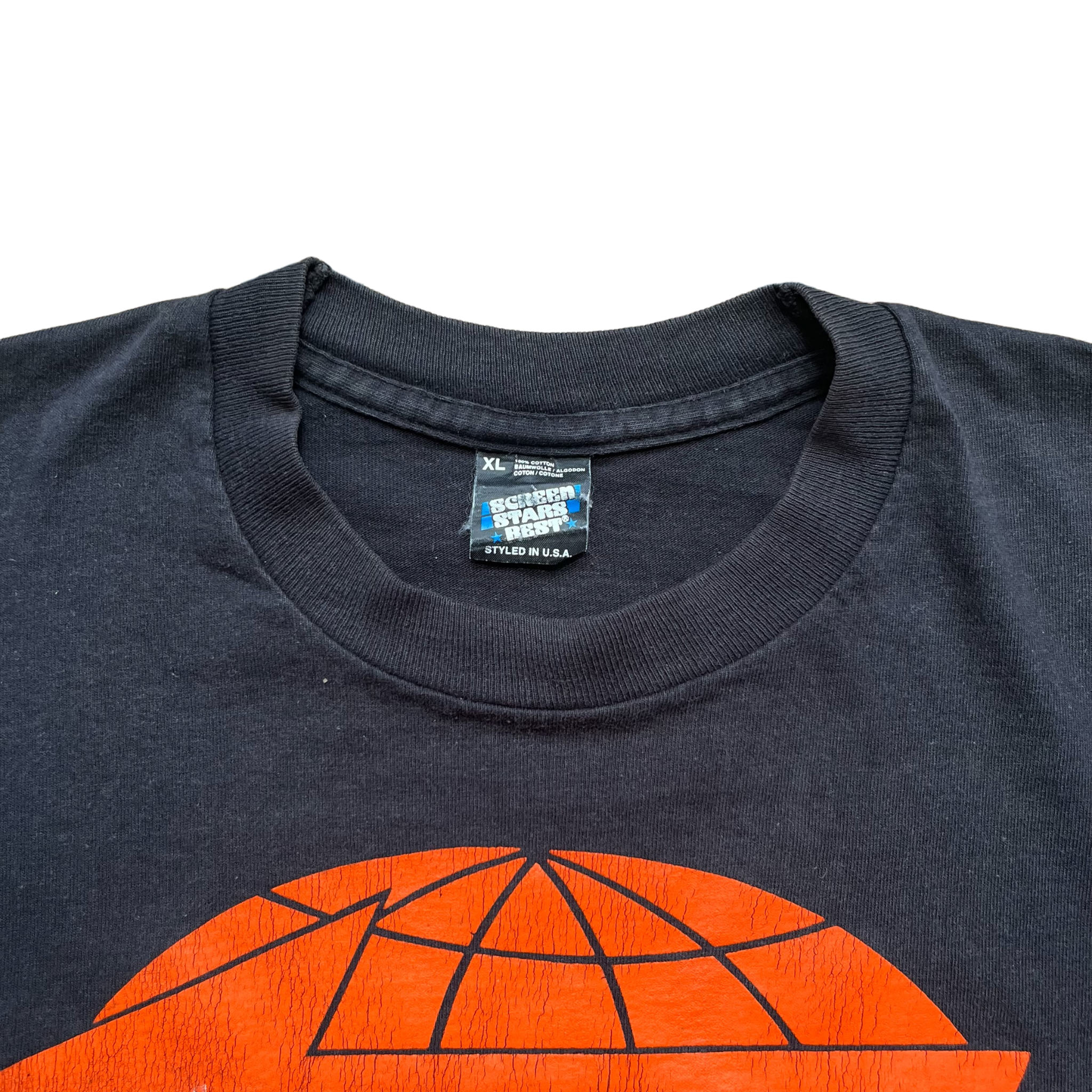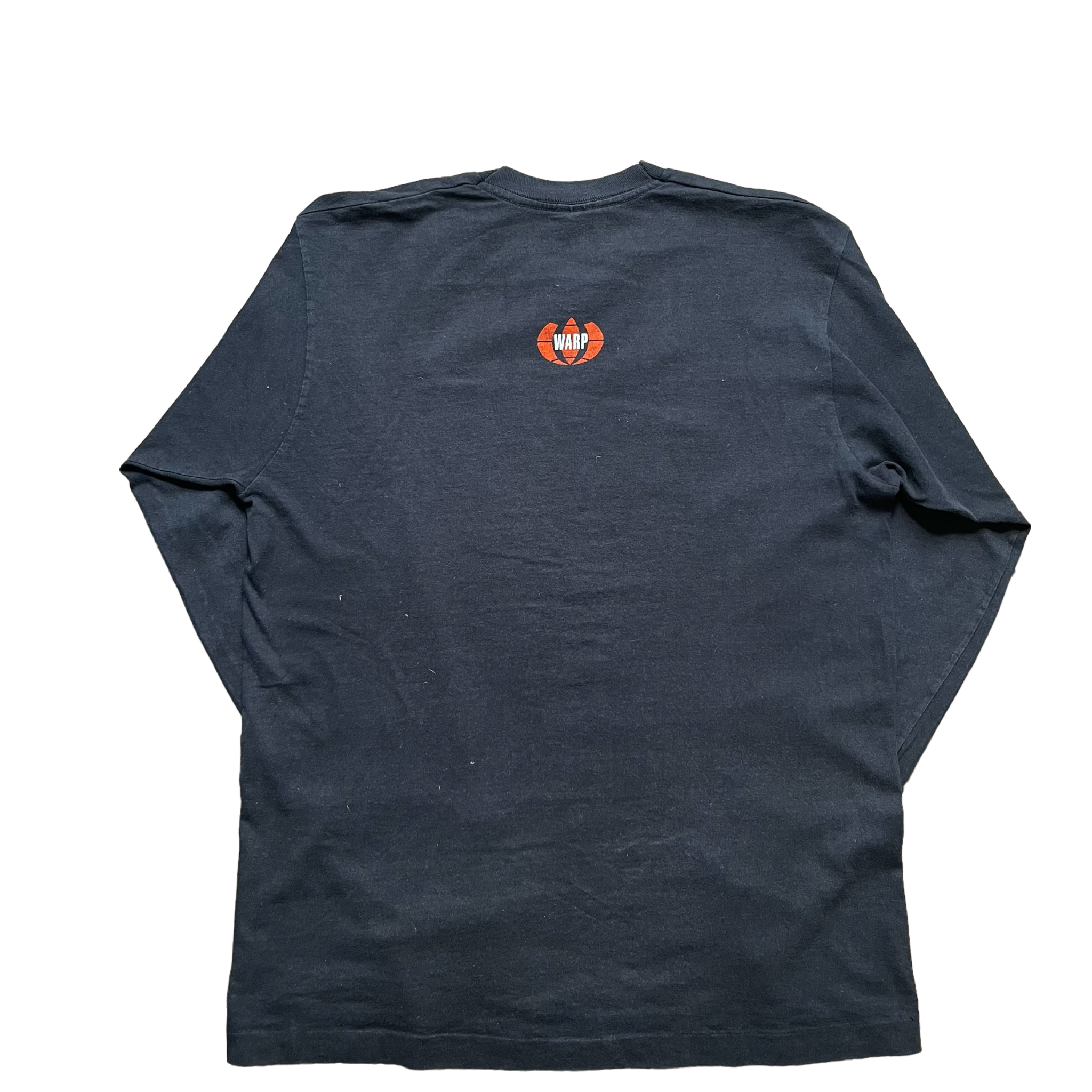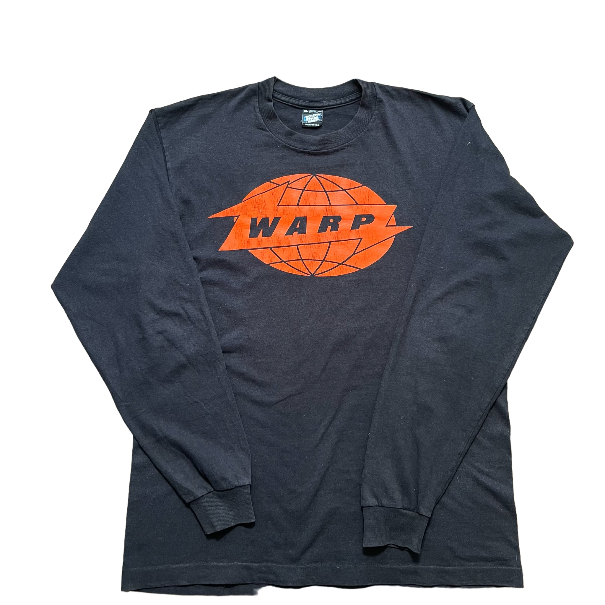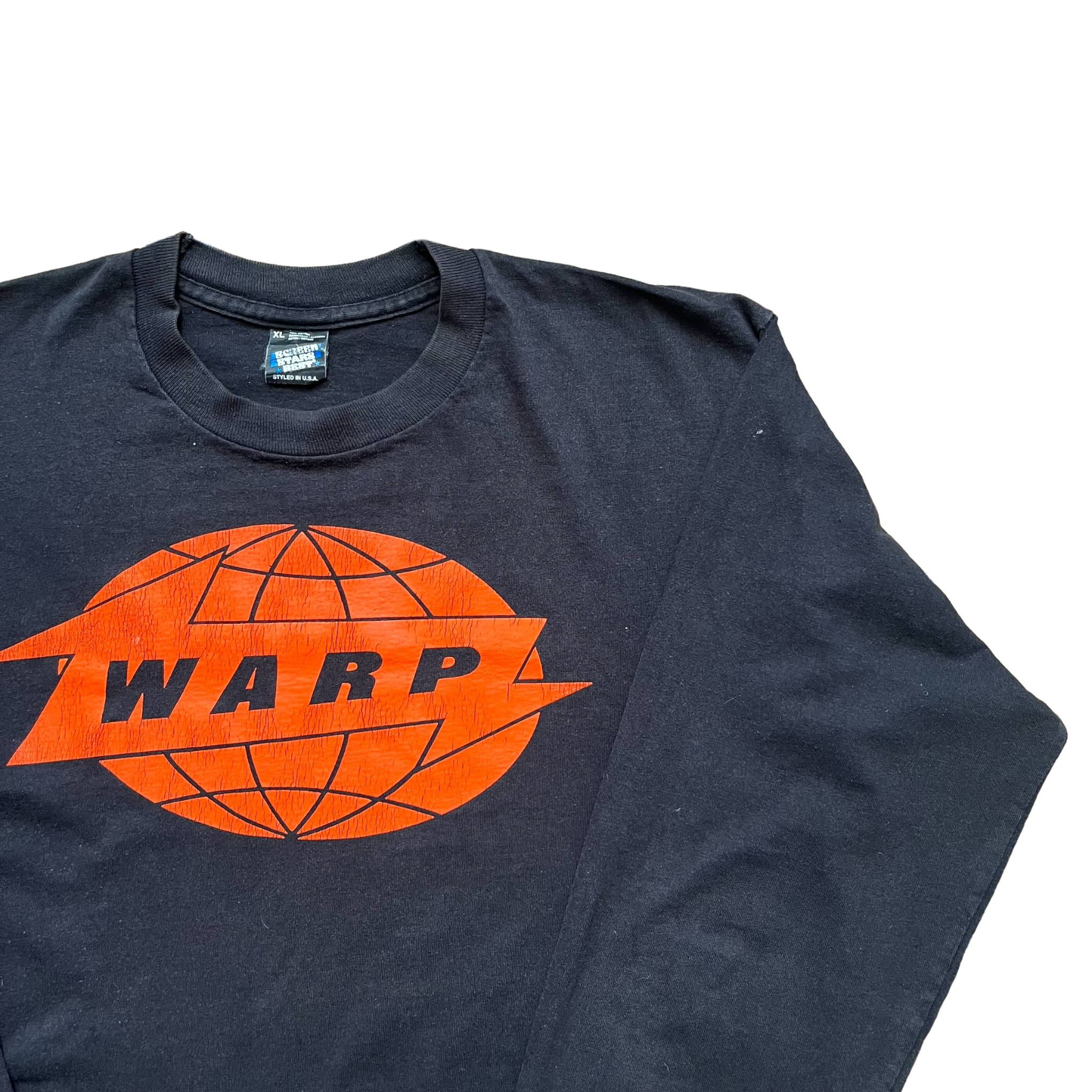 Super good Warp Records (Aphex Twin, Autecre...) long-sleeved t-shirt. Warp logo on the front and spellout logo on the back. Screen Stars tag size XL. Fits XL. Single stitch.