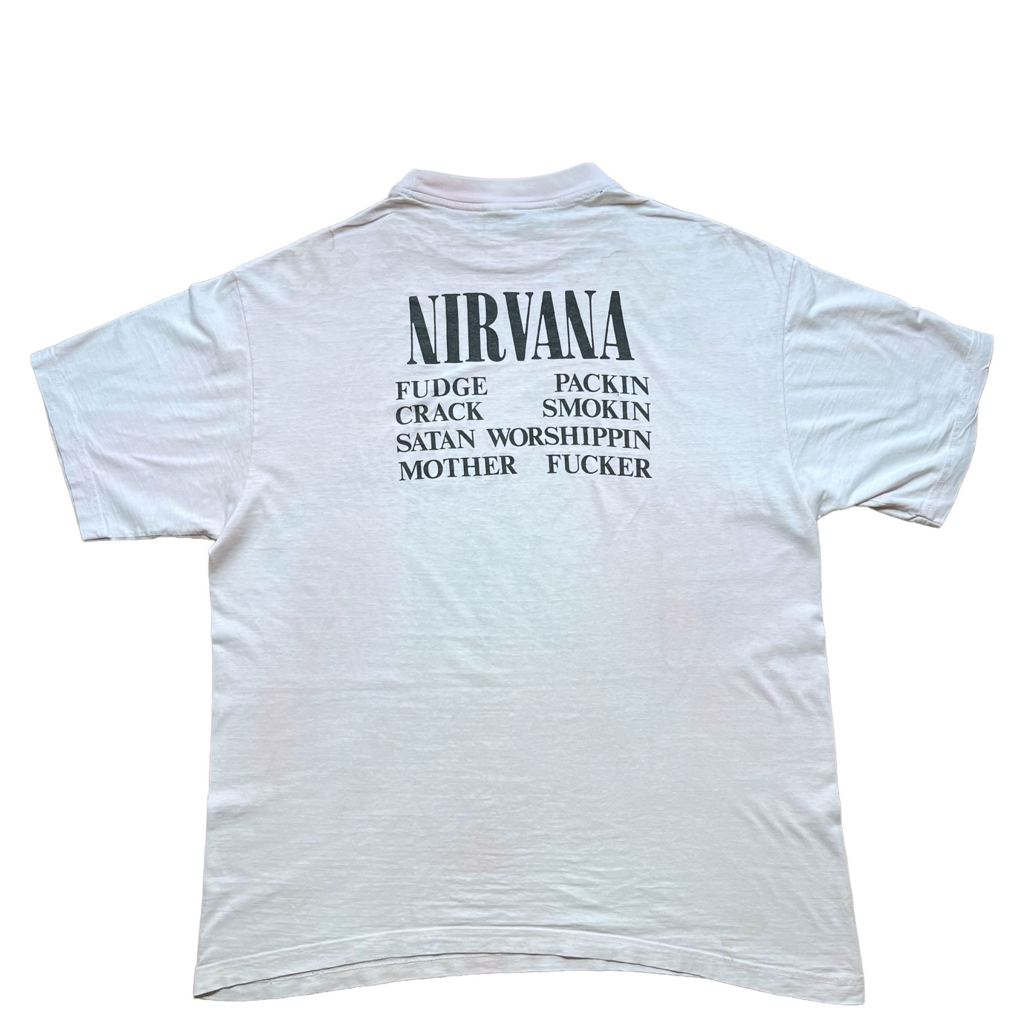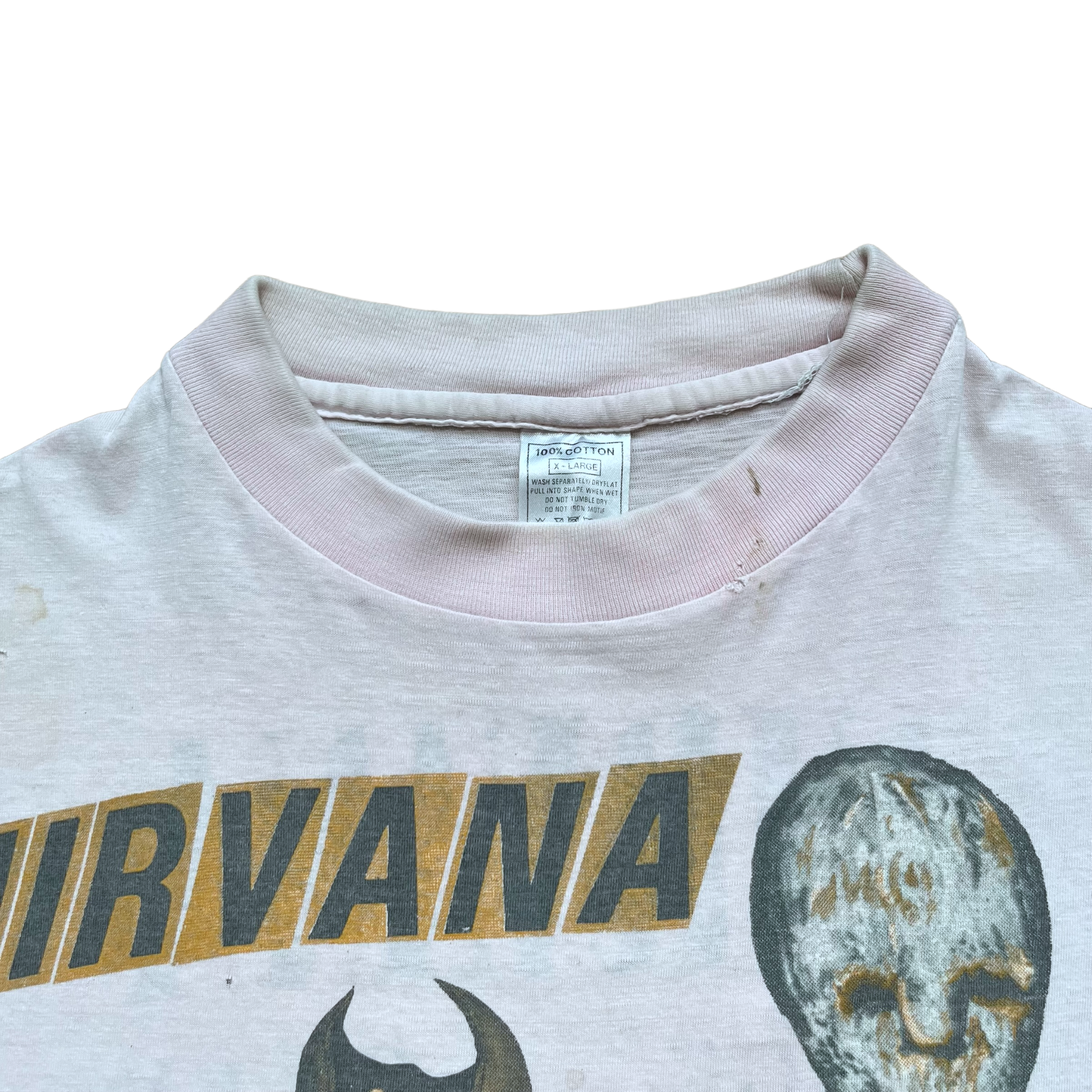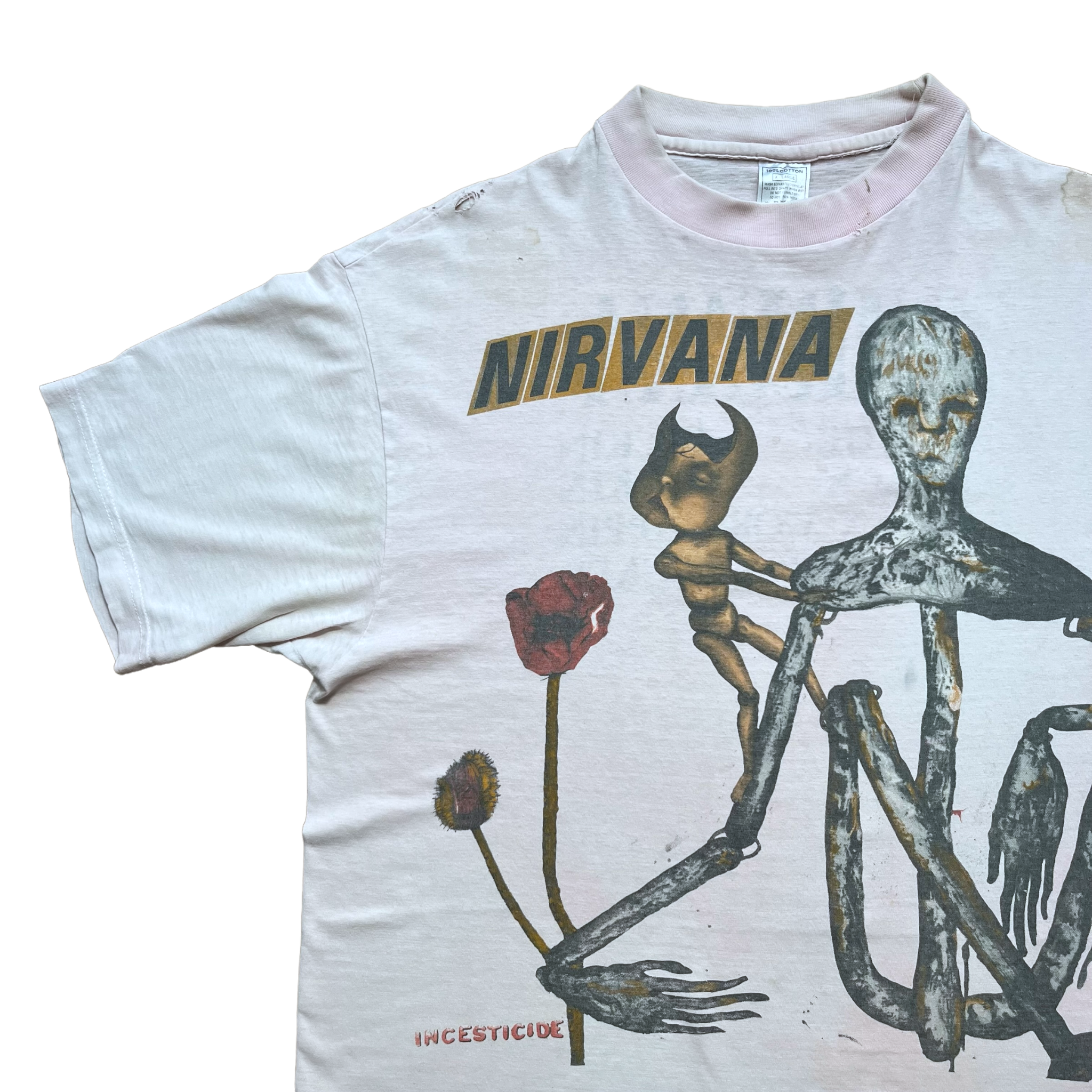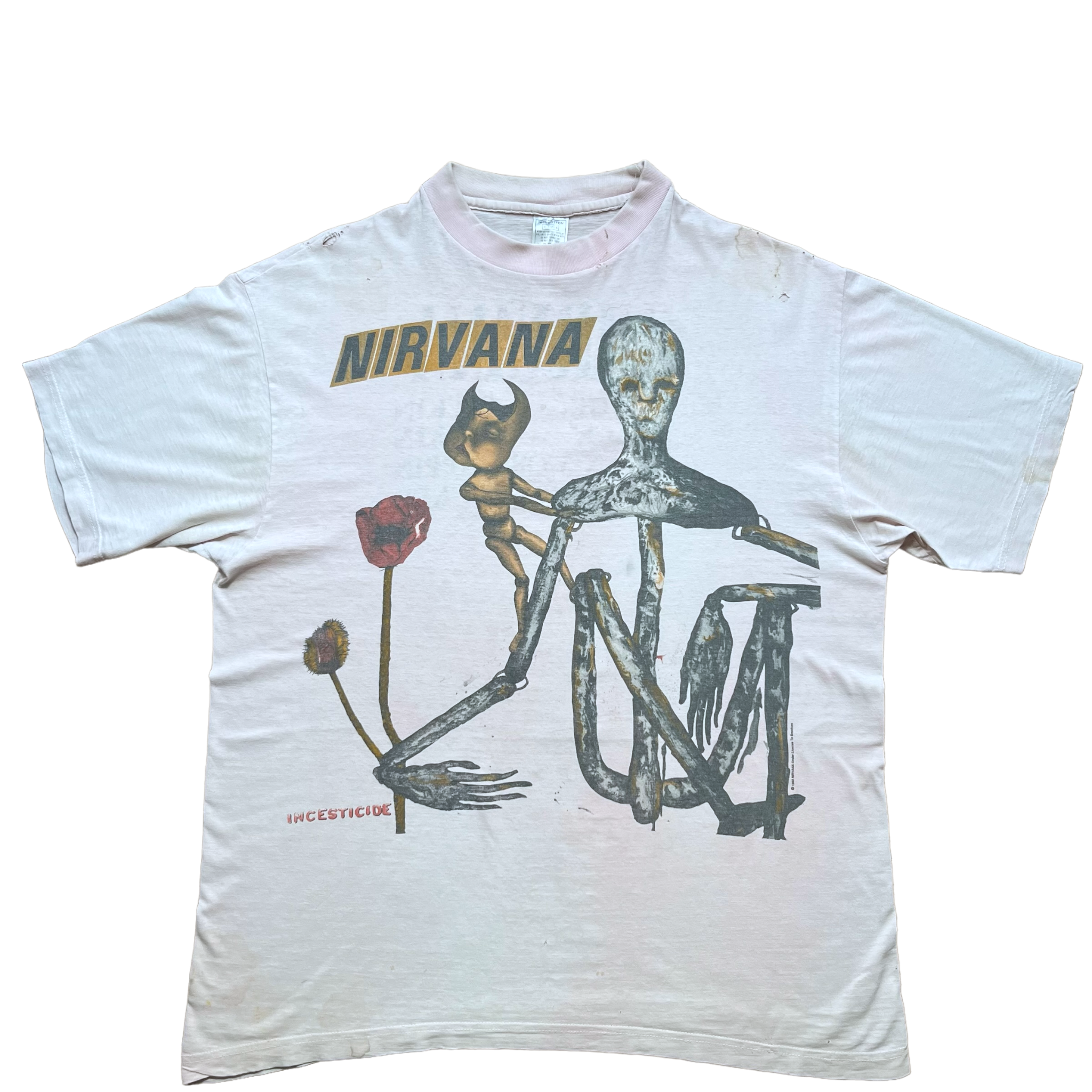 The super rare Nirvana Incesticide t-shirt in the white version. This one has a lot of character and has a pink-ish tone to it. Rare version with the Vestibule backprint on the back. Nirvana copyright. Euro box tag size XL. Fits XL.