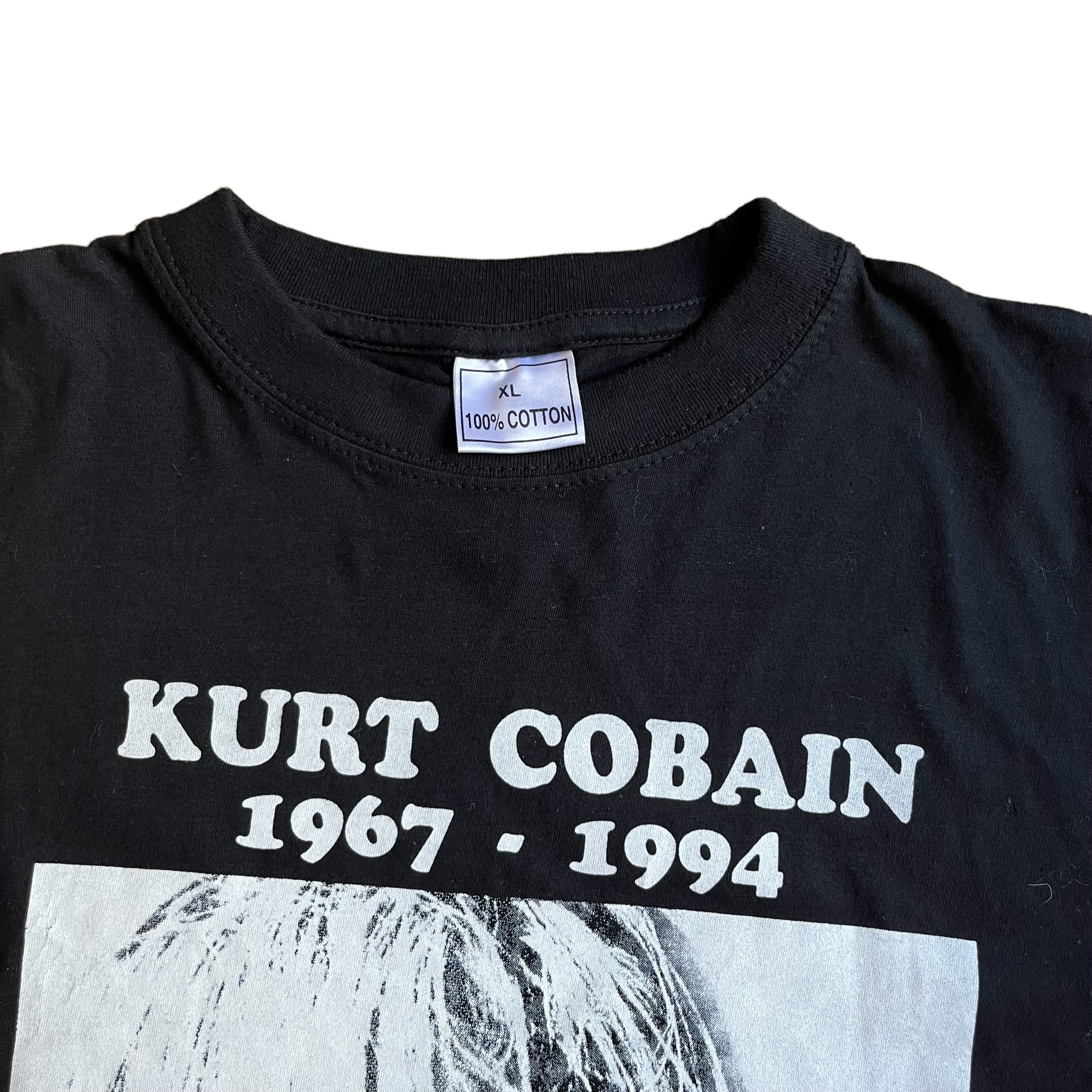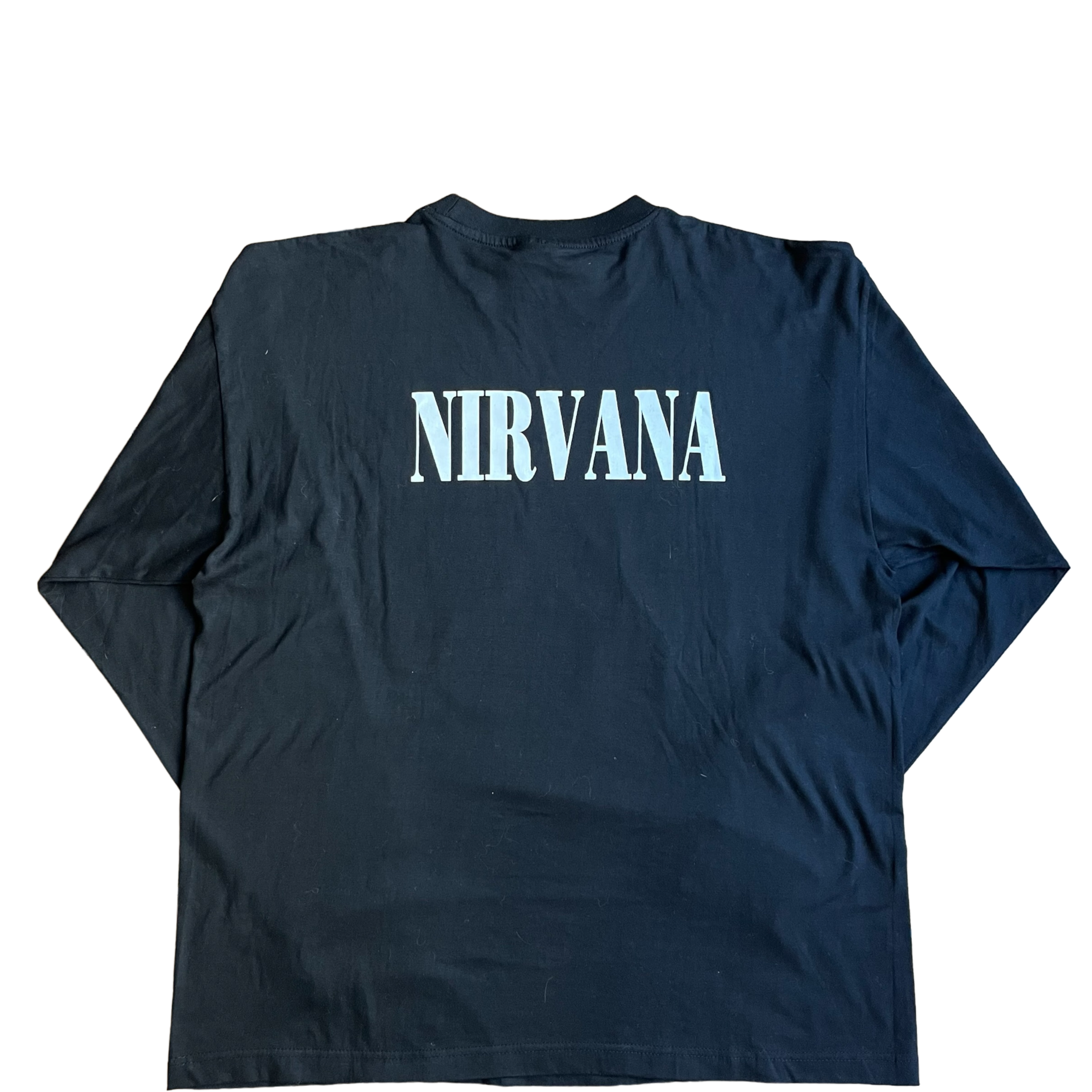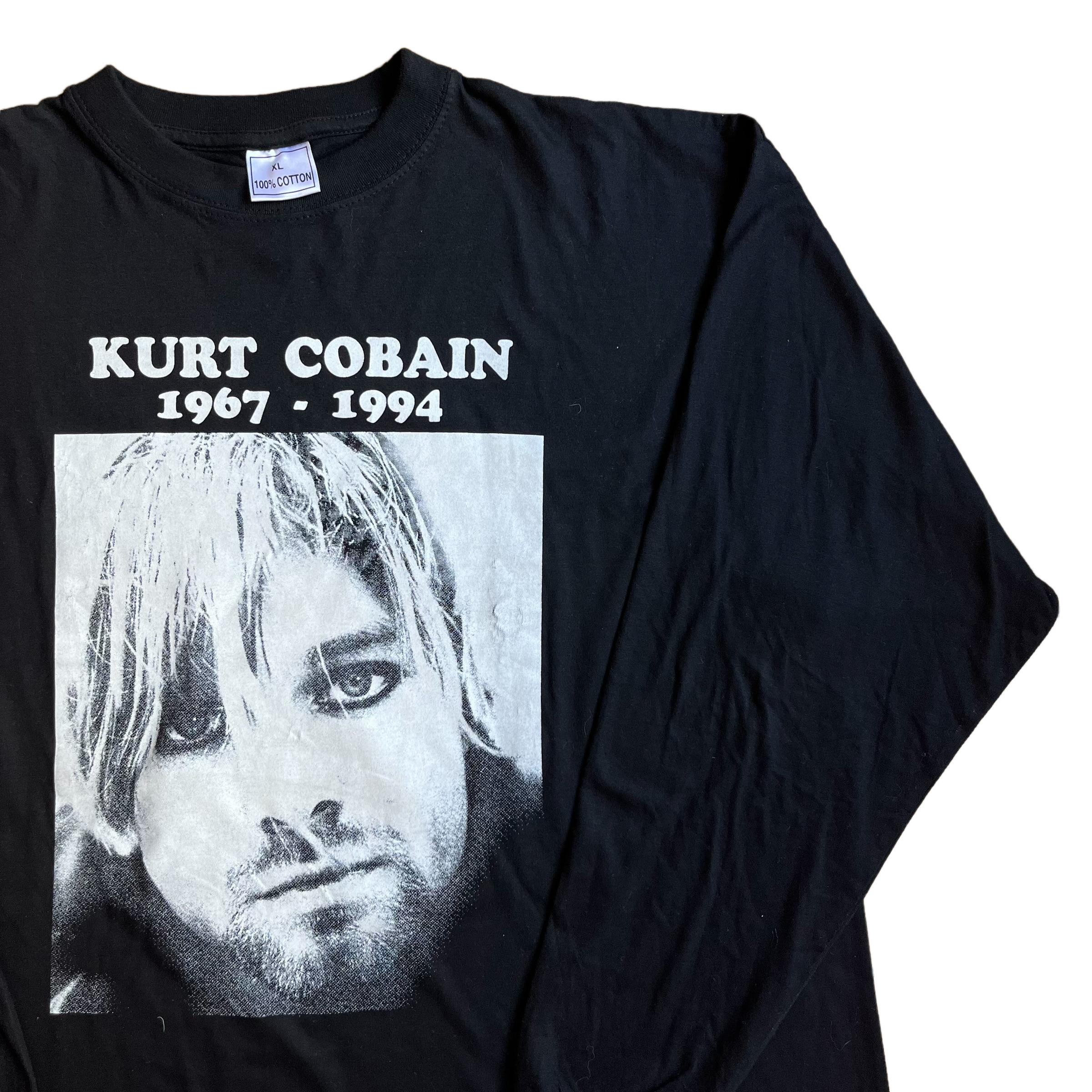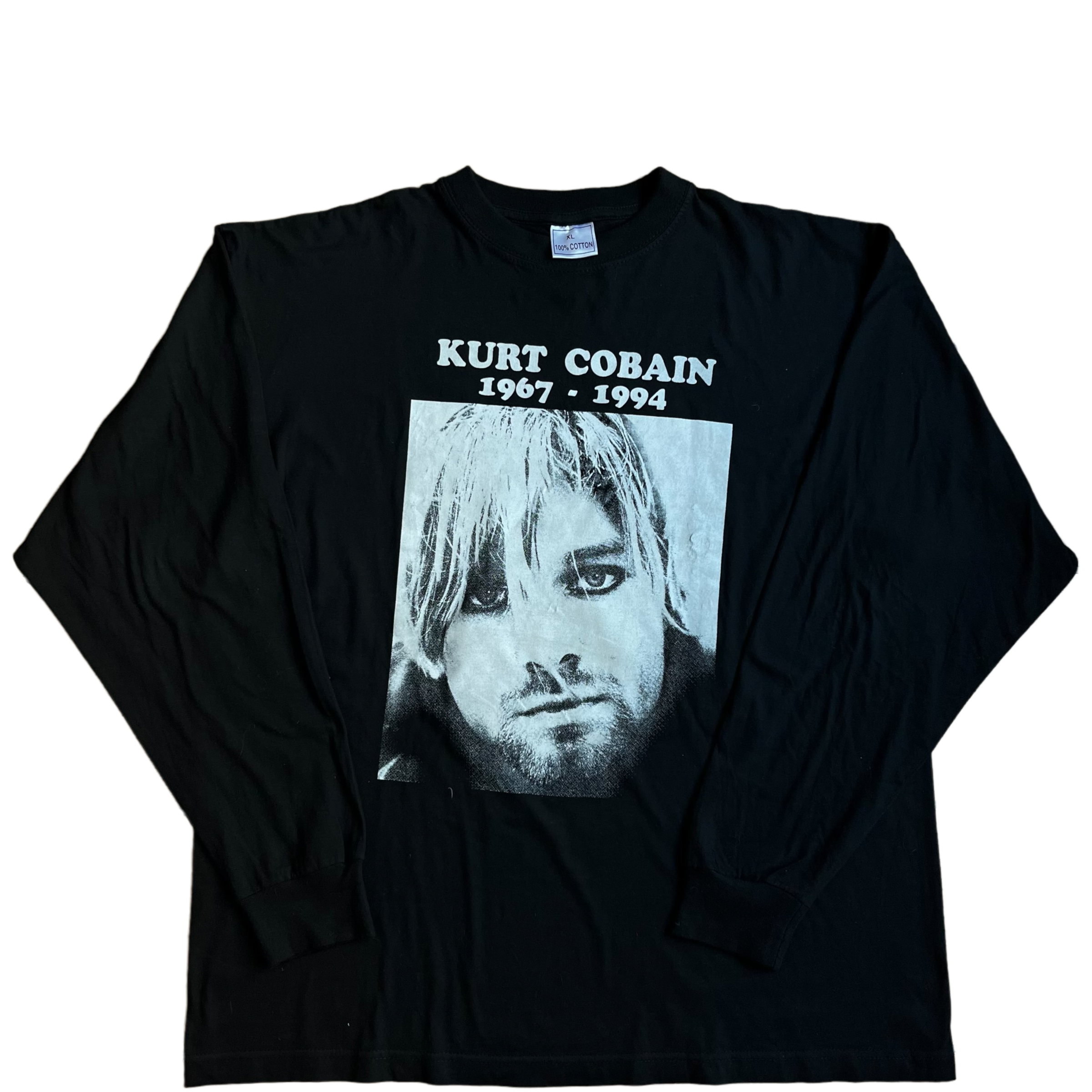 Long-sleeved Kurt Cobain memorial t-shirt with Nirvana spellout logo on the back. 100% Cotton tag size XL. Fits XL.