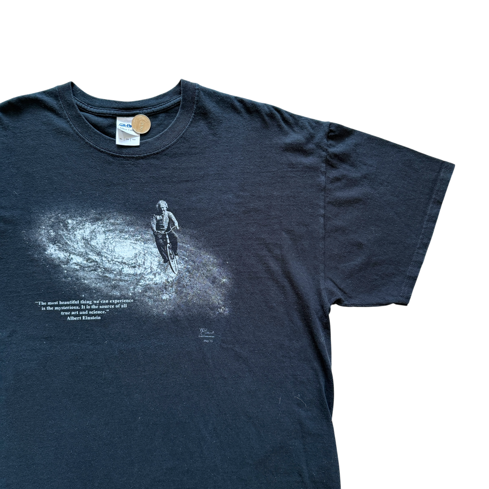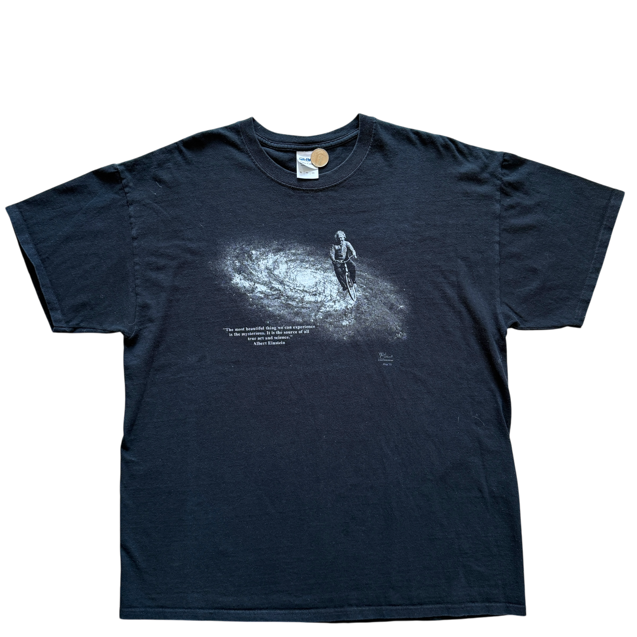 Albert Einstein t-shirt med citatet “The most beautiful thing we can experience is the mysterious” – en hyldest til videnskabens og nysgerrighedens pioner. Gildan tag størrelse XL. Fitter XL.