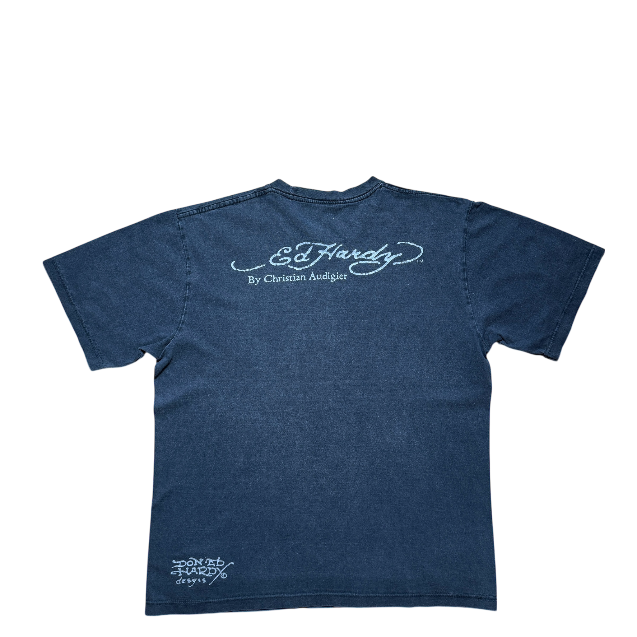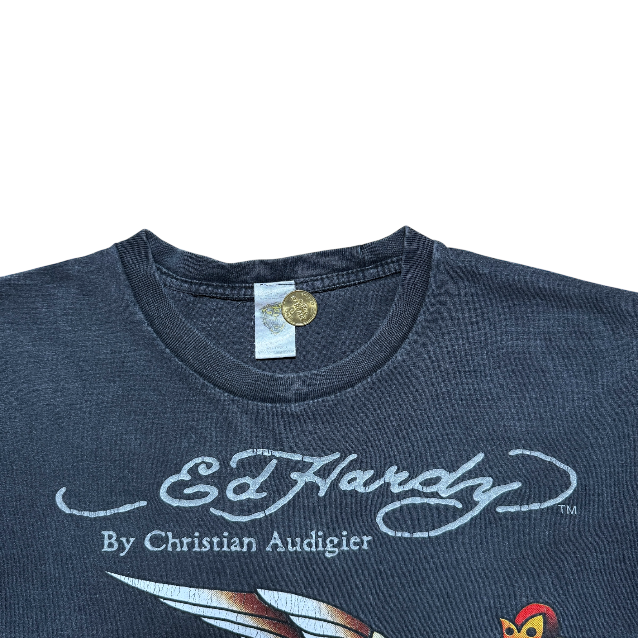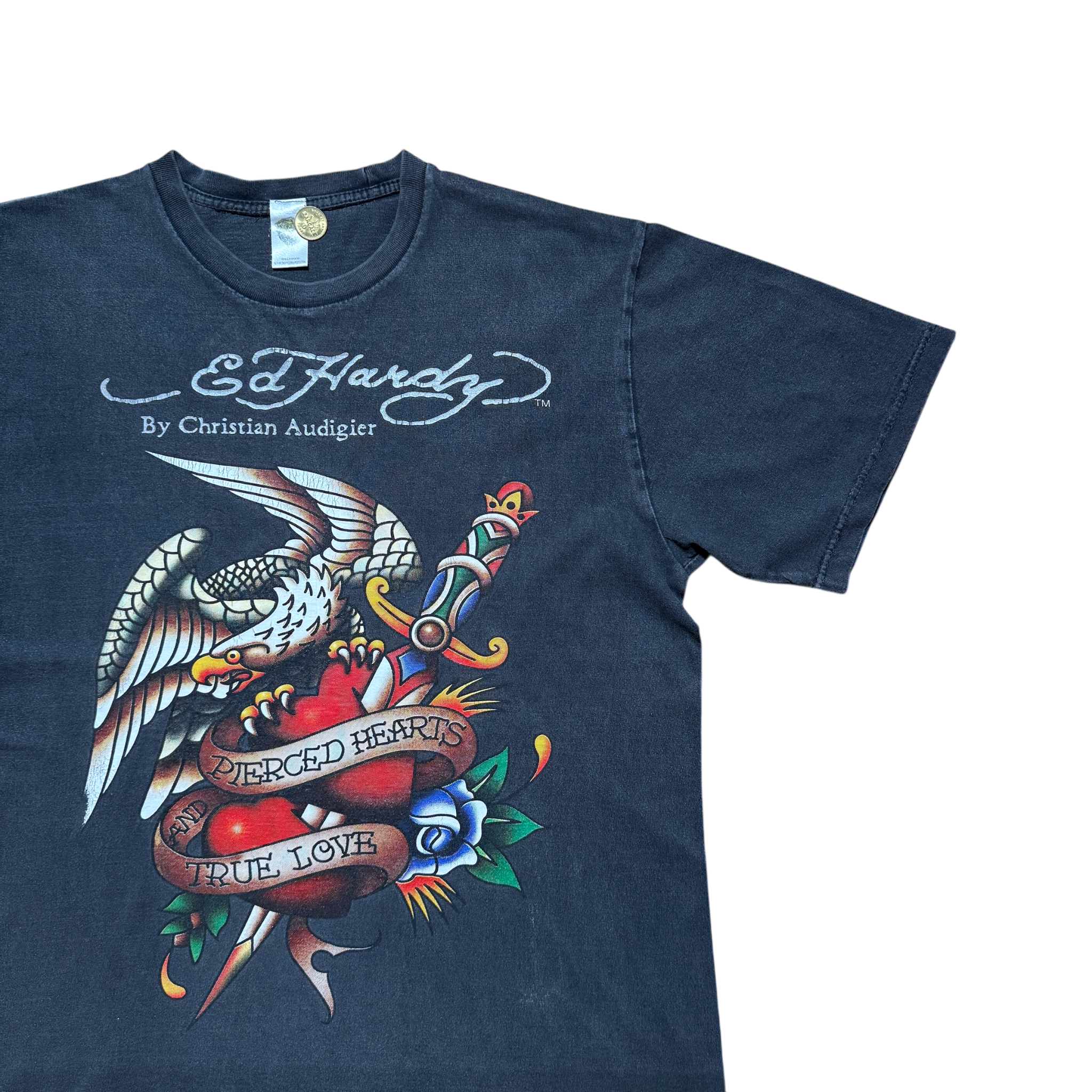 Ed Hardy blev et ikonisk symbol på midt-2000'ernes modebillede, hvor Christian Audigier bragte Don Ed Hardys klassiske tattootradsion ud i popkulturen. Denne tee bærer den karakteristiske old school tattoo-æstetik med ørn, dolk og hjertemotiv – et af de mest genkendelige udtryk fra brandets storhedstid. Ed Hardy tag størrelse XL. Fitter large. Perfekt fade.