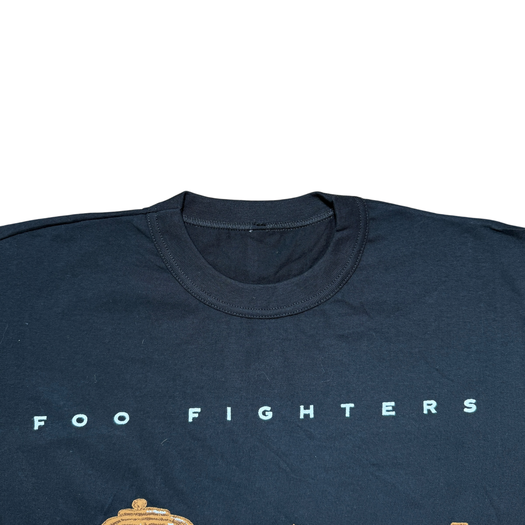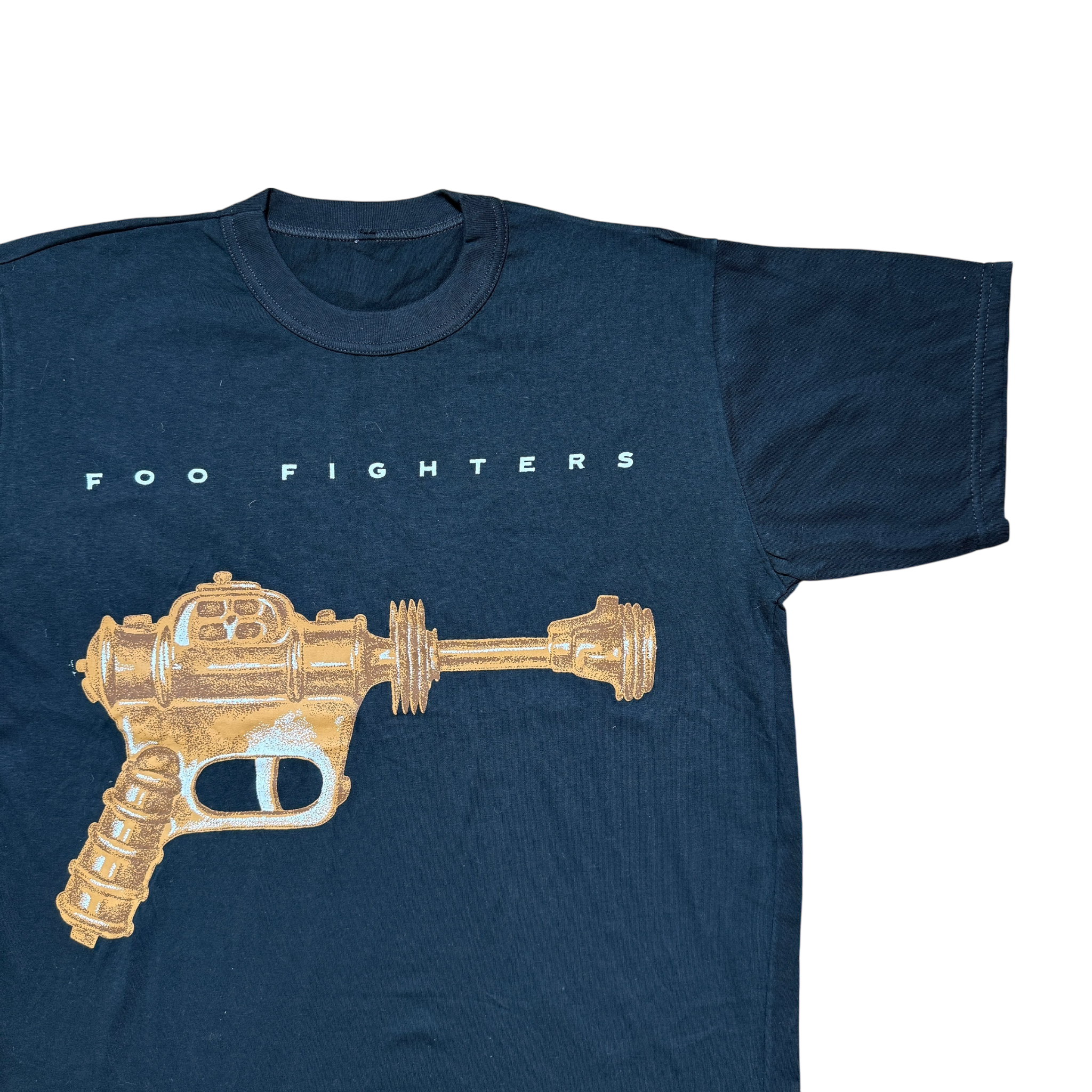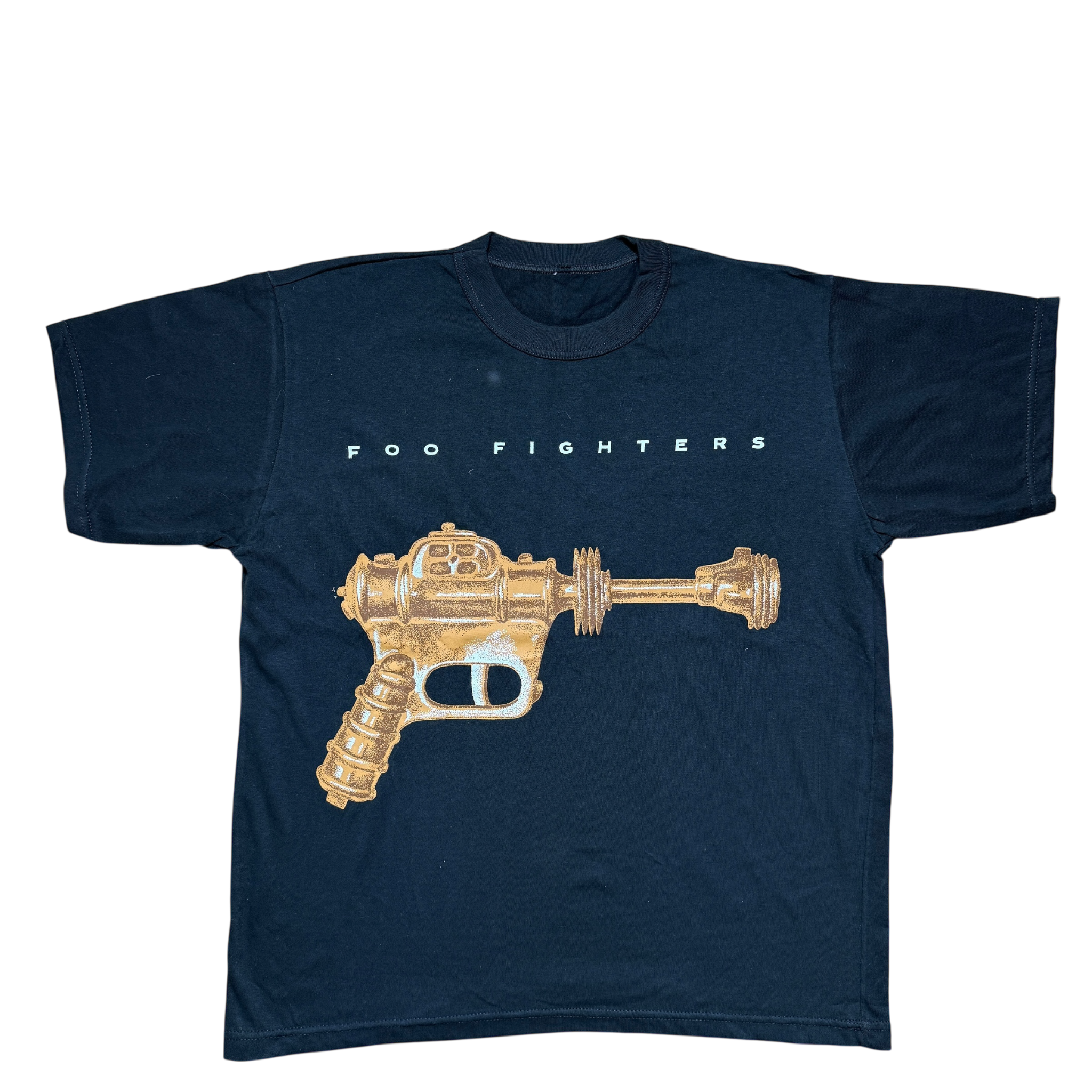 Sort Foo Fighters t-shirt fra 00’erne med stor, detaljeret raygun-grafik på fronten – et motiv hentet fra bandets selvbetitlede debutalbum fra 1995, hvor det prydede både cover og merch. Tag cut off. Fitter Large.