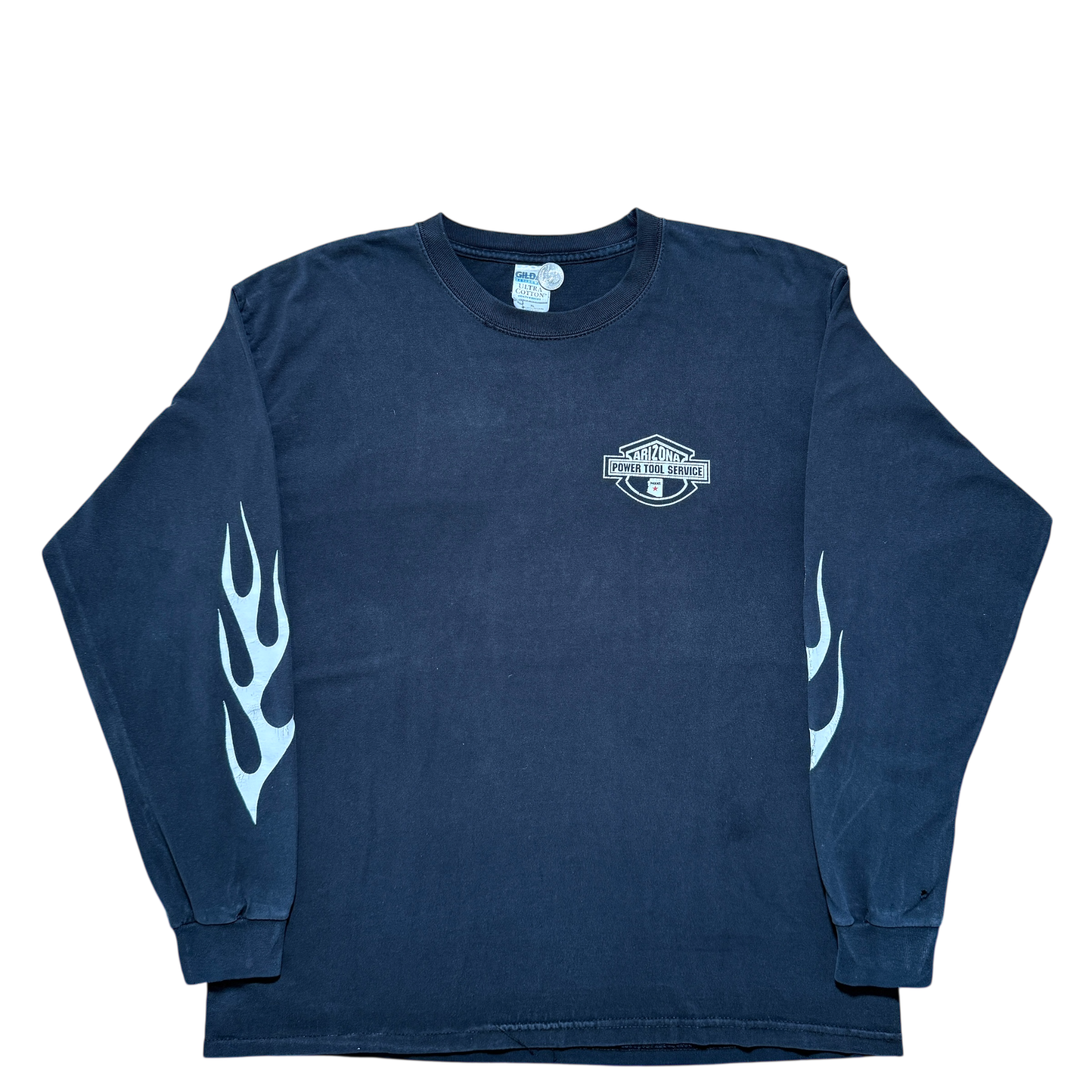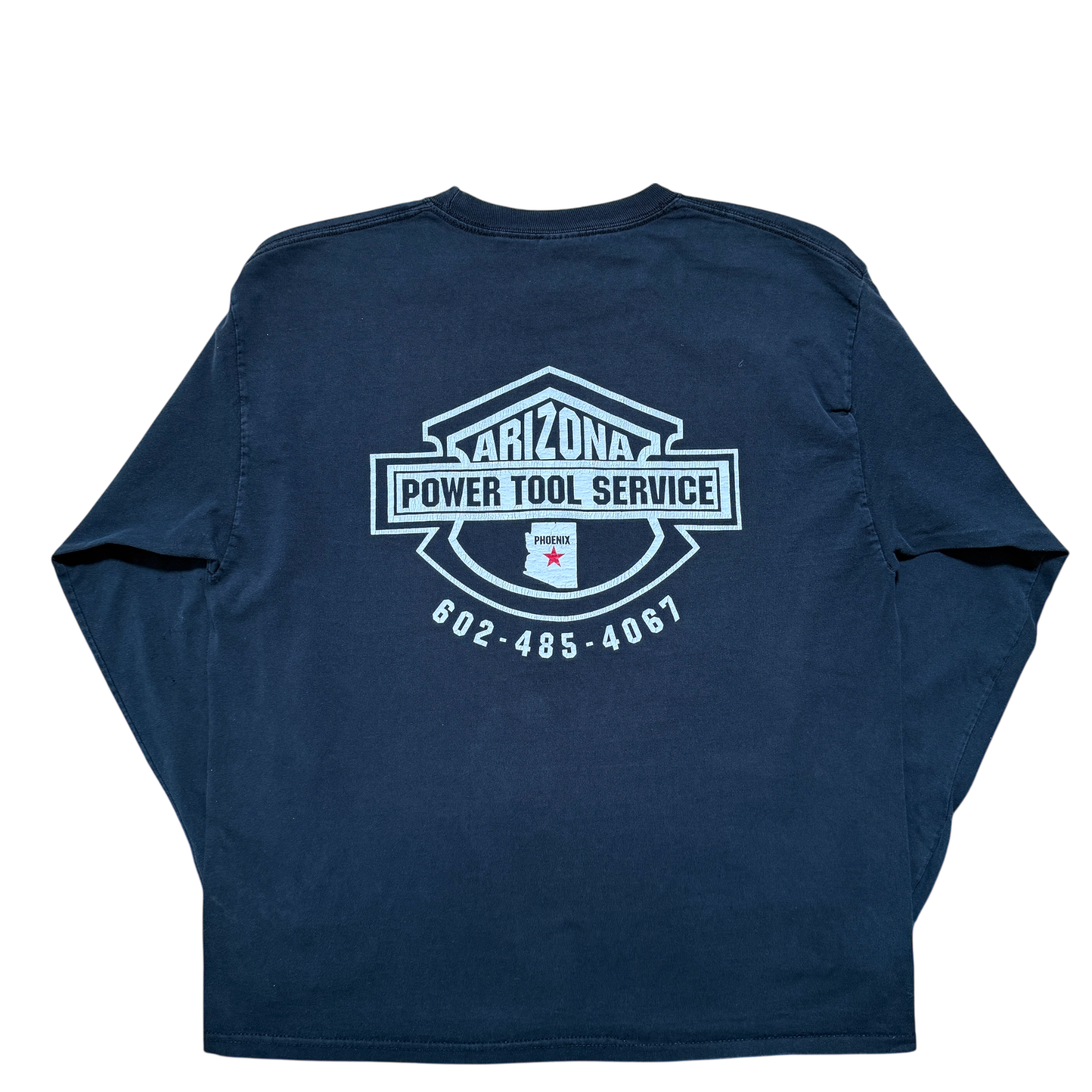 Longsleeve t-shirt fra 00’erne med “Arizona Power Tool Service” backprint – et klassisk dealer piece med lokal edge og tung biker-energi. Frontprint med ørn og logo, som det skal være. Fitter XL.