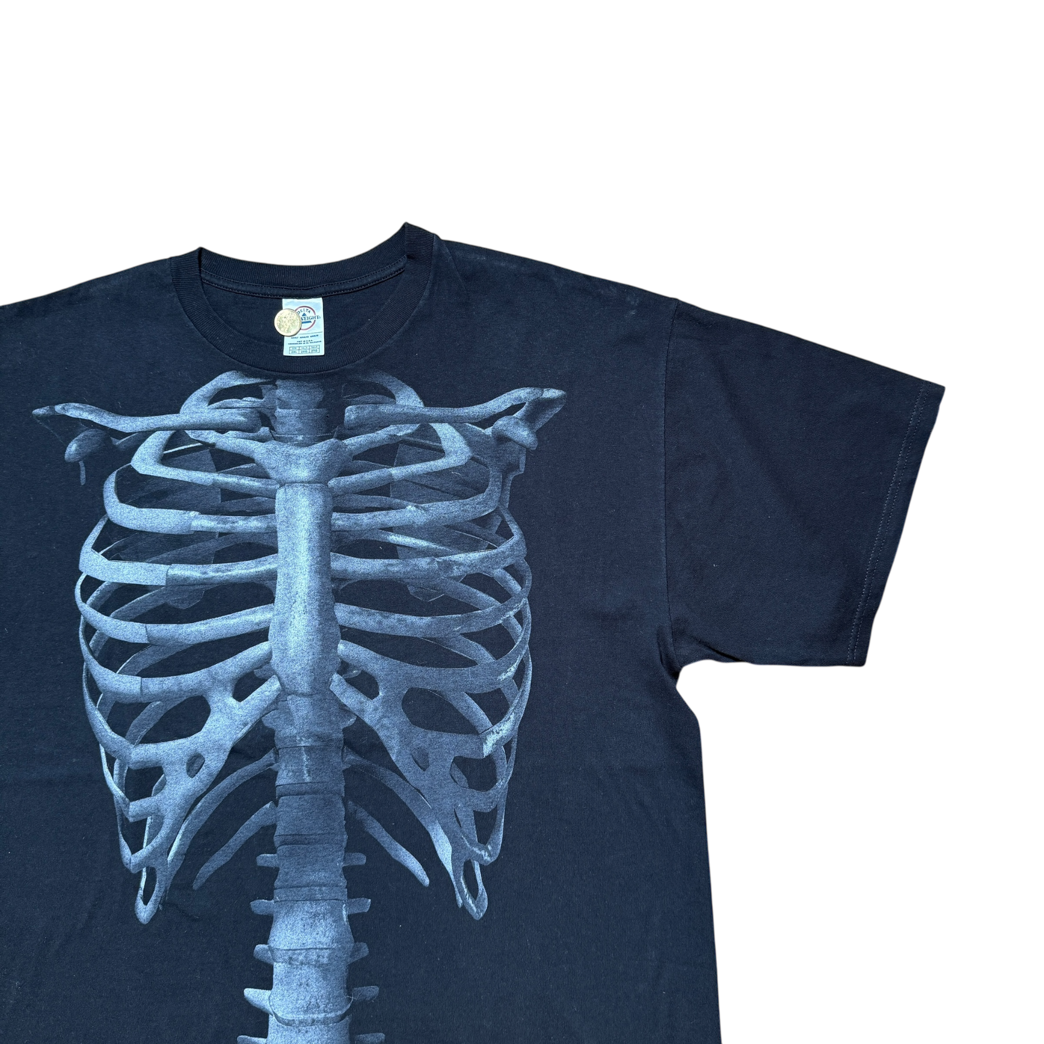 Sort t-shirt med et stort, hyper-realistisk ribbensmotiv på fronten, der giver en markant røntgenlignende effekt. Et dristigt, anatomisk design, der skiller sig ud med sit minimalistiske udtryk og visuelle slagkraft. Delta tag størrelse XXL – fitter XXL.