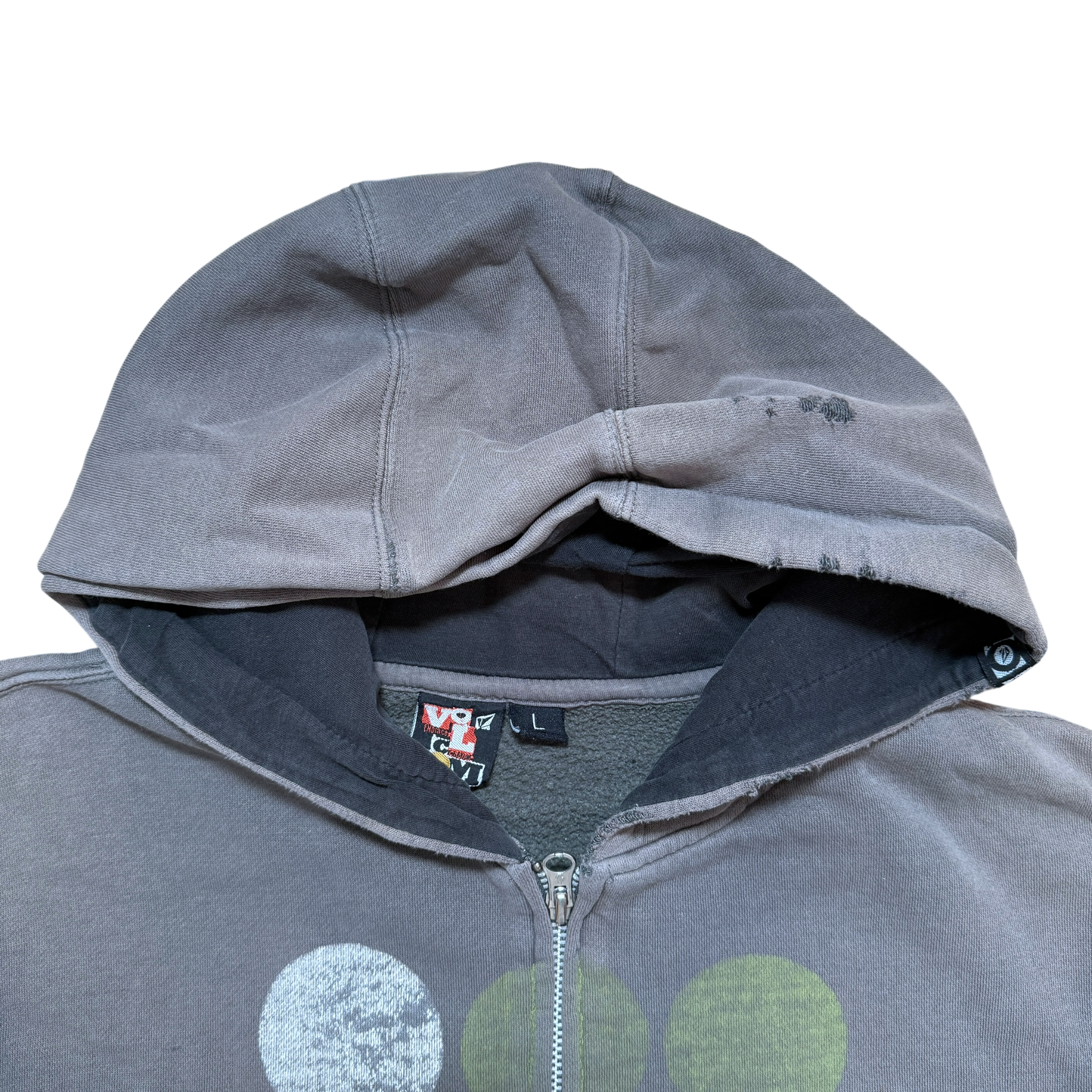 Volcom zip hoodie med klassisk frontprint og den karakteristiske skatewear-patina fra brug. Let slitage ved manchetter og en afslappet pasform. Volcom tag størrelse L. Fitter Large.