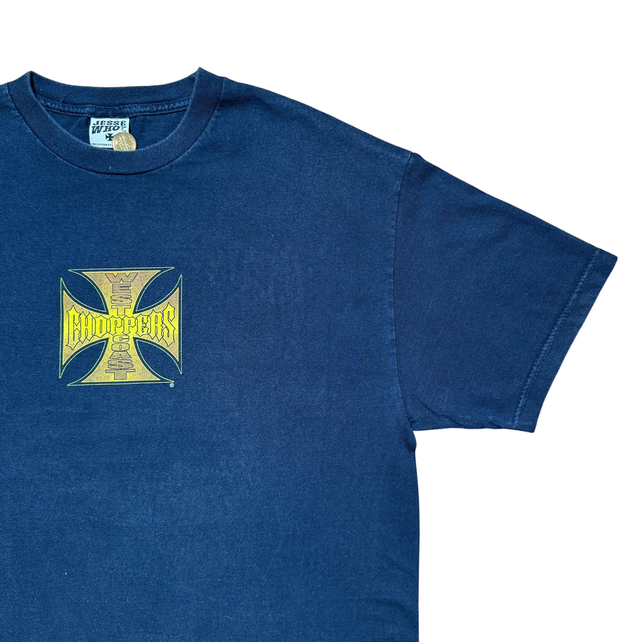 West Coast Choppers-merch med det klassiske logo på brystet og et farverigt, detaljeret hot rod-print på ryggen. T-shirten fanger den ikoniske Long Beach lowrider- og custom bike-kultur, som Jesse James og West Coast Choppers var med til at definere i 00’erne. West Coast Choppers-tag størrelse XL. Fitter XL.