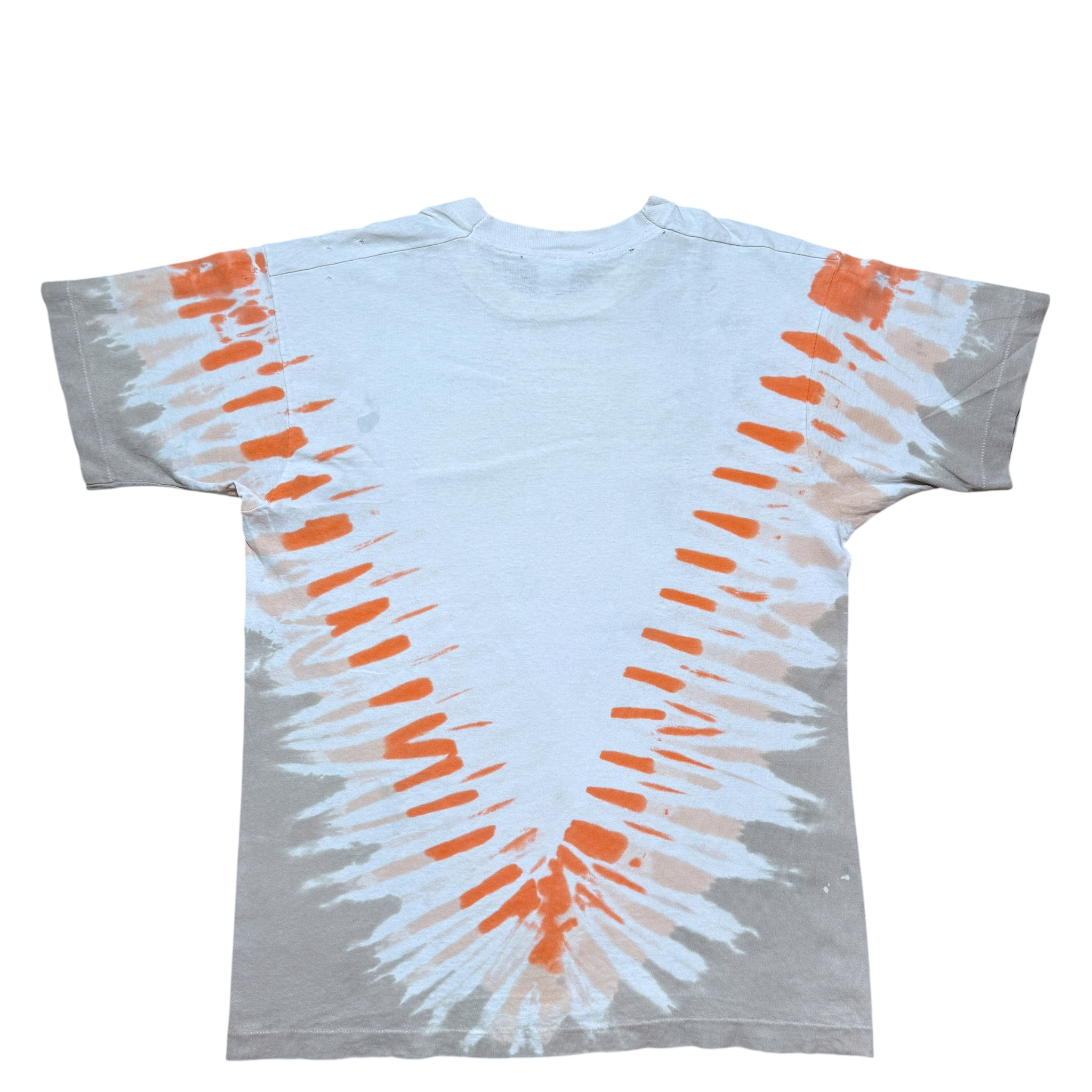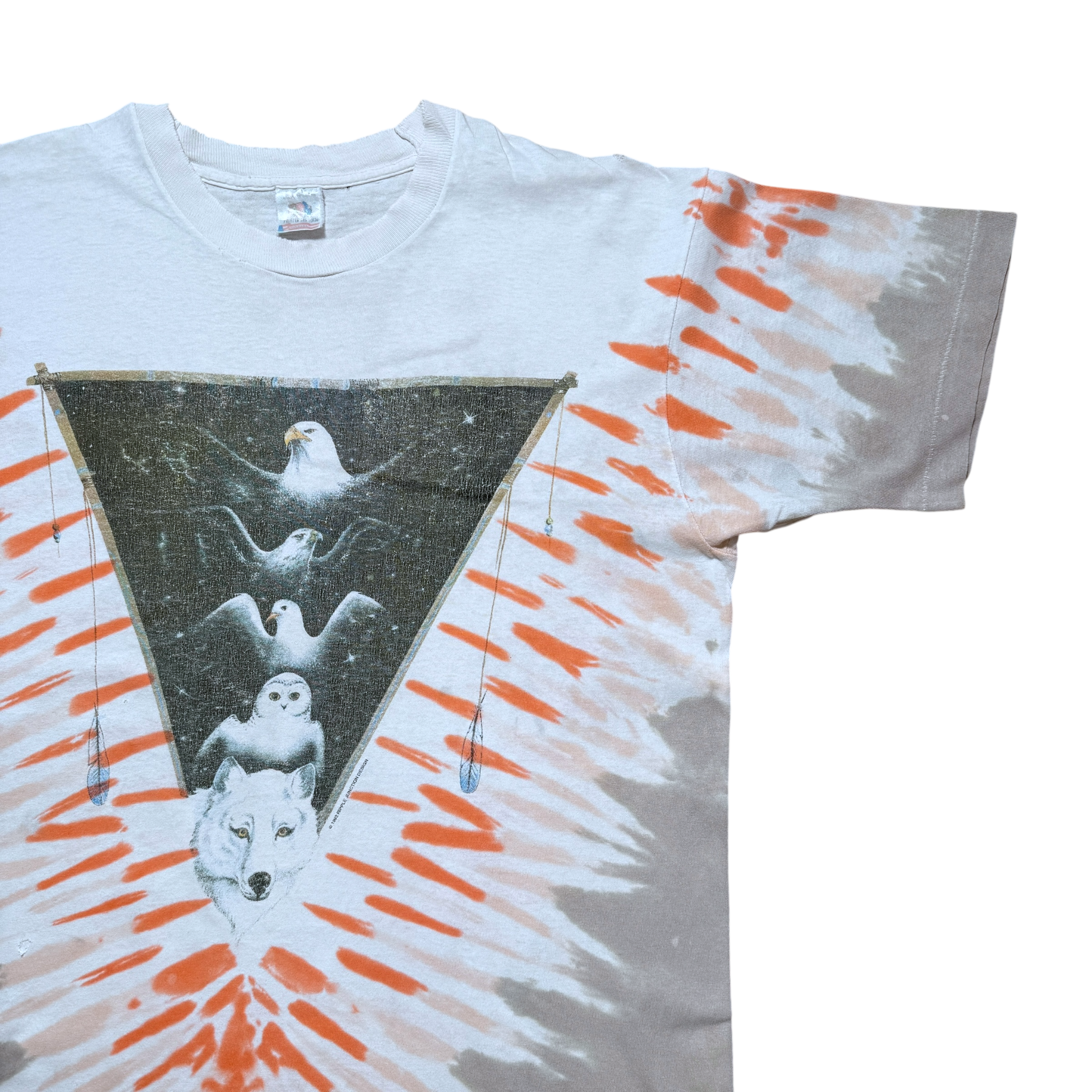 1992 Purple Junction Design t-shirt med drømmefanger-inspireret motiv af ulv og rovfugle sat i trekantkomposition. Tie-dye i orange, hvid og grå giver en unik visuel effekt. 1992 Purple Junction copyright. Single stitch. Fruit of the Loom-tag størrelse L. Fitter L.