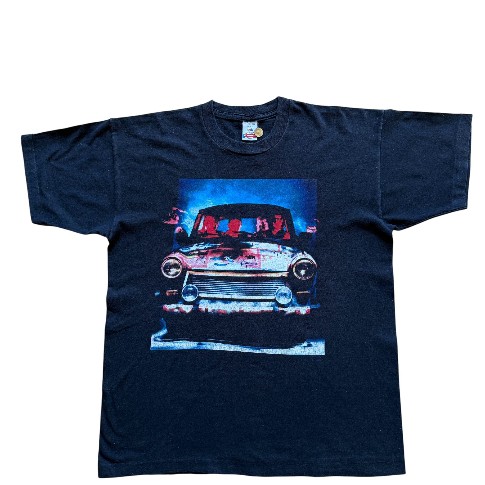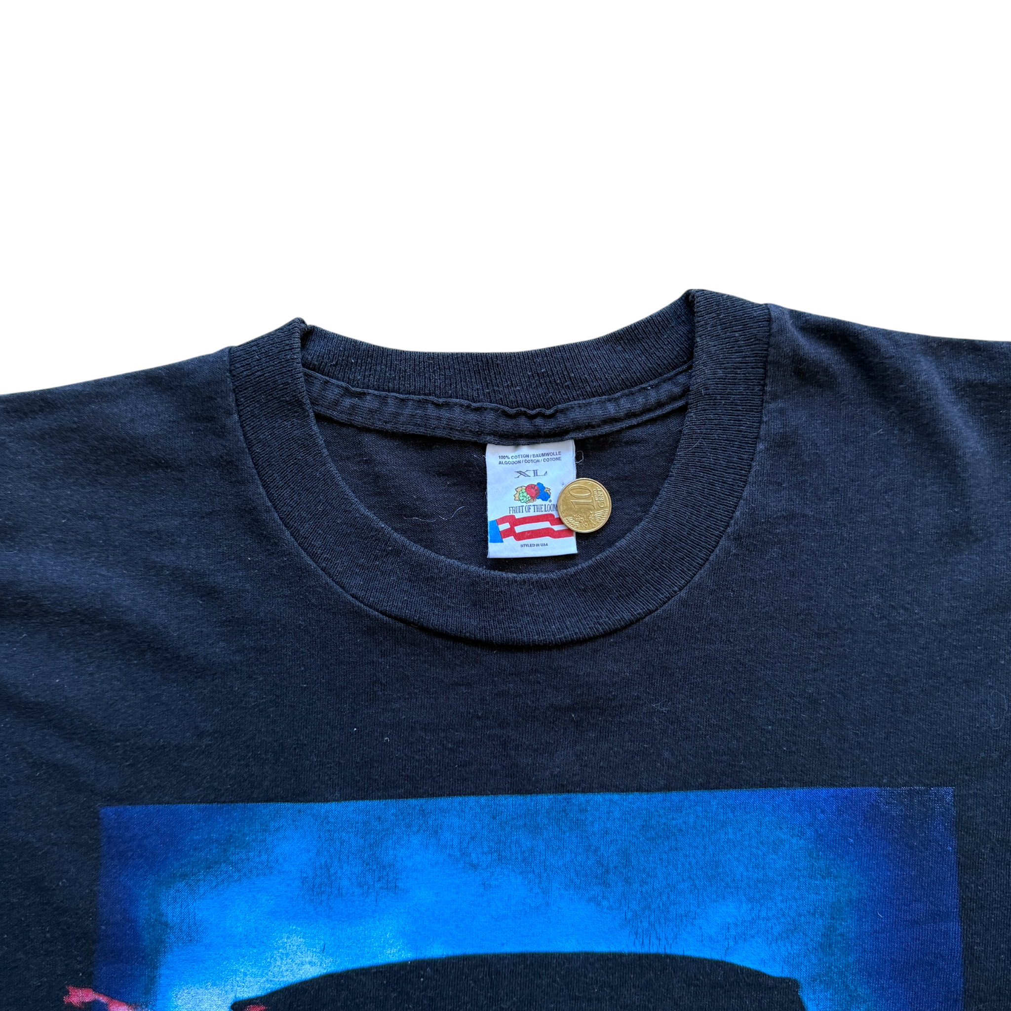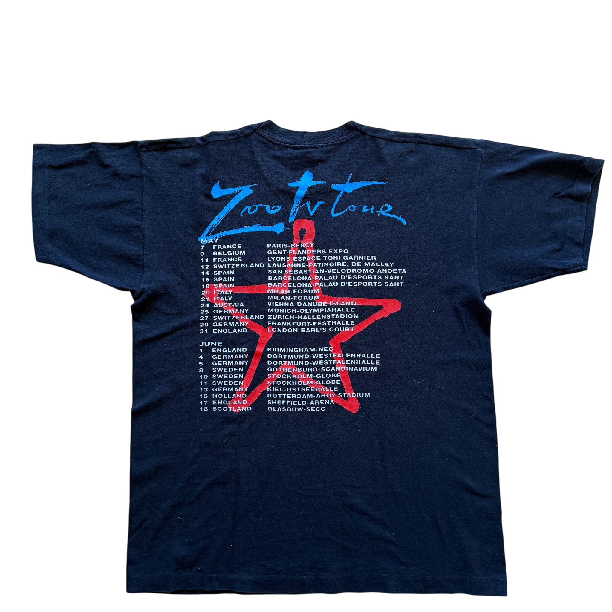 U2 Zoo TV Tour t-shirt fra 1992 med ikonisk grafik fra bandets banebrydende turné, der revolutionerede livekoncerter med sin audiovisuelle ekstravaganza. Fruit of the Loom tag størrelse XL. Fitter XL. Single stitch.