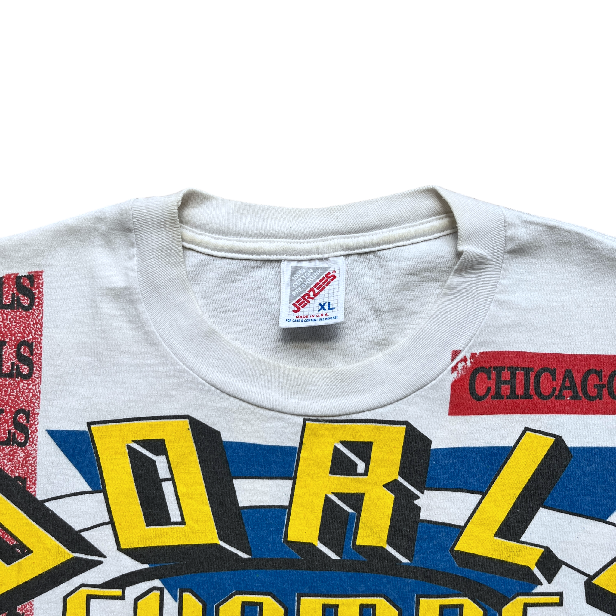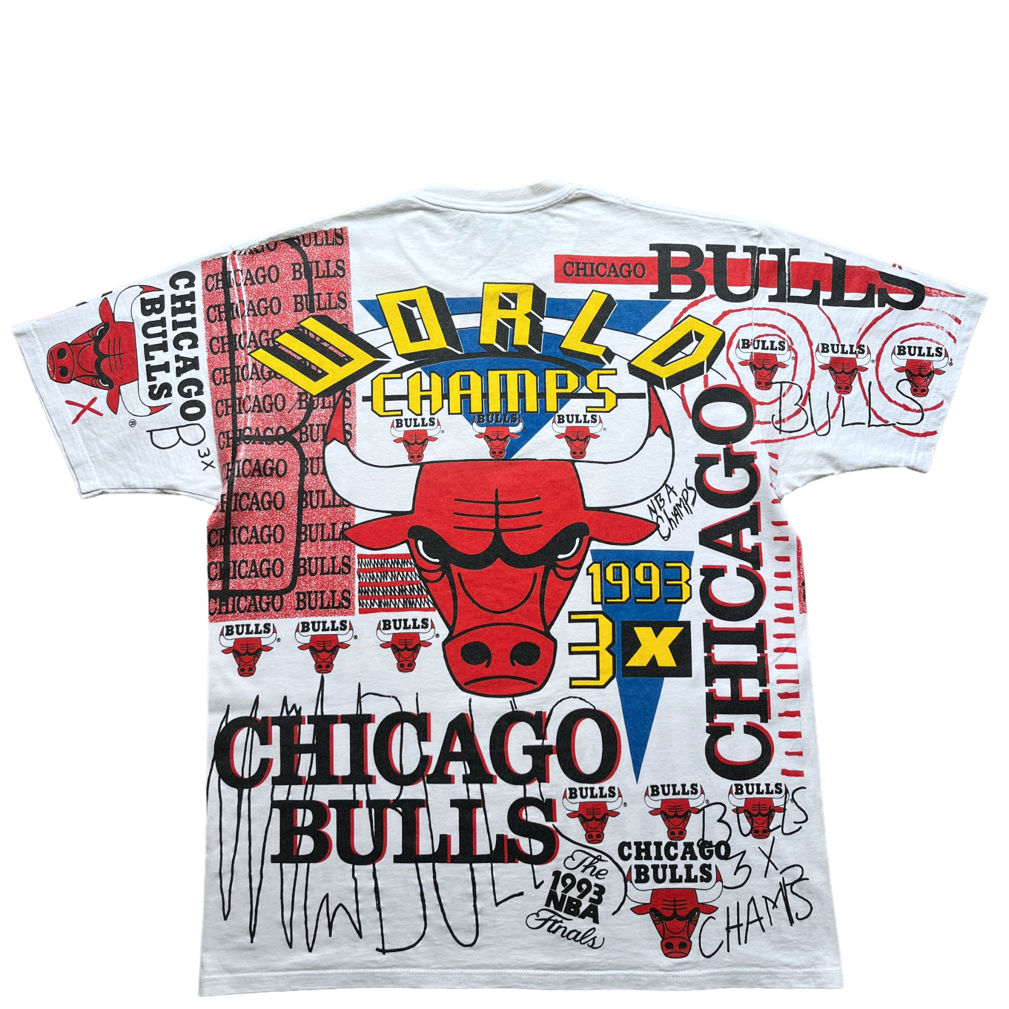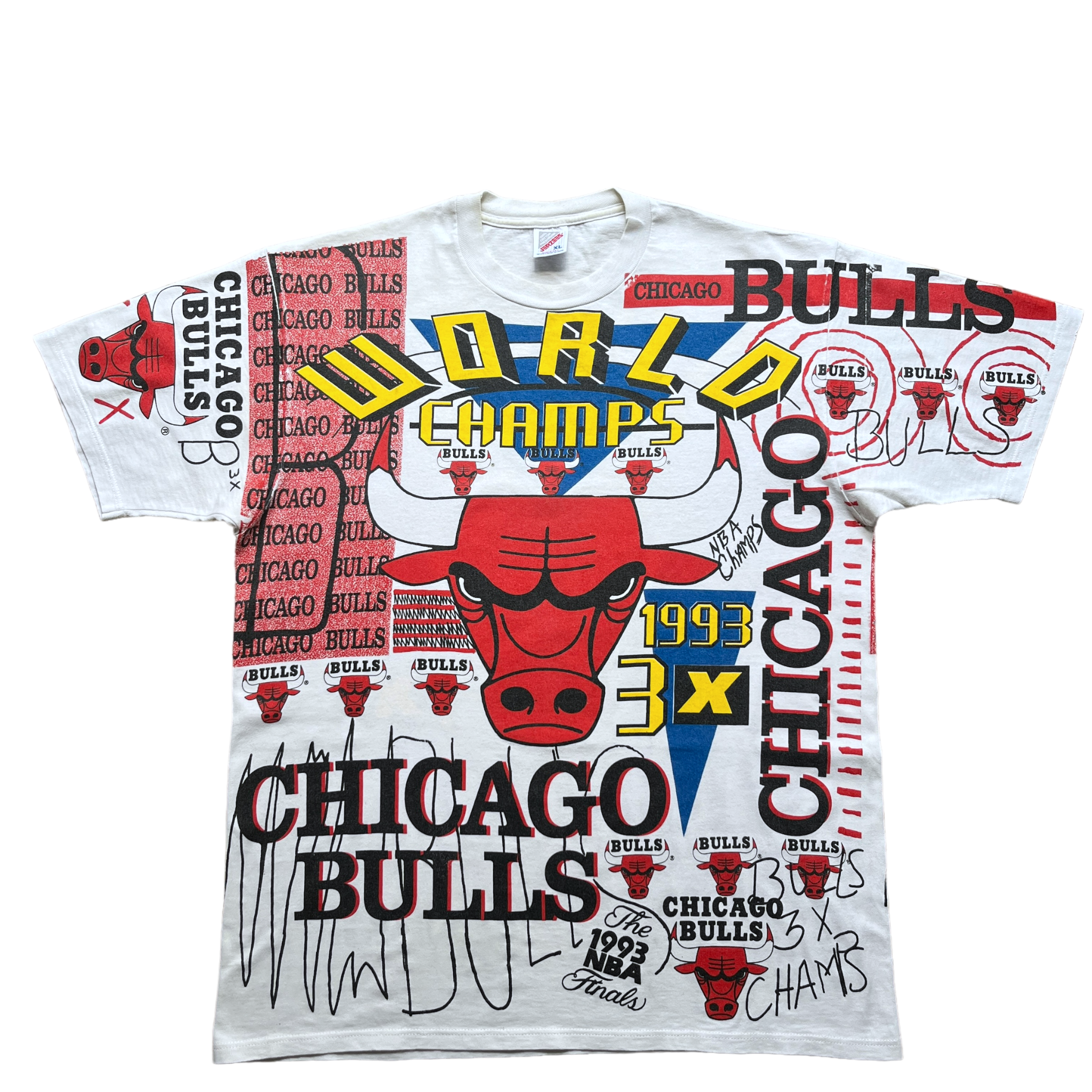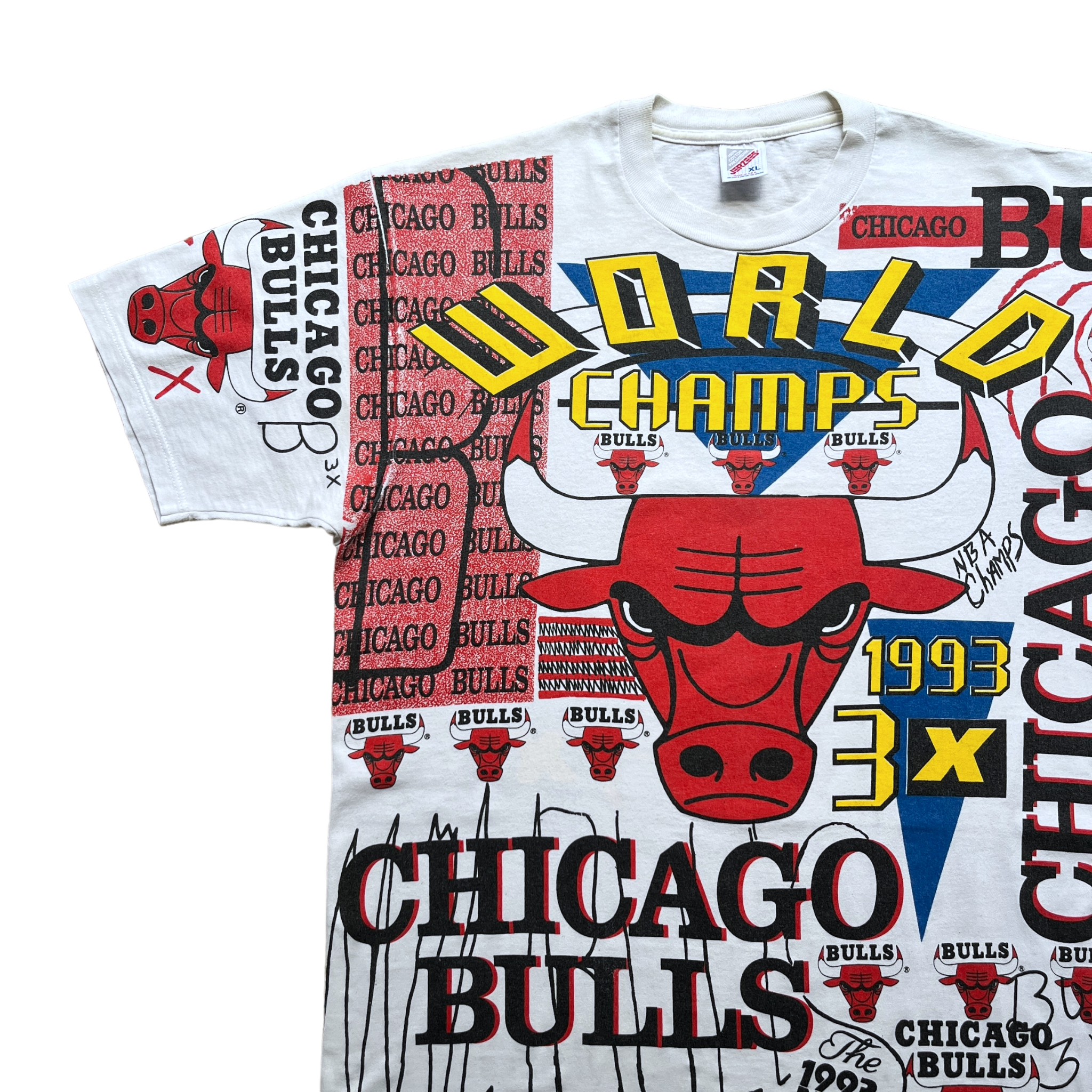 Chicago Bulls all-over-print t-shirt fra 1993. Jerzees tag størrelse XL. Fitter XL.