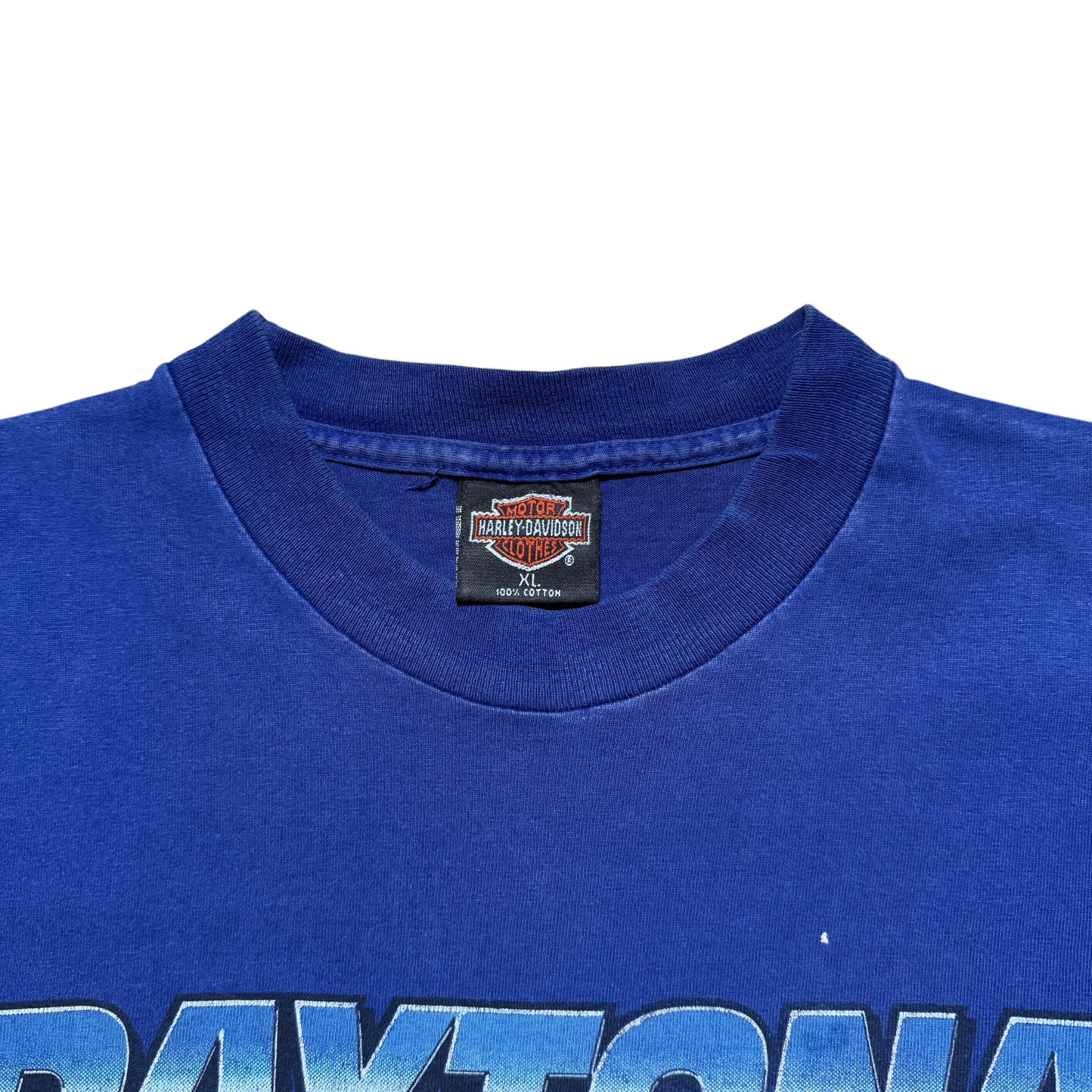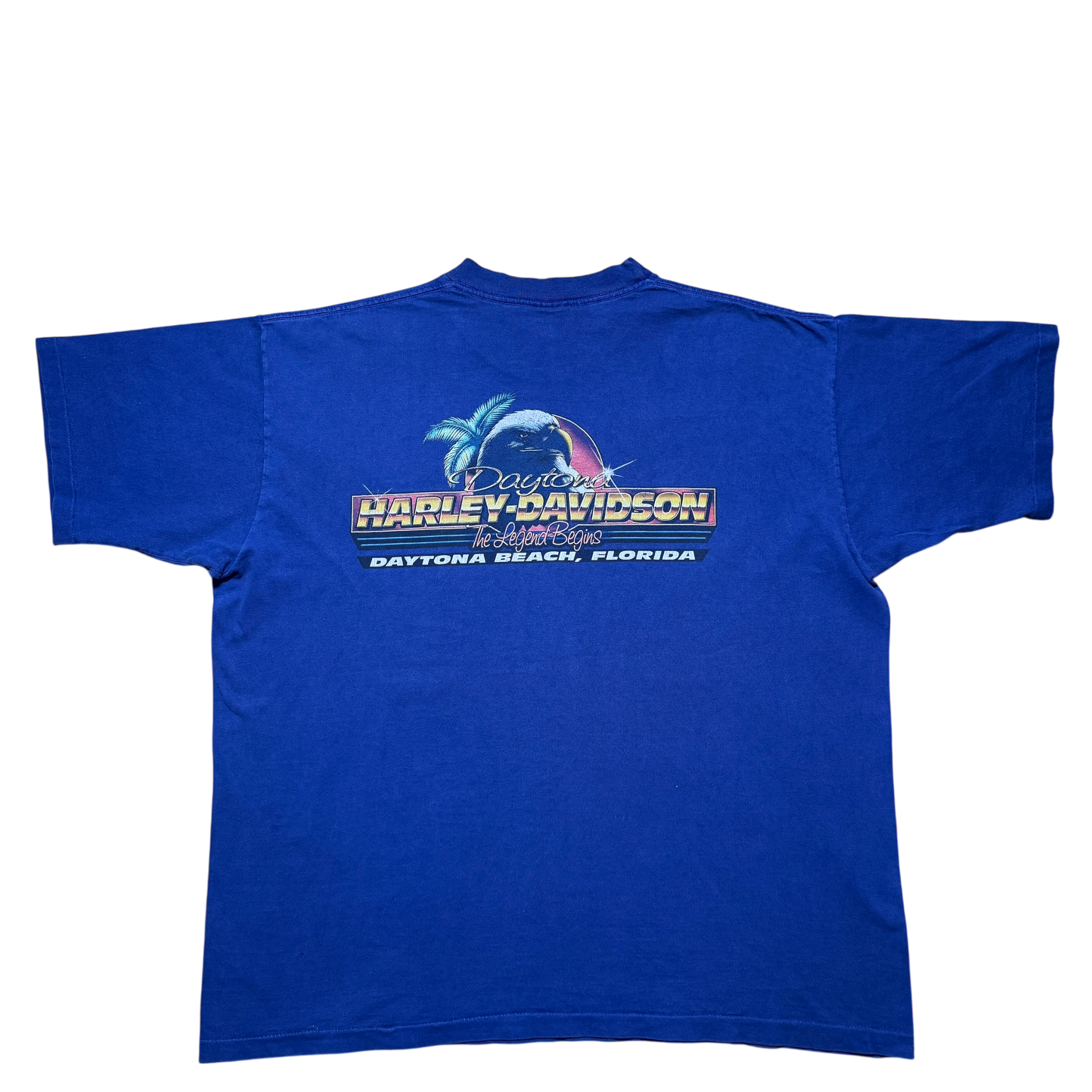 Daytona Bike Week var i 90erne et af årets store samlingspunkter for Harley-kørere, og denne 1994 tee viser et klassisk motiv fra perioden med ørnen, solnedgangen og Daytona-bygningen i front. Bagsiden har den velkendte Daytona Harley-dealer grafik. Harley tag størrelse XL. Fitter XXL. Single stitch. Små pinholes på front.