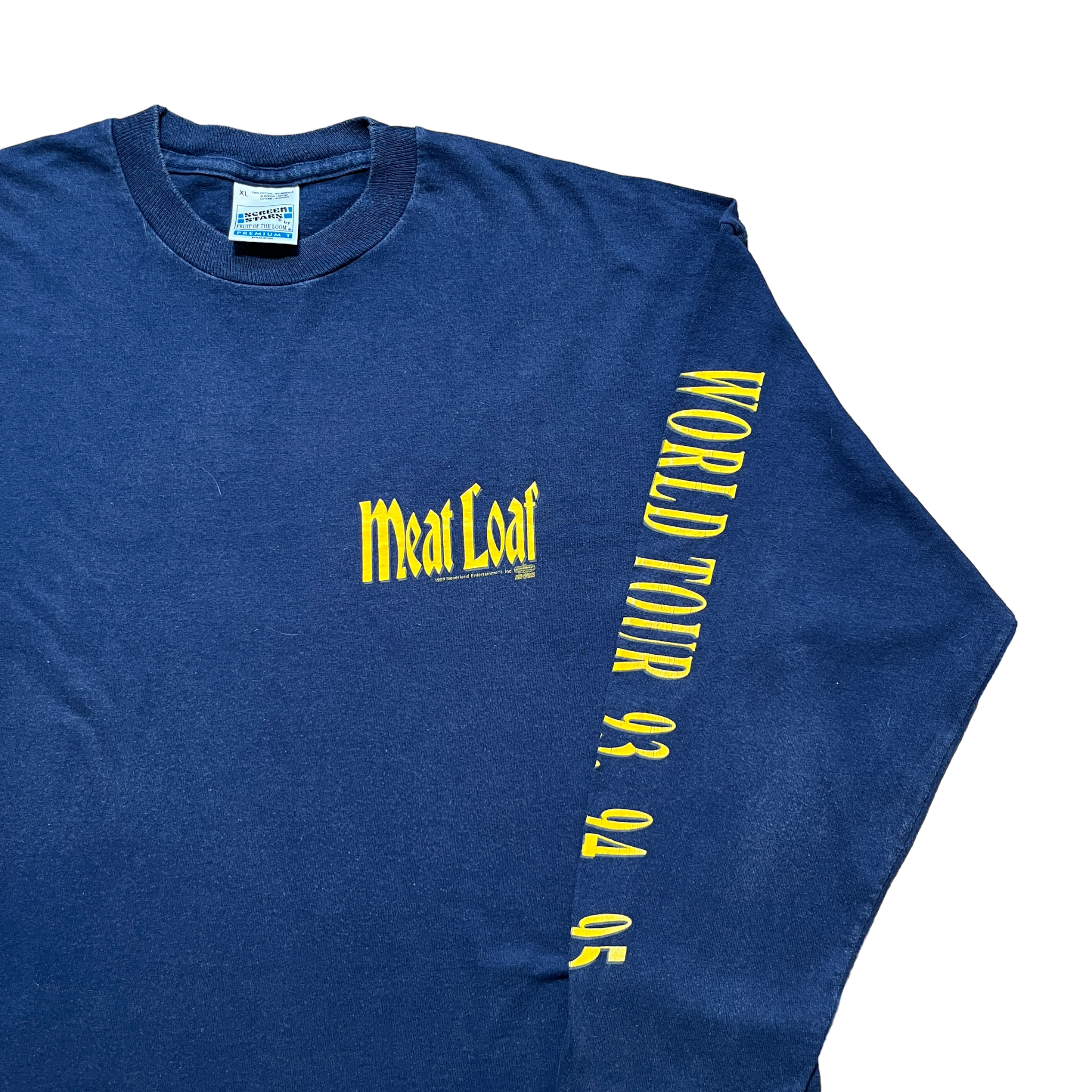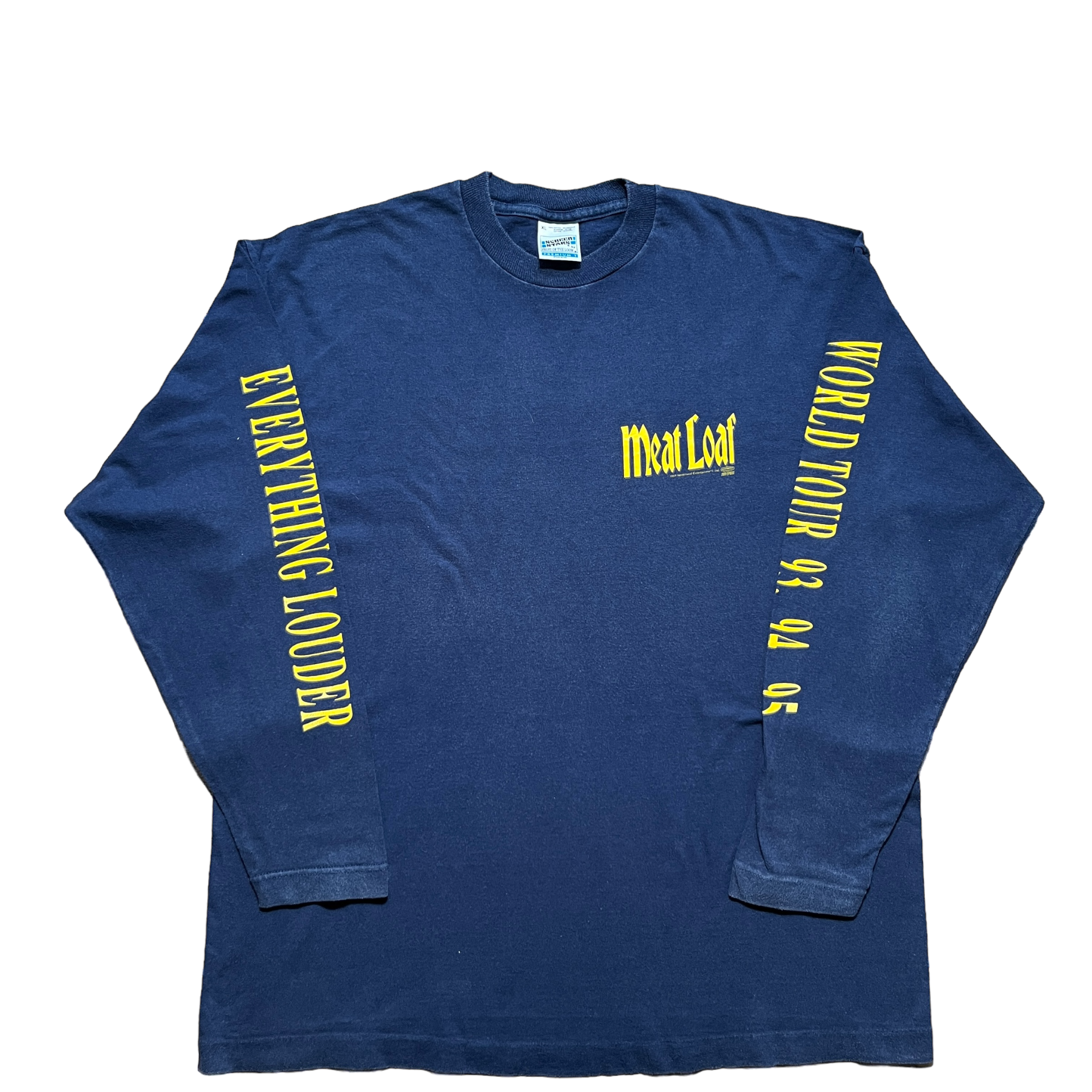 Meat Loaf longsleeve fra bandets "Everything Louder World Tour 93-95". Flot blå farve, simpelt chest print og virkelig seje sleeve prints. Neverland Entertainment copyright. Screen Stars tag størrelse XL. Fitter XL. Single stitch.
