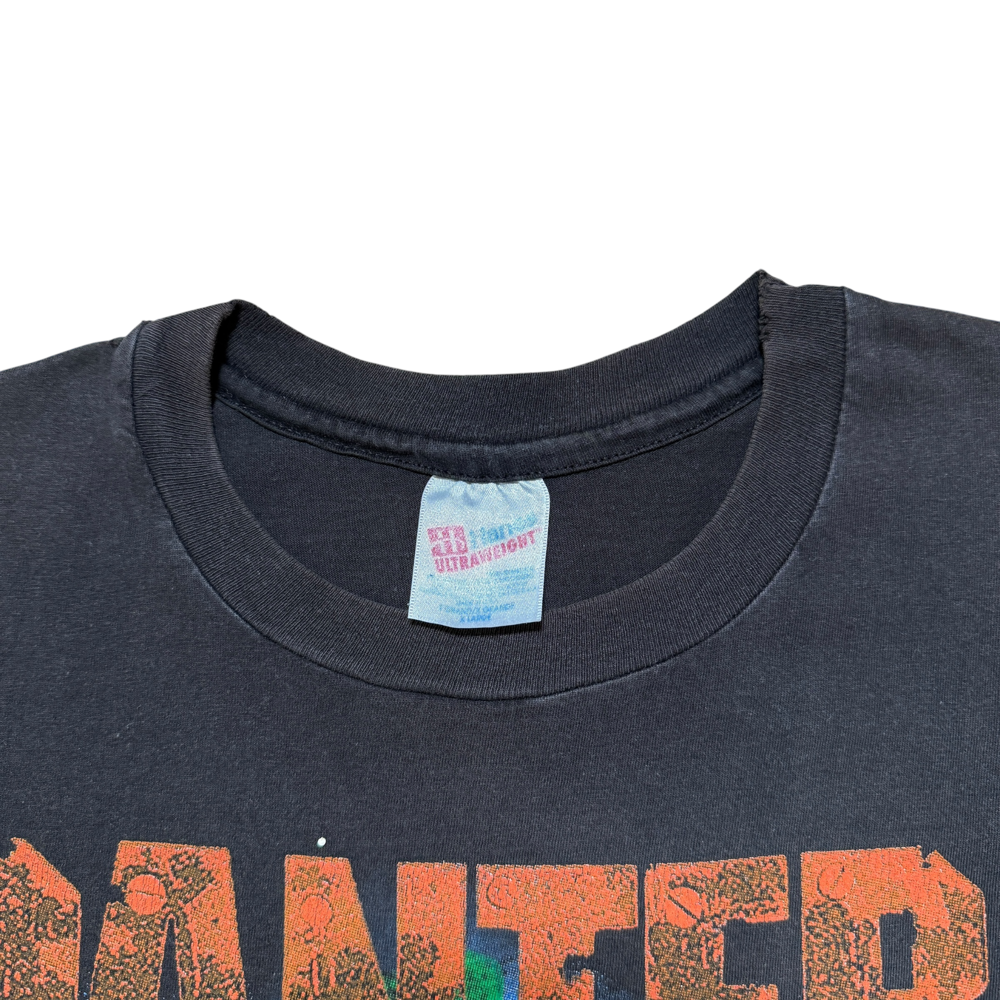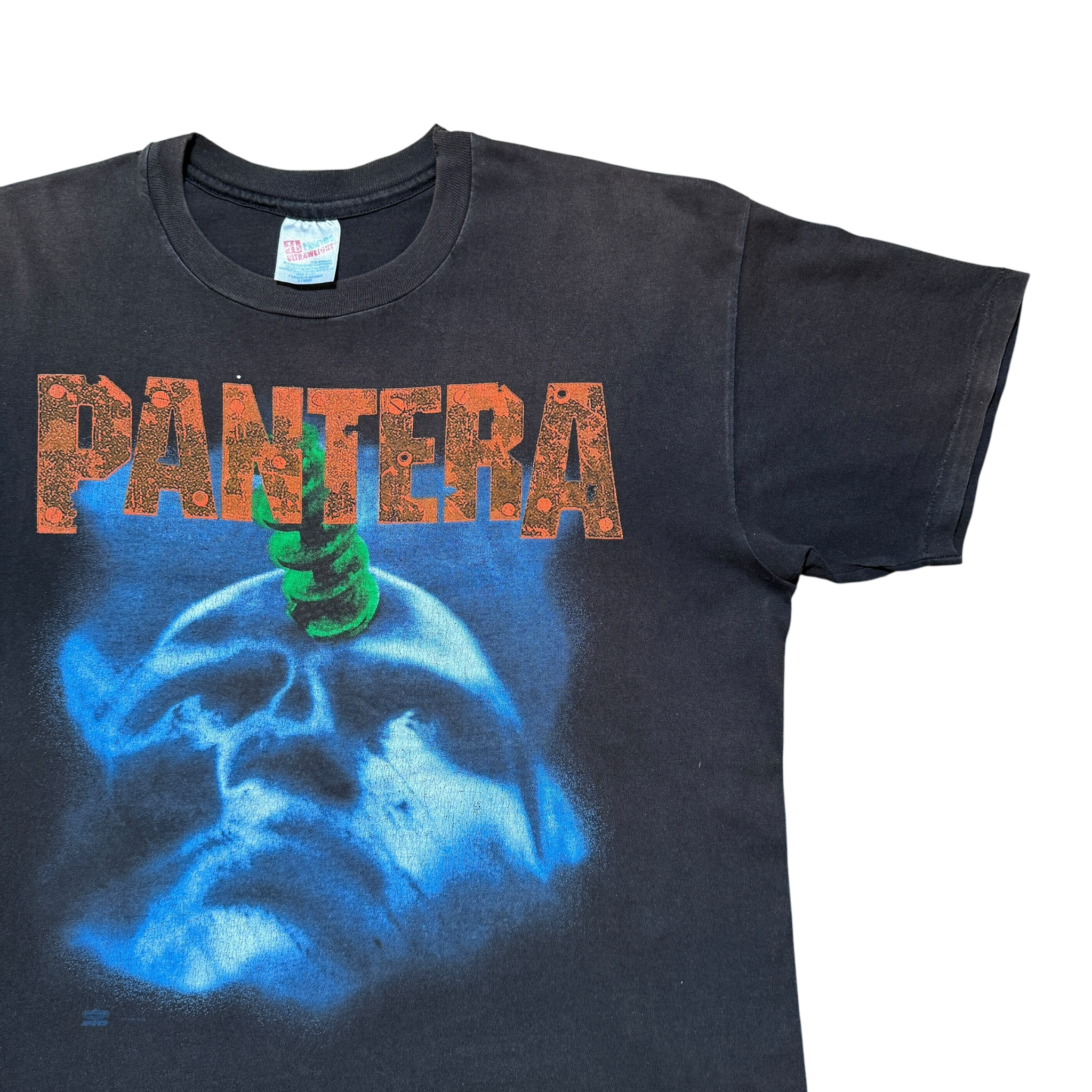 Original tour-merch fra Panteras legendariske Far Beyond Driven-æra - albummet der debuterede som nr. 1 på Billboard 200 og cementerede bandets status som et af de mest kompromisløse metalnavne i 90’erne. Designet er blandt de mest ikoniske i bandets historie: den intense blå kraniegrafik med en borekrone ned gennem panden, et visuelt udtryk for albummets rå, aggressive energi. Bagsiden har fuld tour print med alle stop fra deres 1994-verdensomspændende koncertrække, et snapshot af en af Panteras mest intense perioder på scenen. Tydelig patina og en cool synlig reparation foran, der giver ekstra karakter og fortæller sin egen historie. Hanes tag størrelse XL- Fitter XL. Single stitch.