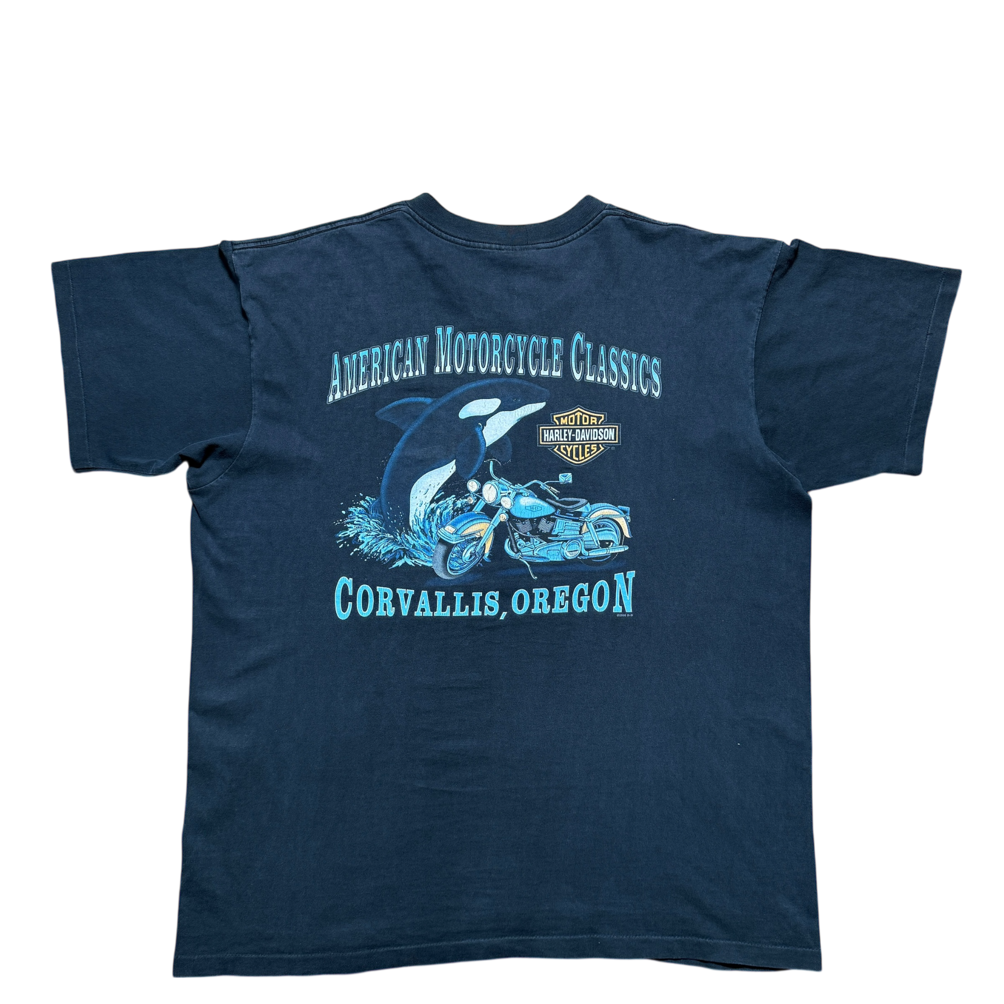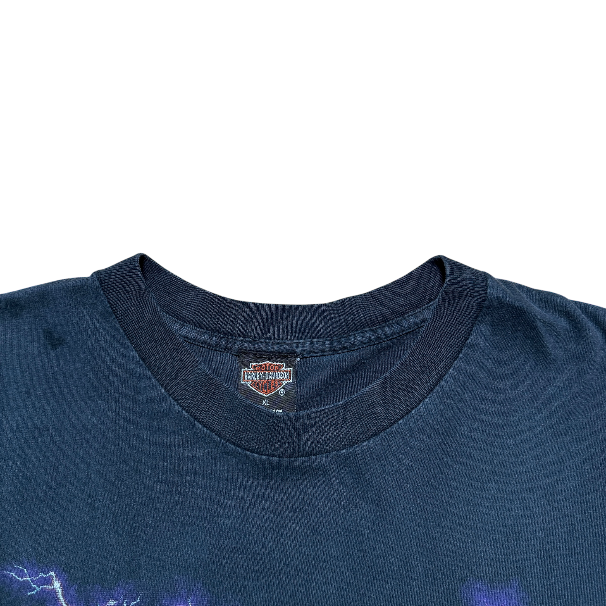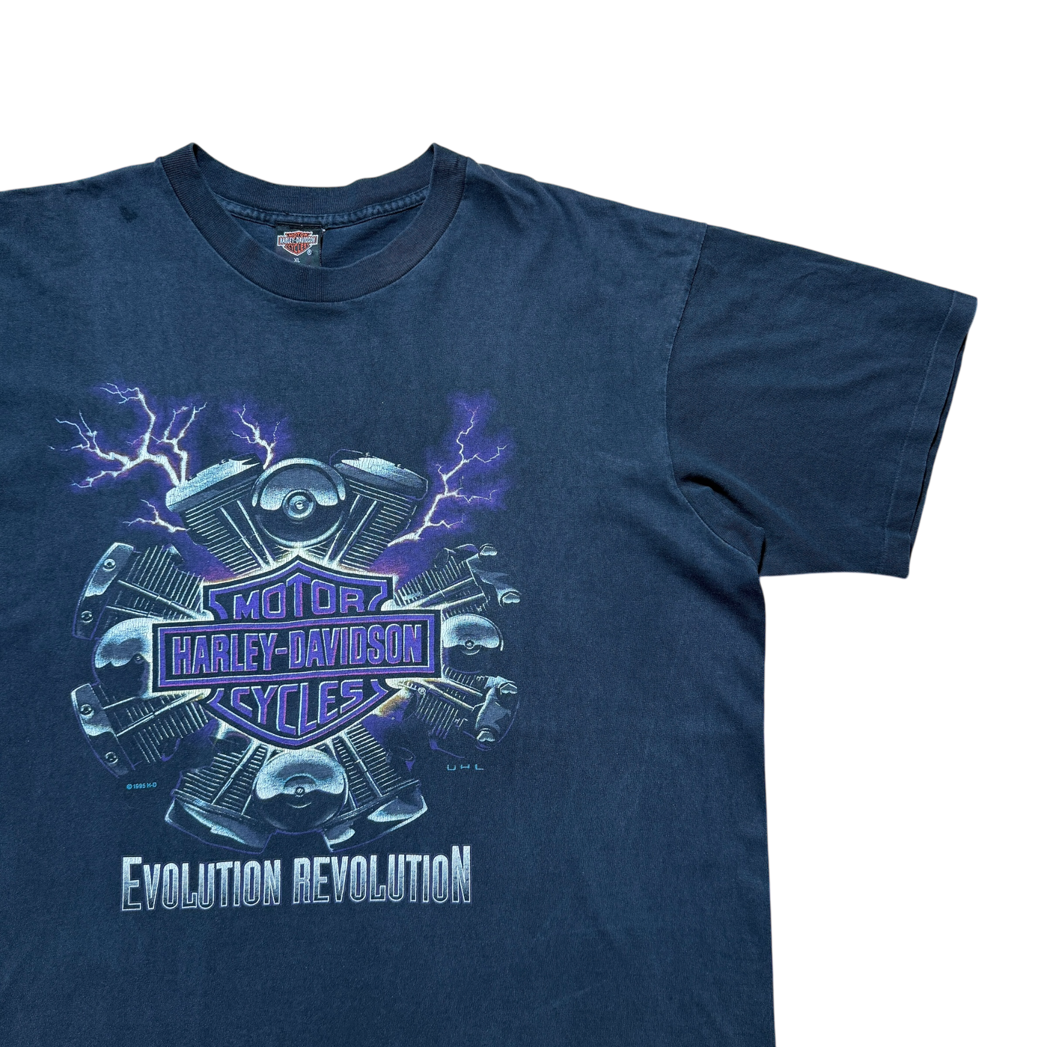 Harley-Davidson “Evolution Revolution” t-shirt fra 1996 - en klassiker fra mærkets æra med nogle af deres mest detaljerede og elektriske grafiktryk. Trykket viser den ikoniske V-twin motor med lilla lyn og bold Harley-logo i midten, en hyldest til motorcyklens kraft og historie. 1996 Harley-Davidson copyright. Harley tag størrelse XL. Fitter XXL.