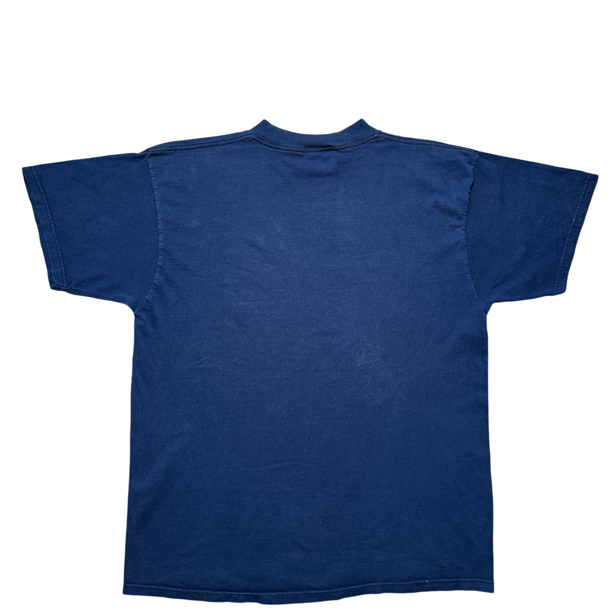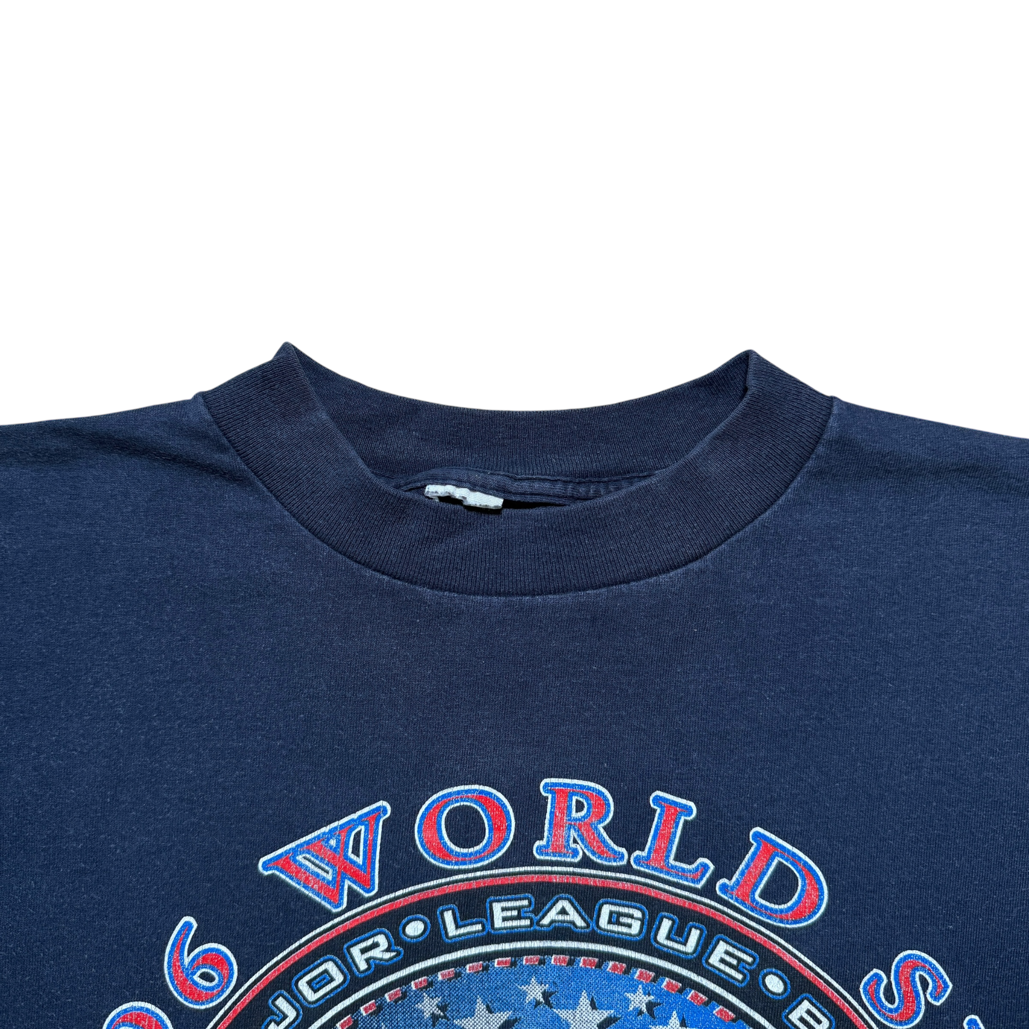 New York Yankees 1996 World Series Champions t-shirt med farverigt baseball- og stjernebannerprint på fronten. Fejrer holdets sejr over Atlanta Braves, hvilket markerede Yankees’ første mesterskab siden 1978. 1999 Logo 7 copyright. Cut tag. Passer XL.