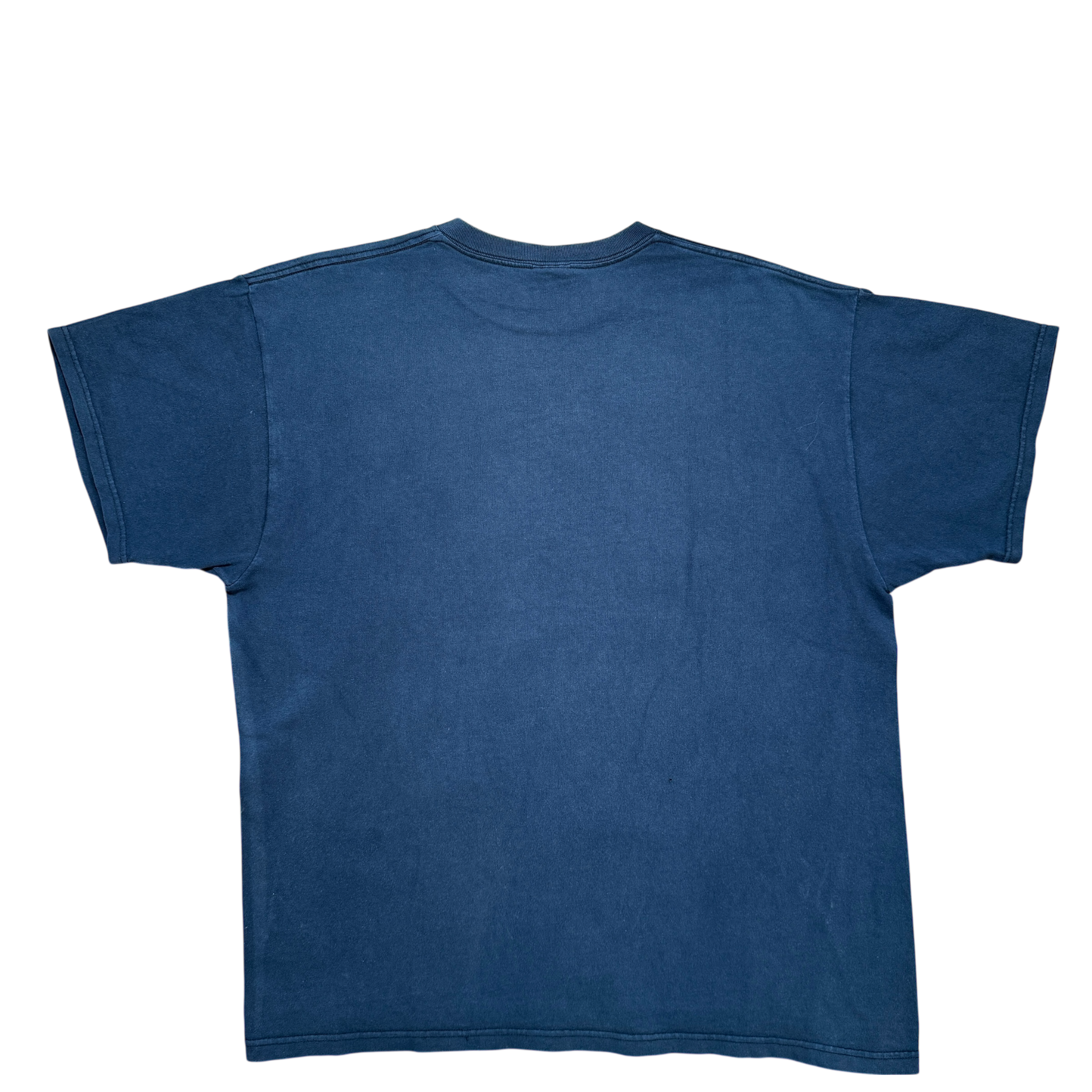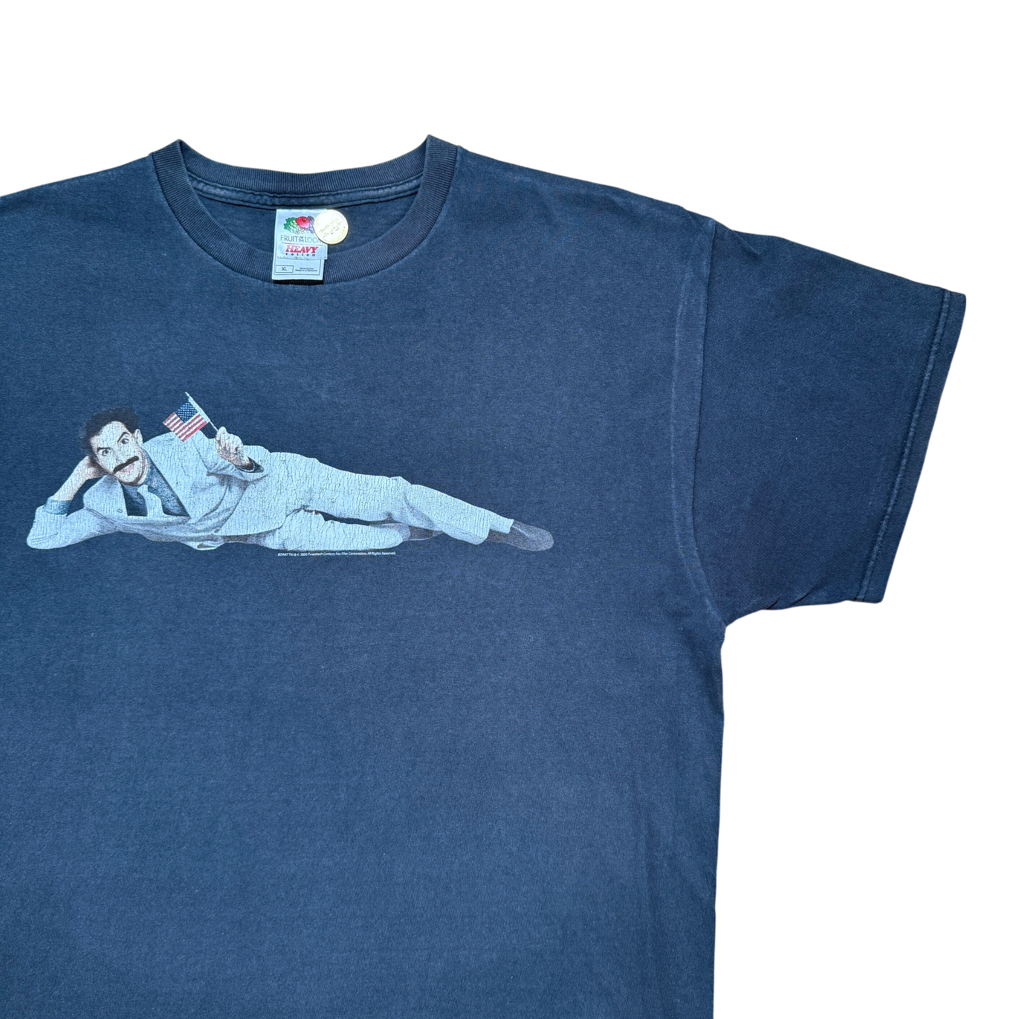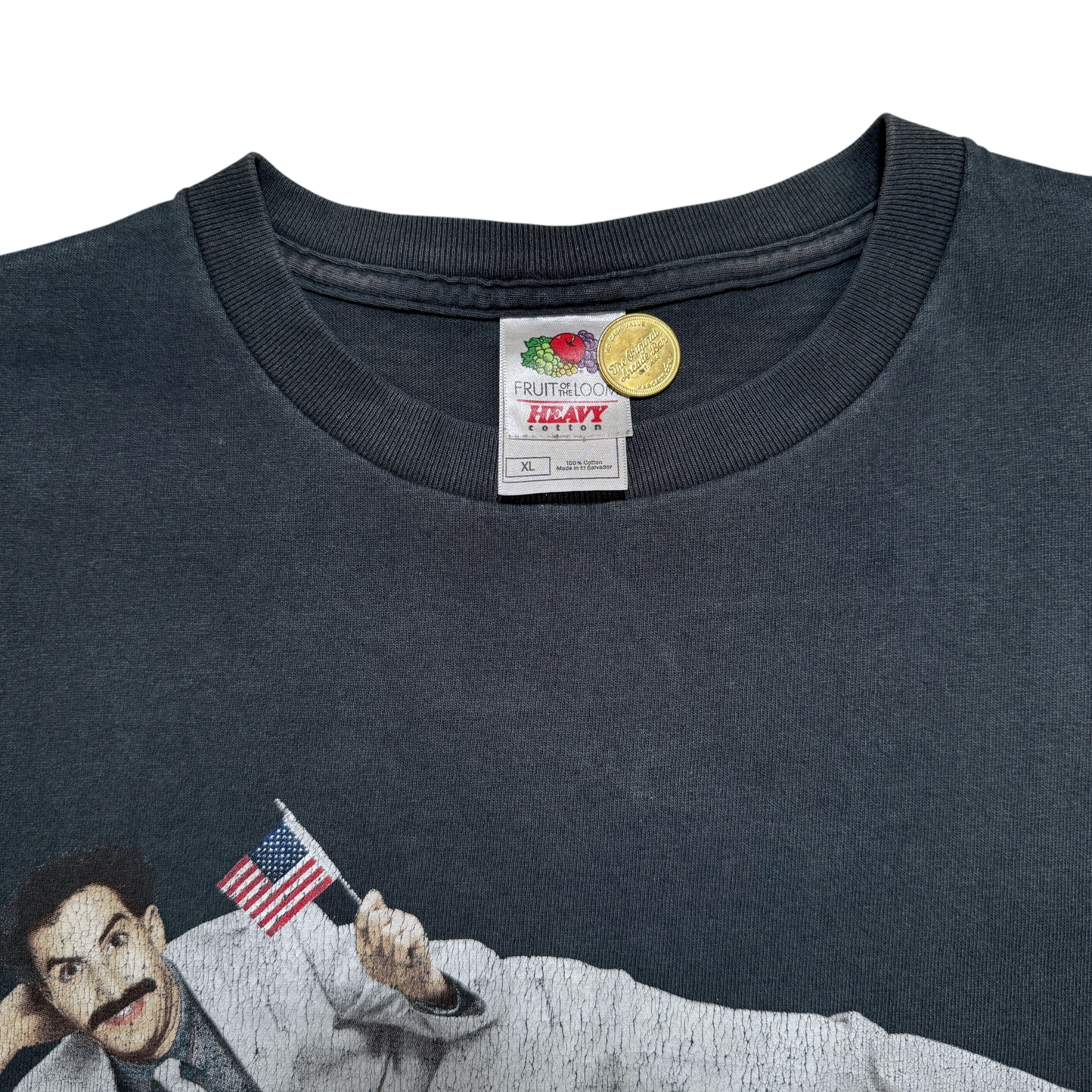 T-shirt fra 2005 med Borat i sit karakteristiske lysegrå jakkesæt, poserende med det amerikanske flag - et ikonisk billede fra Sacha Baron Cohens satiriske mesterværk, der for alvor satte hans figur på verdenskortet. Printet og t-shirten har fået et flot fade. 2005 Twentieth Century Fox copyright. Fruit of the Loom-tag størrelse XL. Fitter XL.
