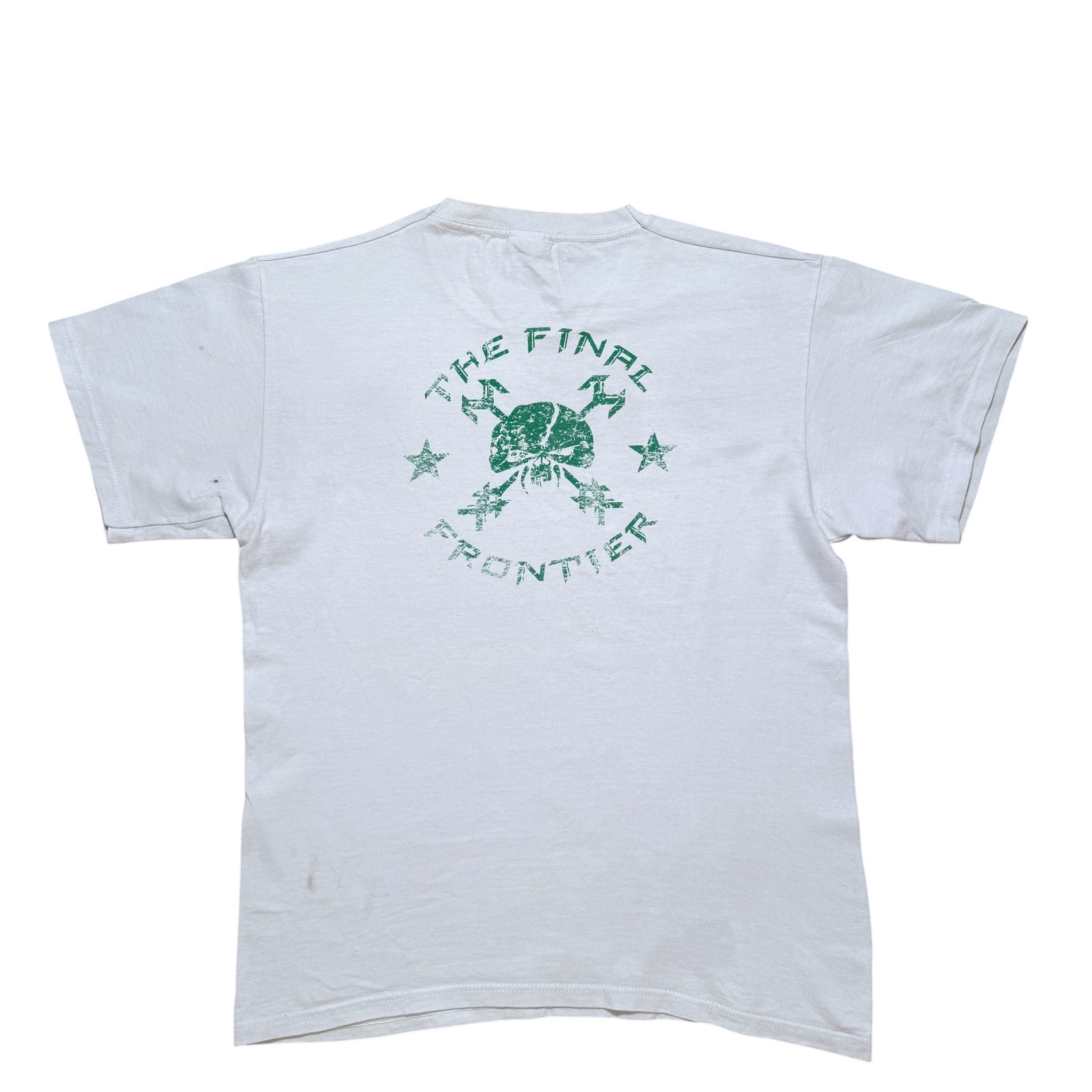 Iron Maiden t-shirt fra 2010 med "El Dorado"-motivet, inspireret af science fiction-æstetikken fra albummet The Final Frontier. Printet er udformet som et retro tegneseriecover, komplet med bandets maskot Eddie i et futuristisk scenarie. 2010 Iron Maiden copyright. Fruit of the Loom tag størrelse Large. Fitter Large.
