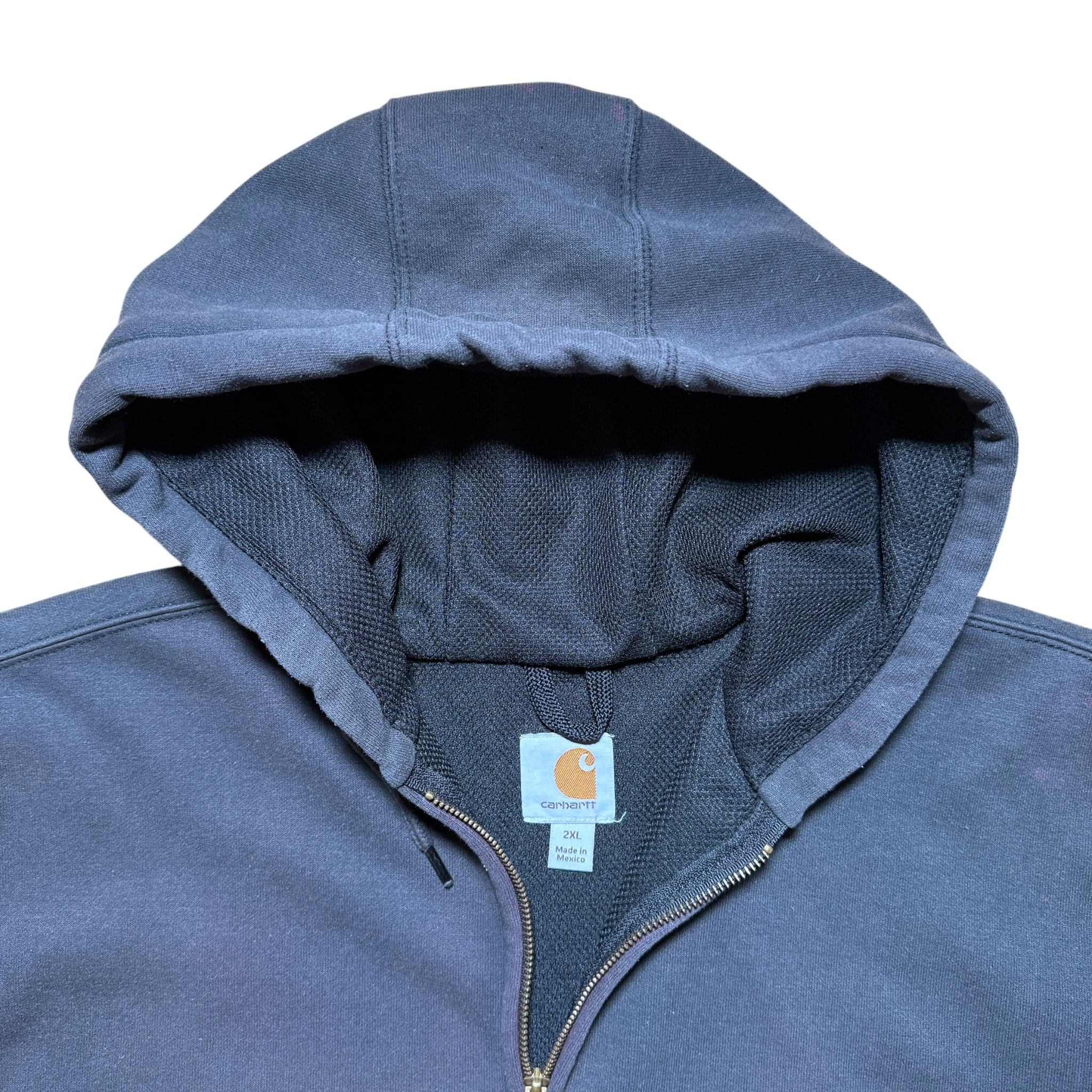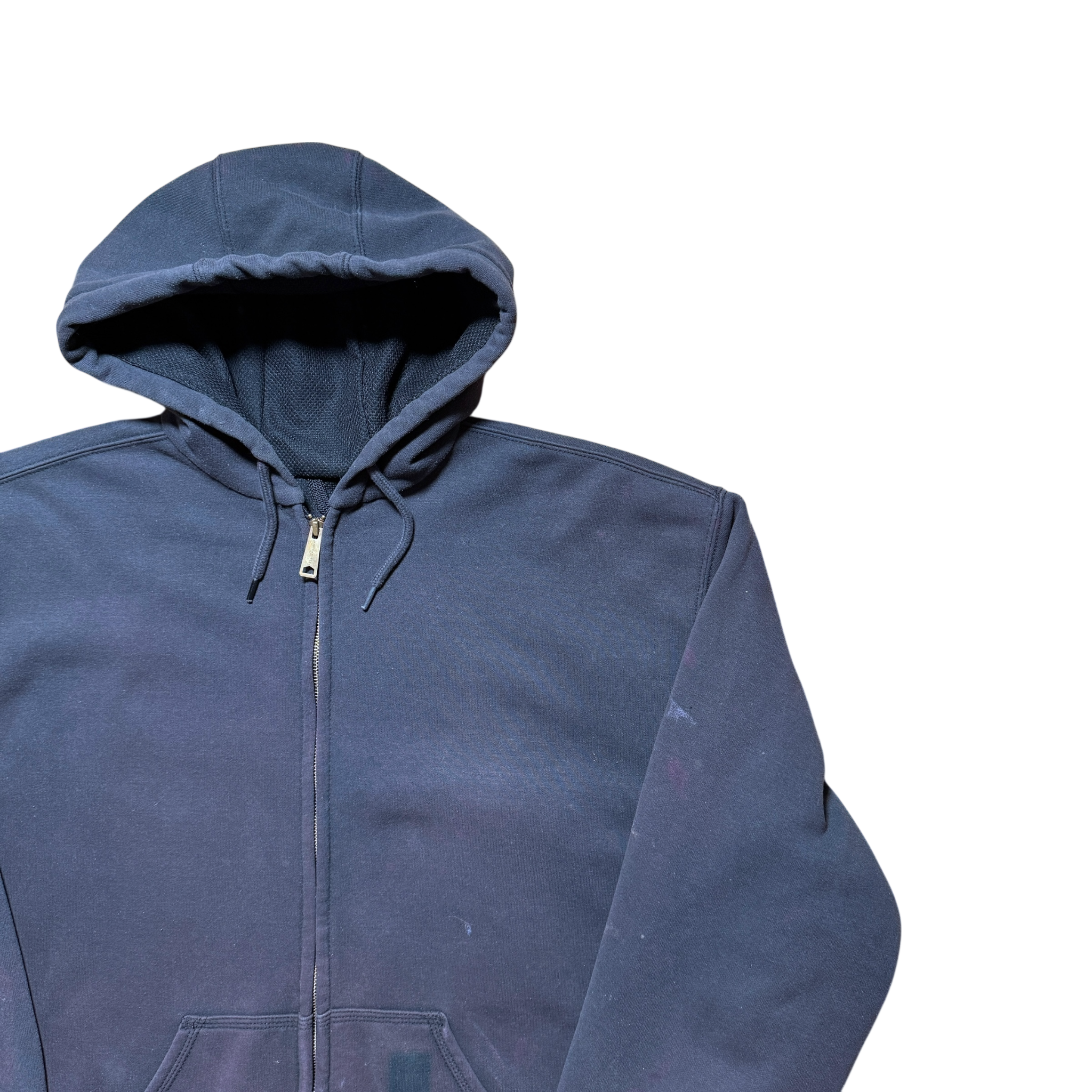 90er Carhartt full zip hoodie med tydelig fade og paint stains på ærmet. Carhartt tag størrelse XXL. Fitter XXL.
