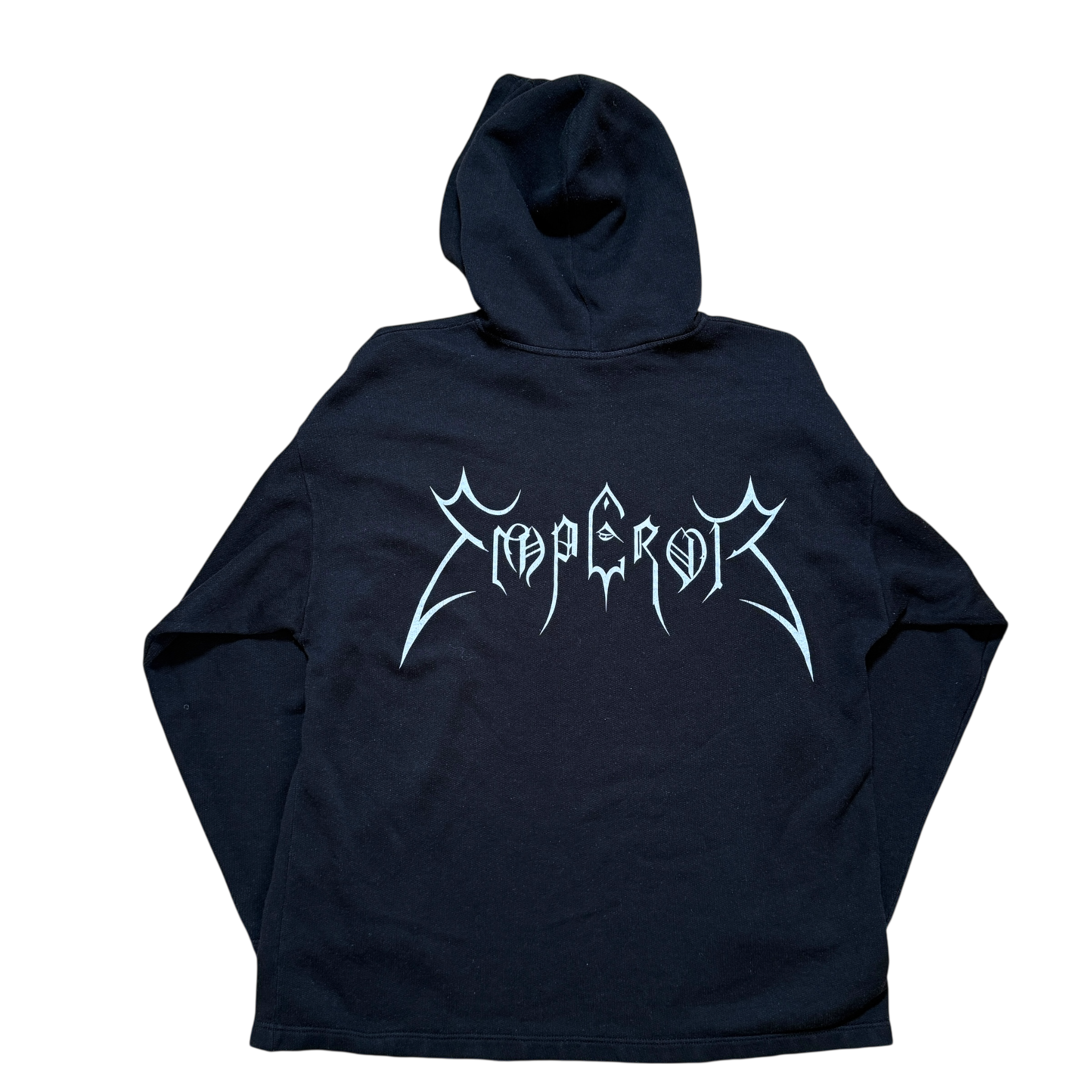 Emperor hoodie med stort frontprint, inspireret af bandets markante visuelle univers. Emperor regnes som et af de mest indflydelsesrige bands i norsk black metal, kendt for deres symfoniske tilgang, komplekse kompositioner og et udtryk, der har formet genren siden starten af 90erne. Tag størrelse XL. Fitter XL.