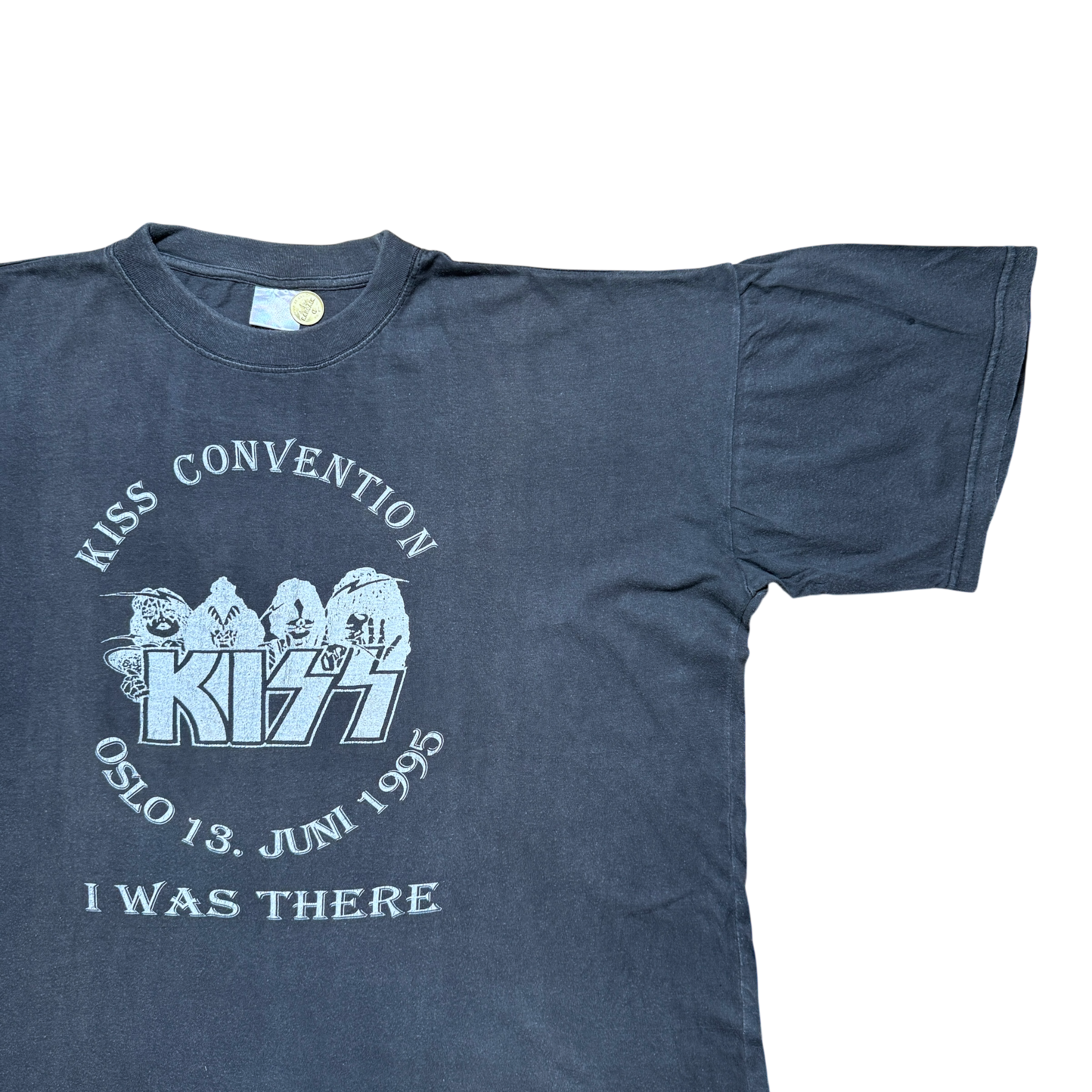 KISS Convention Oslo 13. juni 1995 - et sjældent stykke fan-merch fra midten af 90erne, hvor bandets dedikerede conventions samlede hardcore samlere og diehards fra hele verden. Frontprintet har det klassiske, enkle convention-look med bandets masker over logoet og den ikoniske “I Was There”-markering. Perfekt 90er fade og tung, blød bomuld. 1995 copyright. Vasket tag. Fitter XXL. Små huller på fronten.