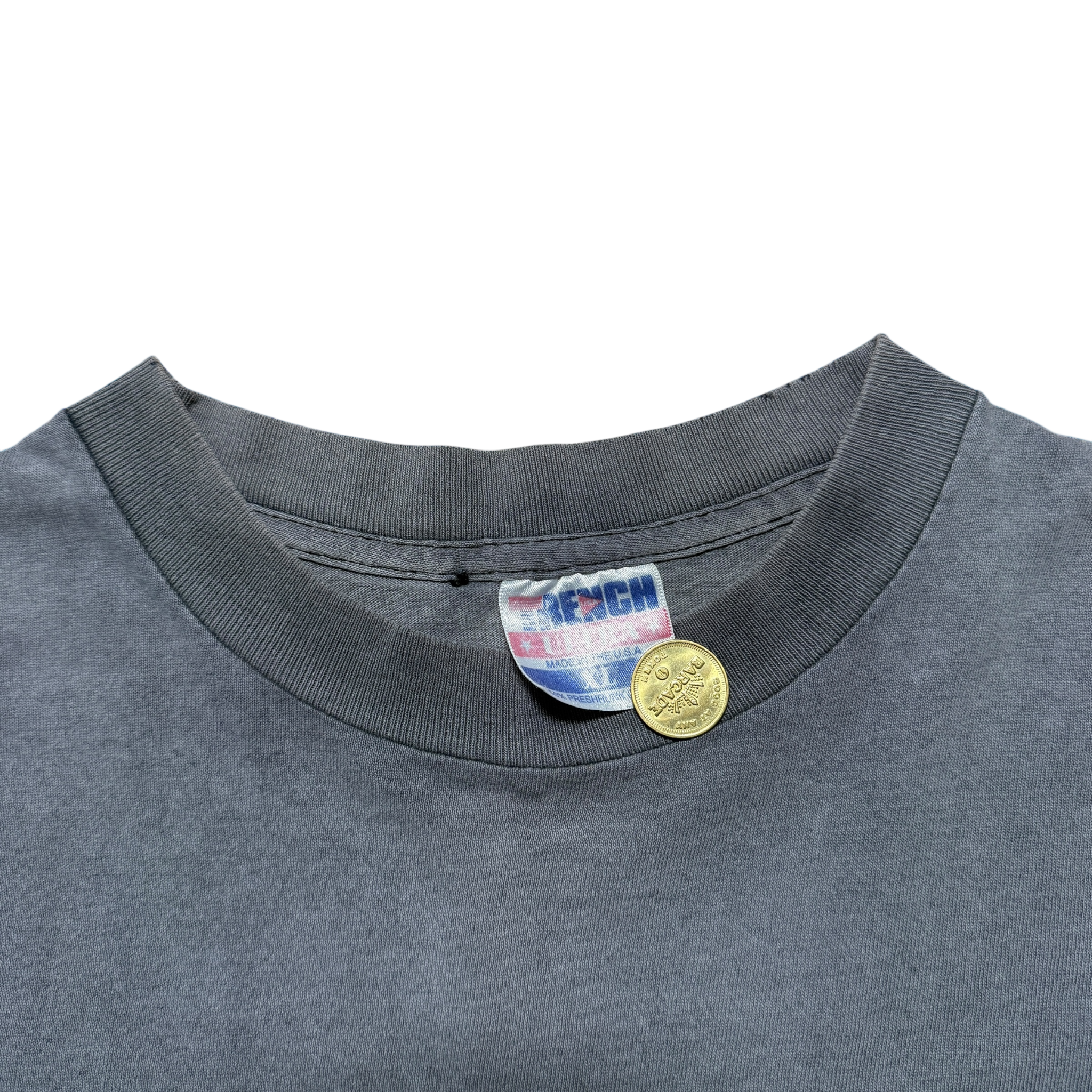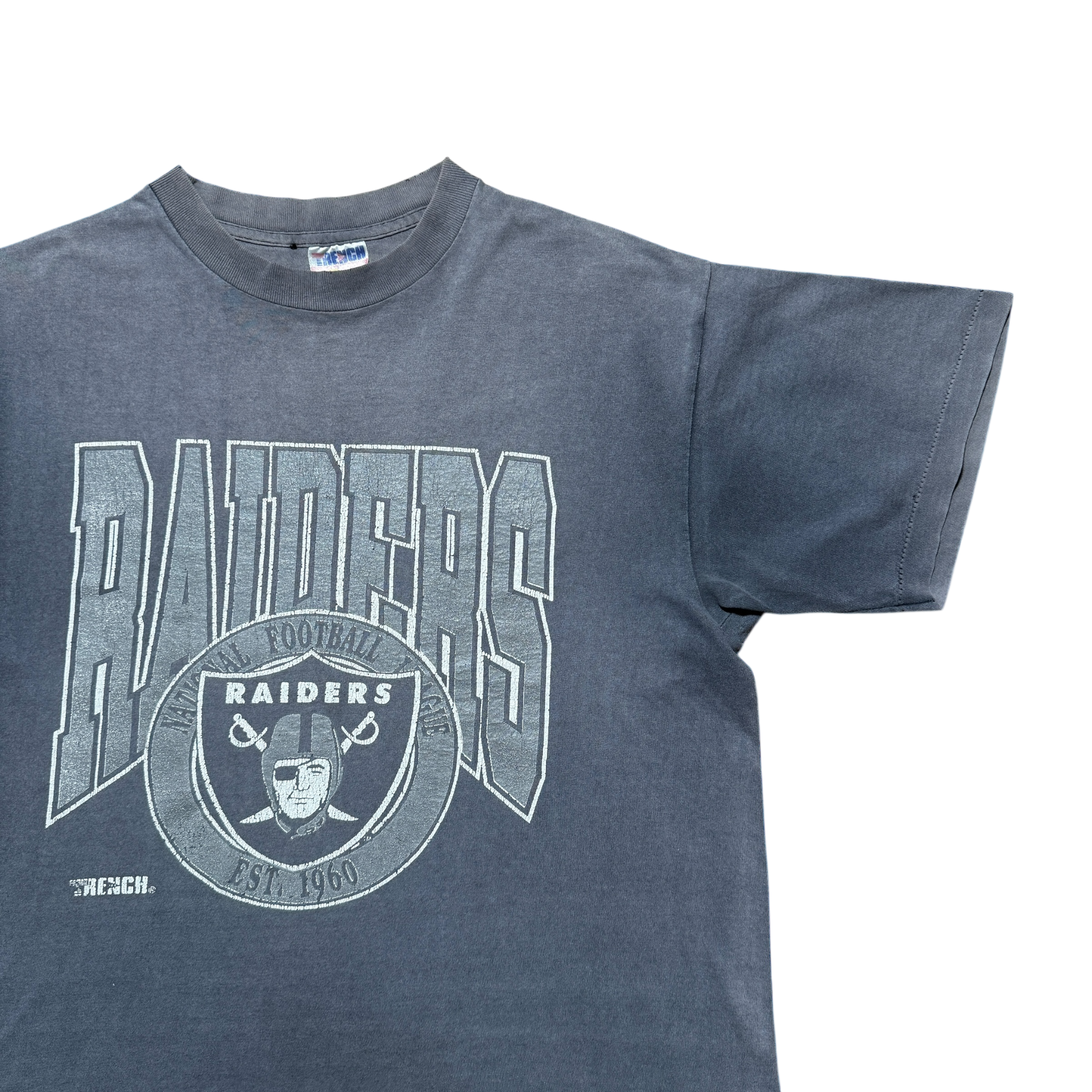 Raiders t-shirt fra 90'erne - et klassisk stykke amerikansk sportswear med det ikoniske Los Angeles Raiders-logo i stort frontprint. Det ton-i-ton gråtryk og kraftige bomuldsstof rammer præcist den æstetik, der gjorde Raiders-gear til et kulturelt symbol i både sport og West Coast hiphop. Single stitch. Trench-tag størrelse XL. Fitter Large