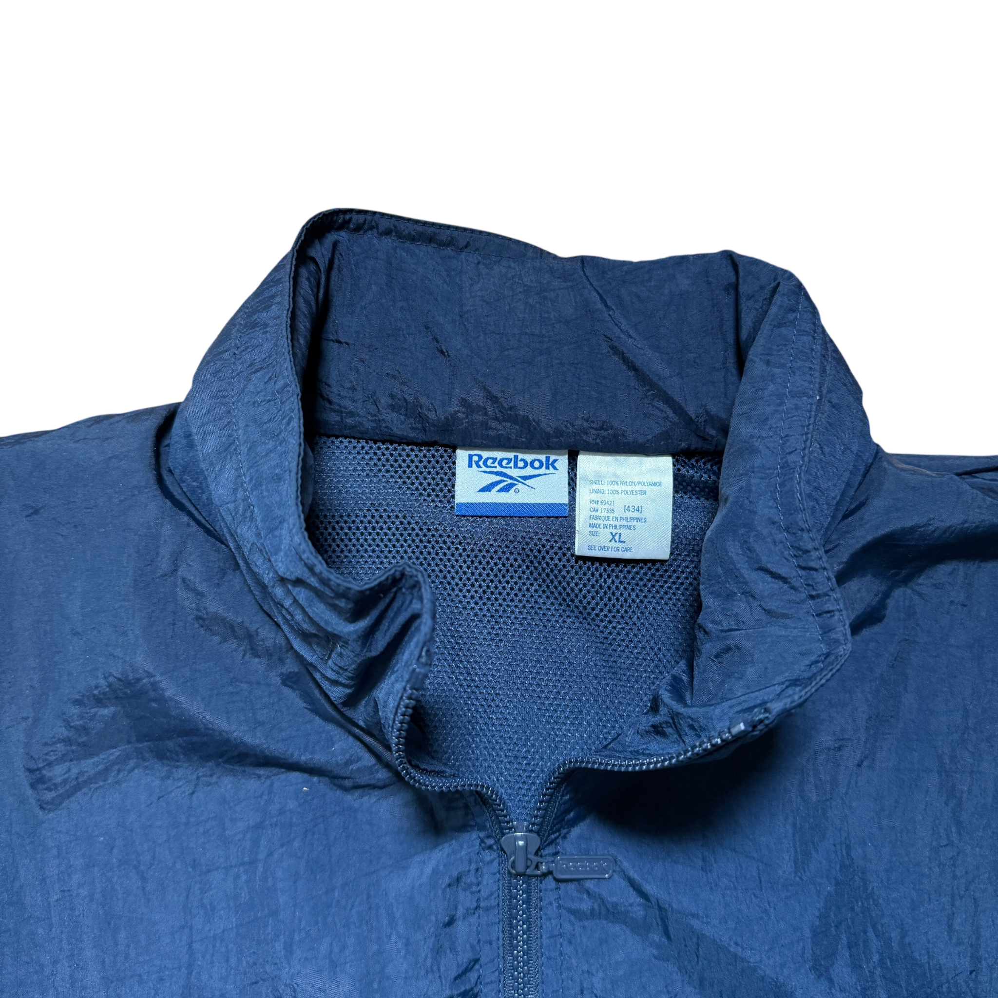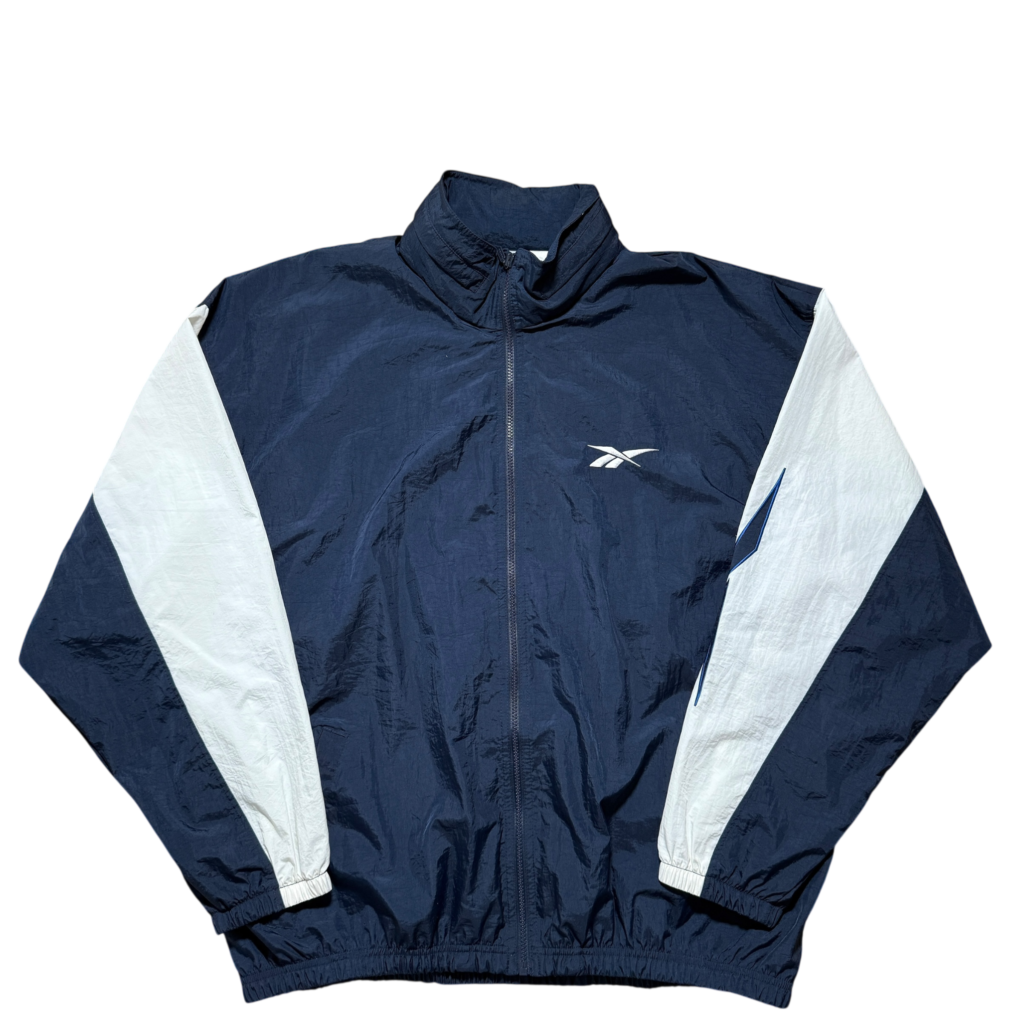 Reebok track top i blå og hvid med et enkelt brystlogo og klassisk sports-silhuet. Lightweight nylon og et afslappet fit. Reebok tag størrelse XL. Fitter XL.