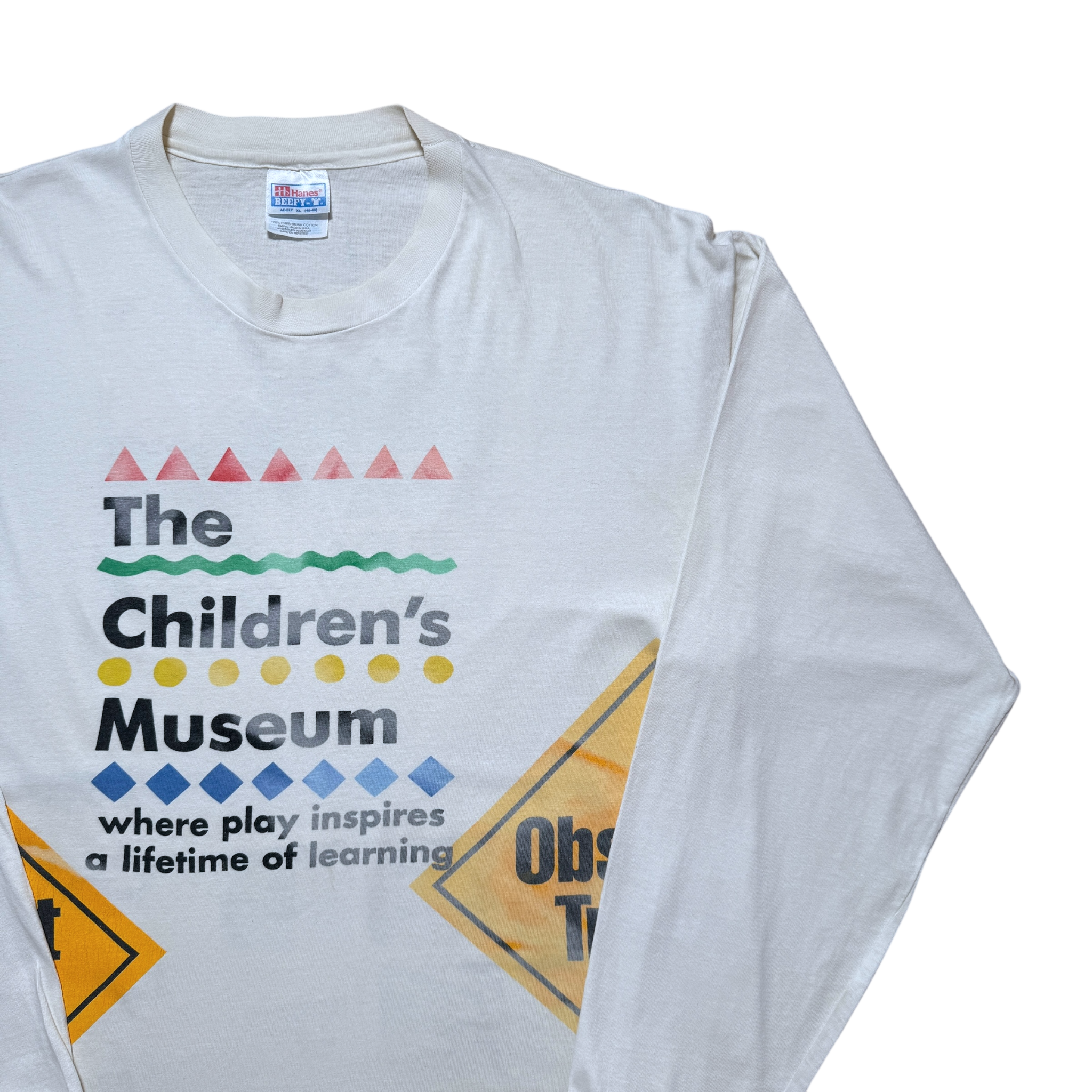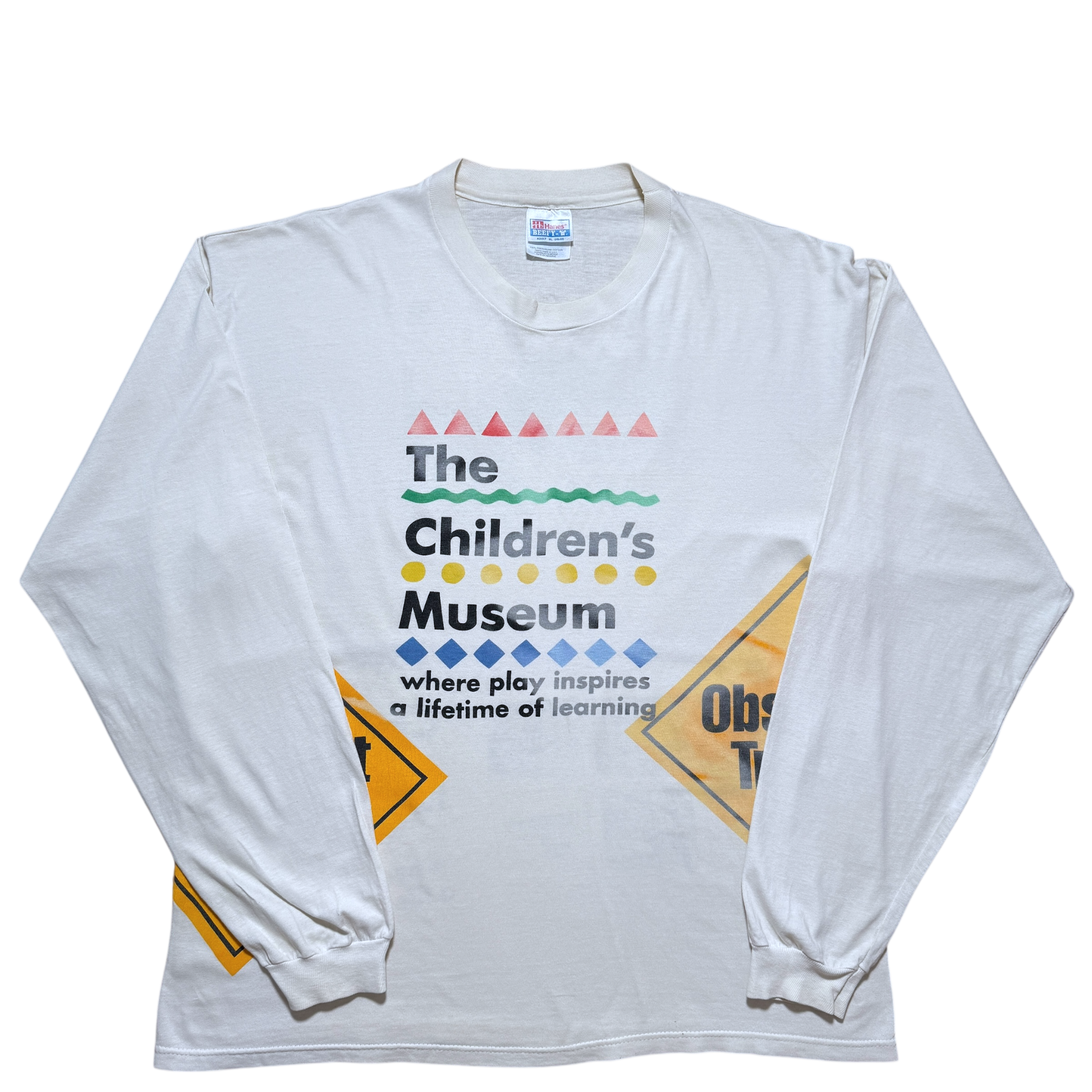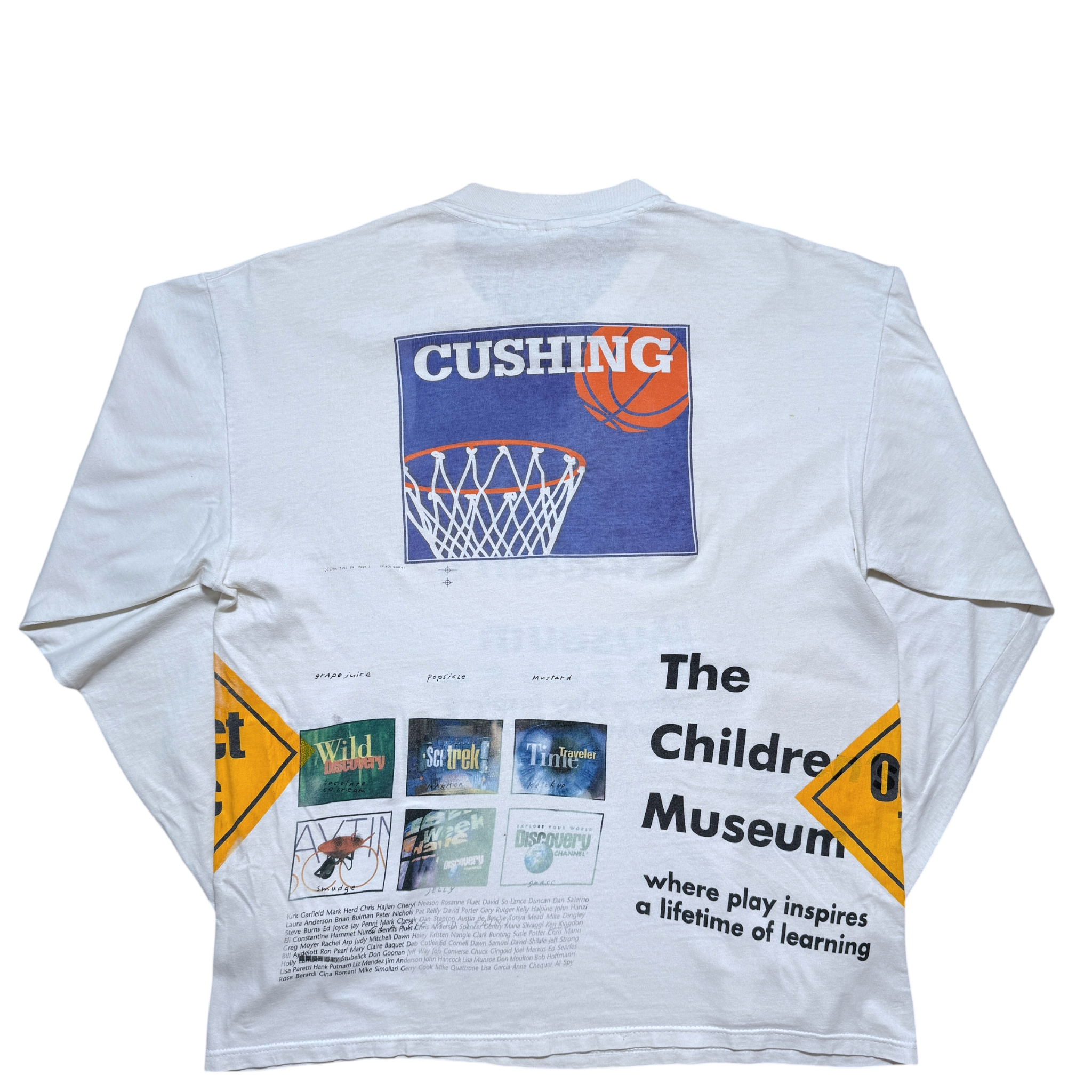 The Children's Museum test-print langærmet t-shirt fra 90’erne med frontprint, der fremhæver museets farverige logo og slogan “Where play inspires a lifetime of learning”. Bagsiden viser en kombination af grafik med basketball-motiv og små billeder af udstillinger. Let gulnet farve. Hanes tag størrelse XL. Fitter XL.
