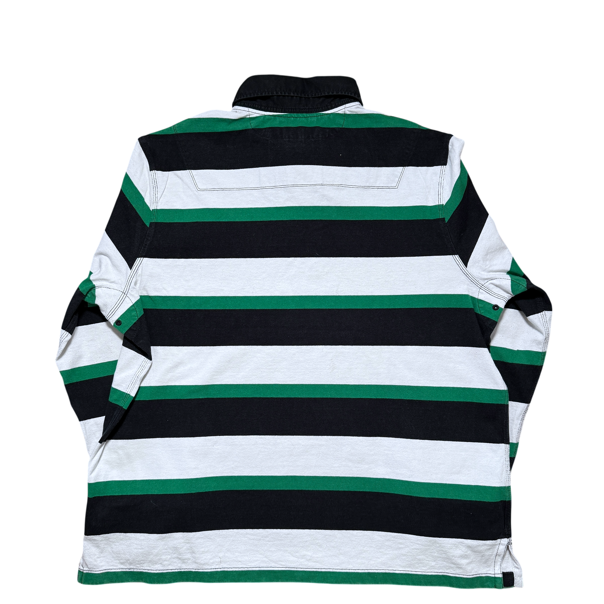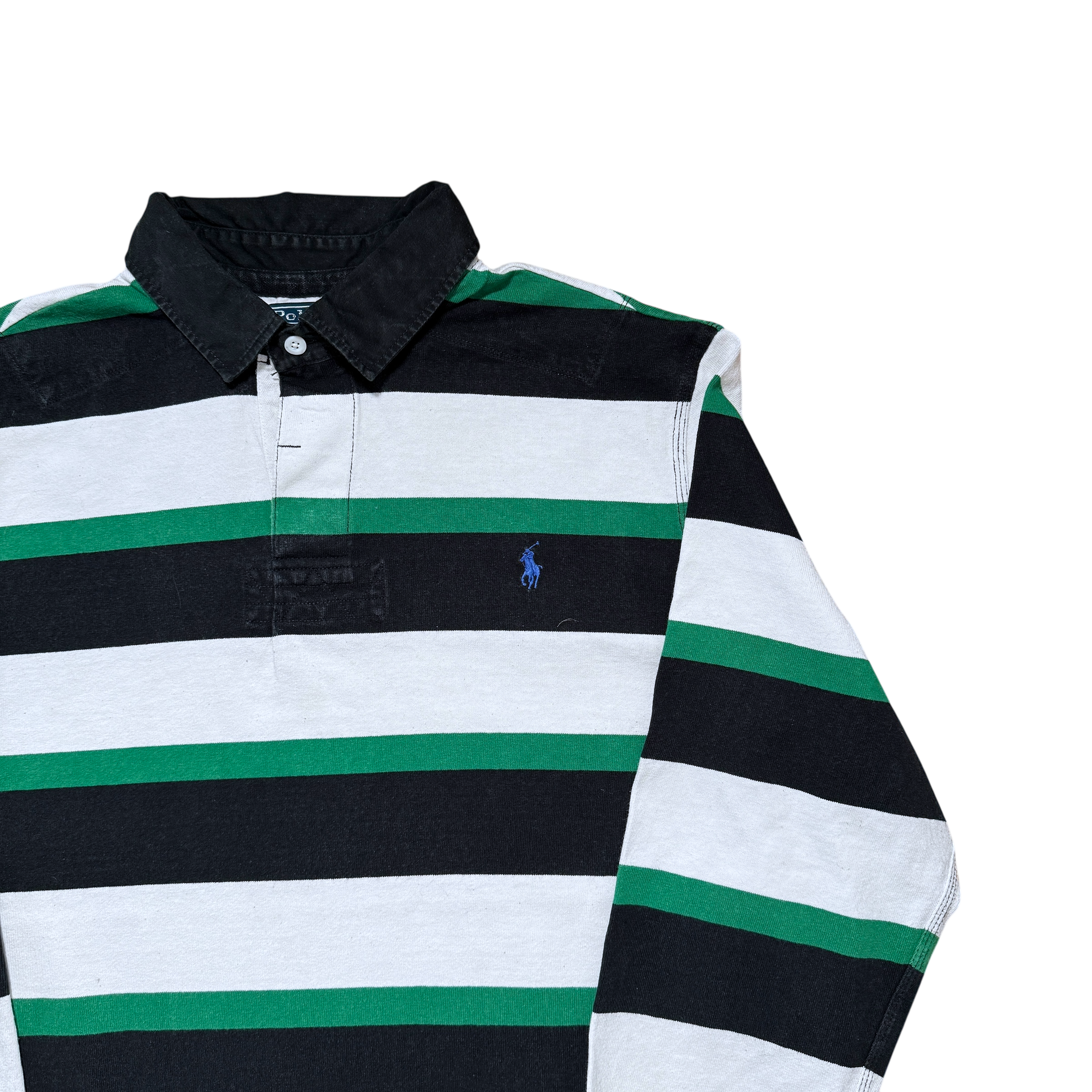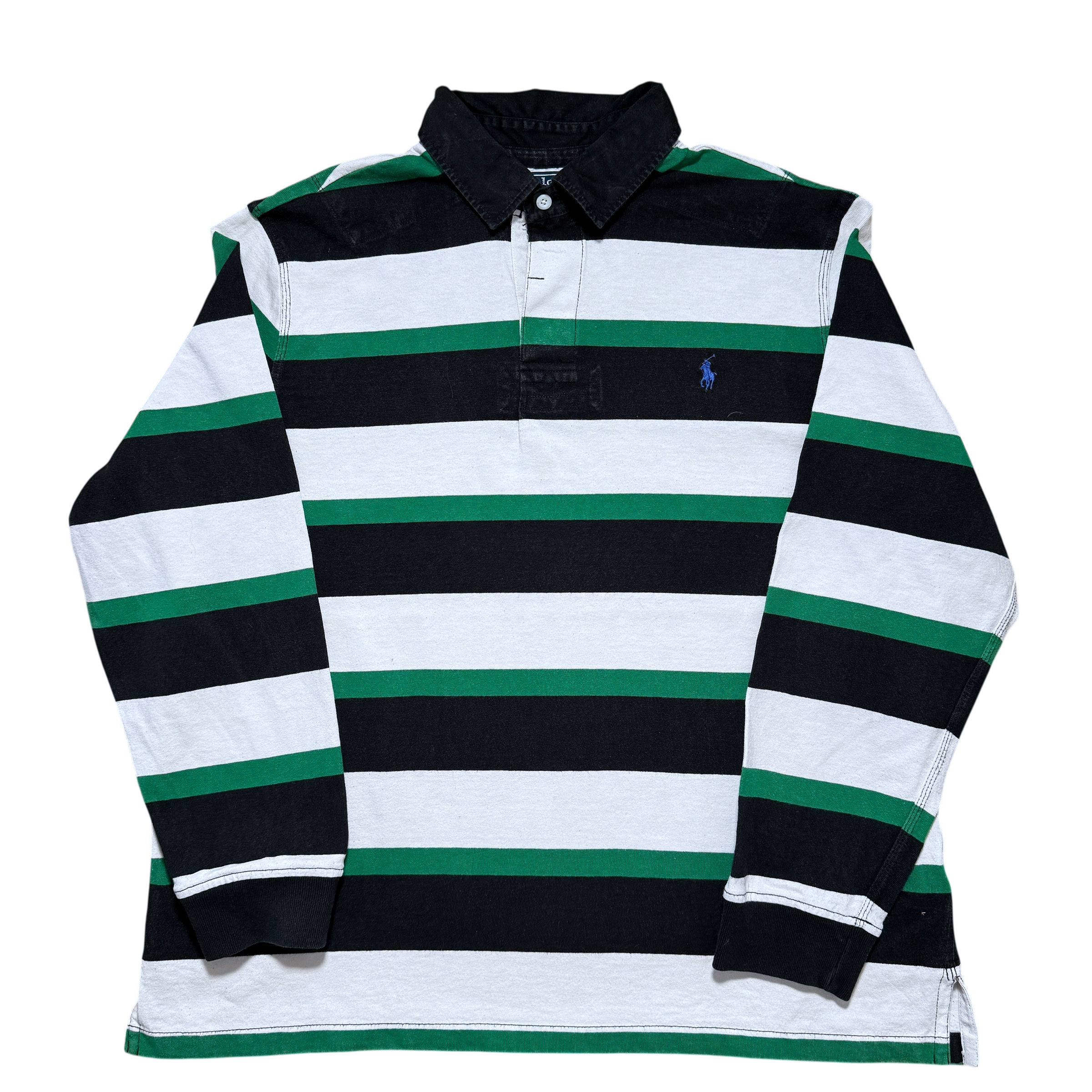 Vintage Ralph Lauren rugby polo med kraftig bomuldskvalitet og sort/grønne striber – præcis som en ægte preppy polo skal være. Flot tykt materiale og perfekt fit. Fitter XXL.