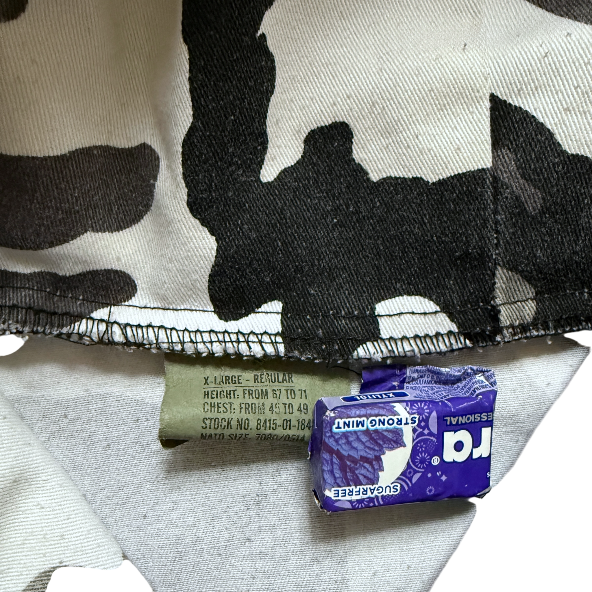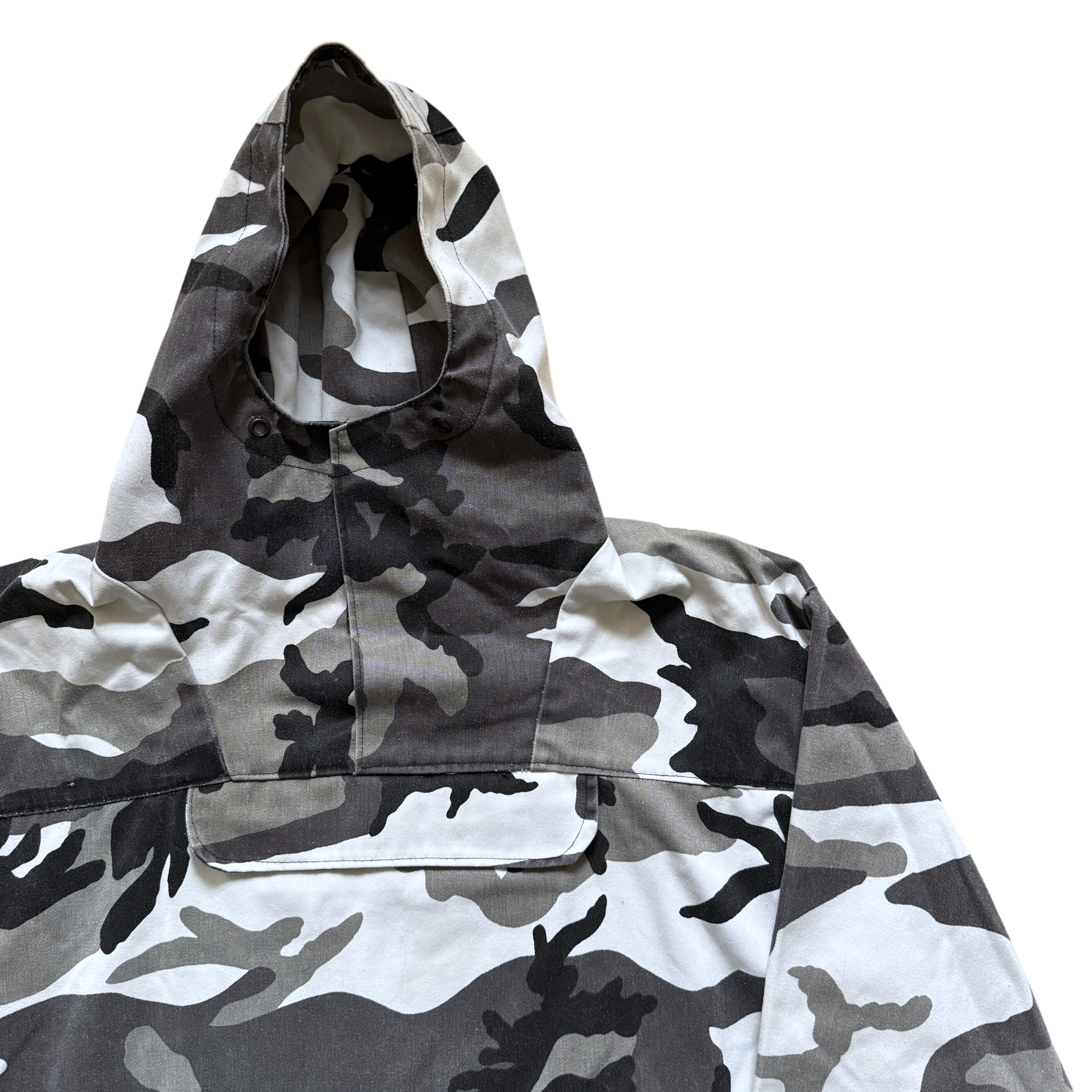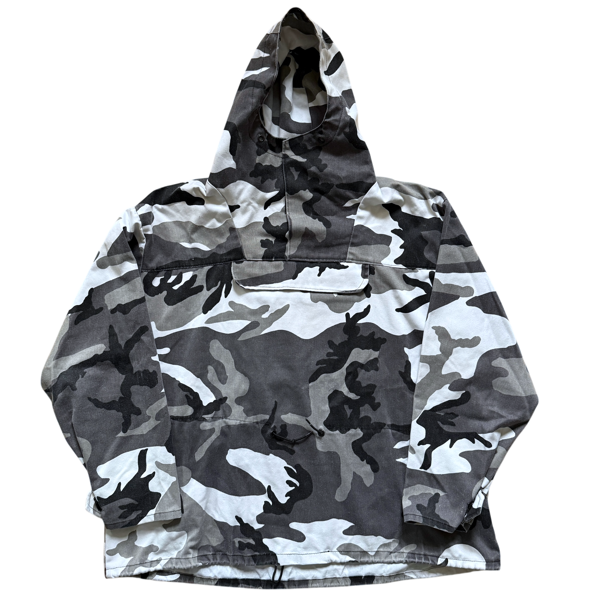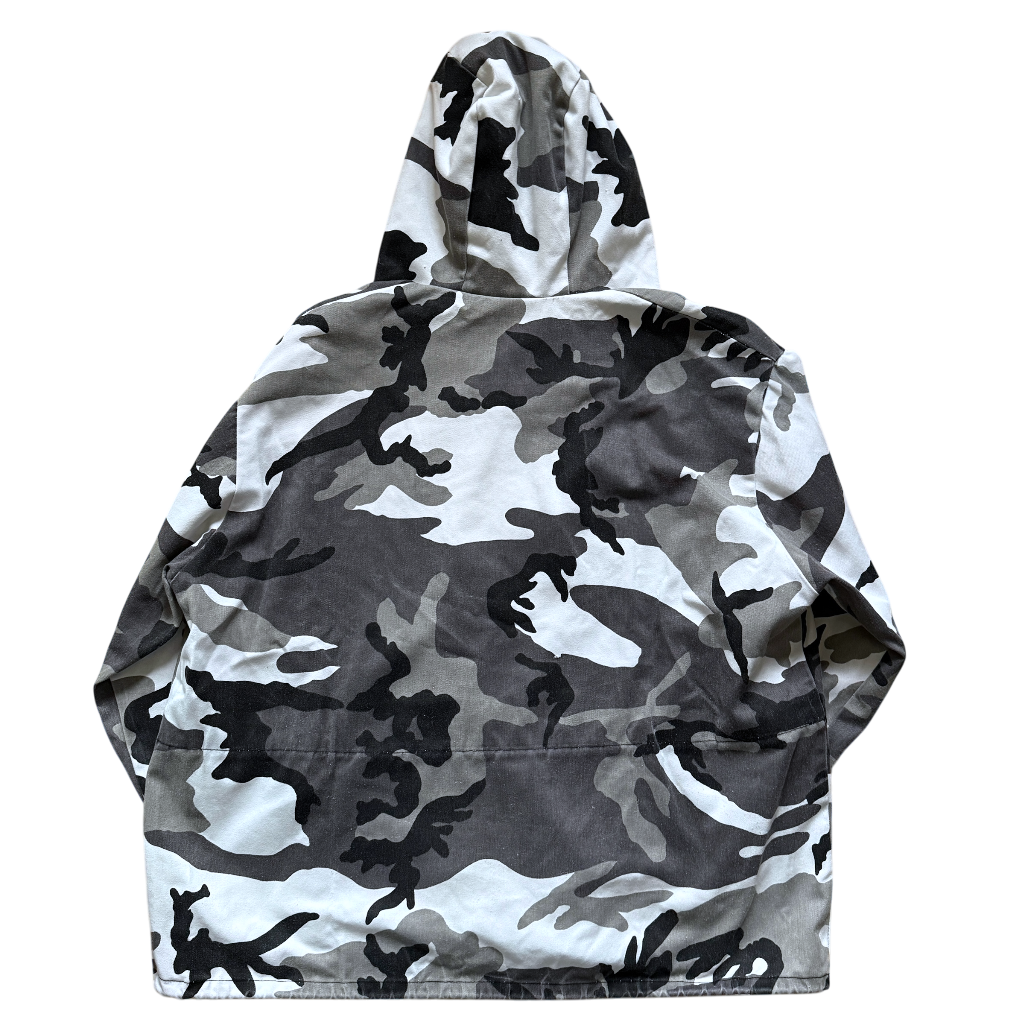 Snow camo militærjakke fra 90’erne med hætte, justerbare drawstrings i toppen og bunden – en perfekt jakke med masser af detaljer og karakter. Tag størrelse XL. Fitter oversized XL.