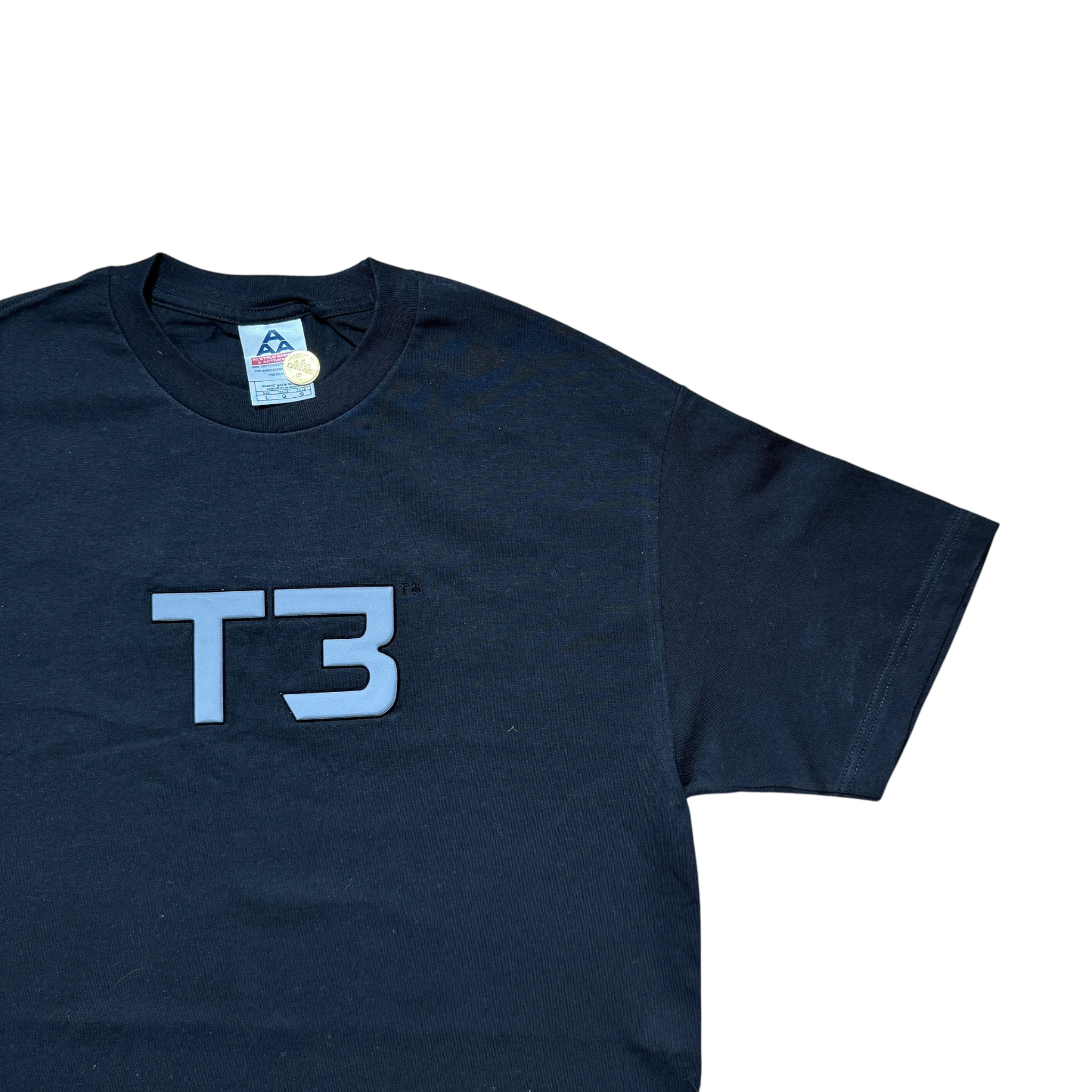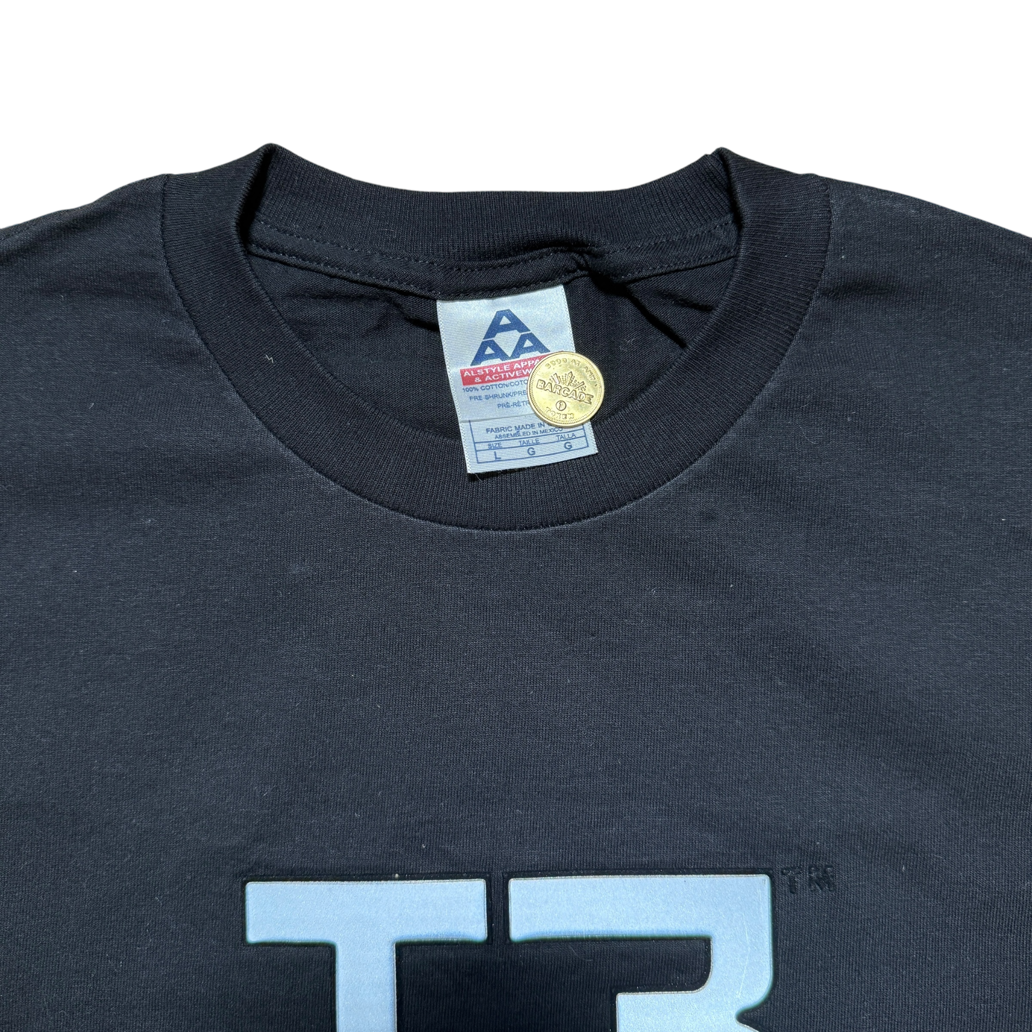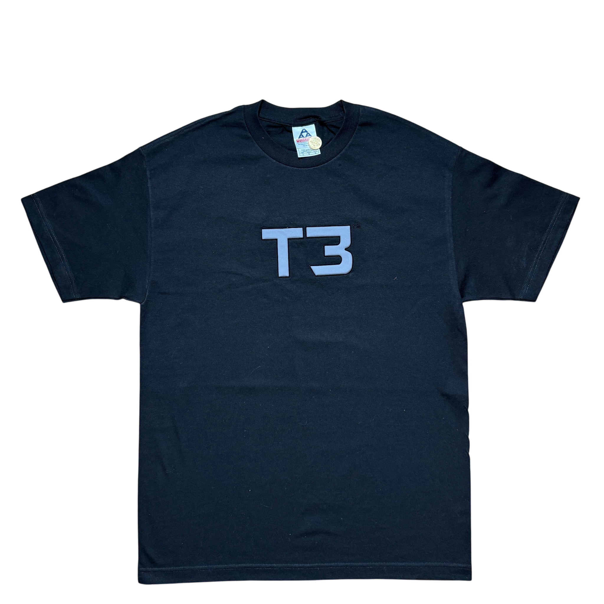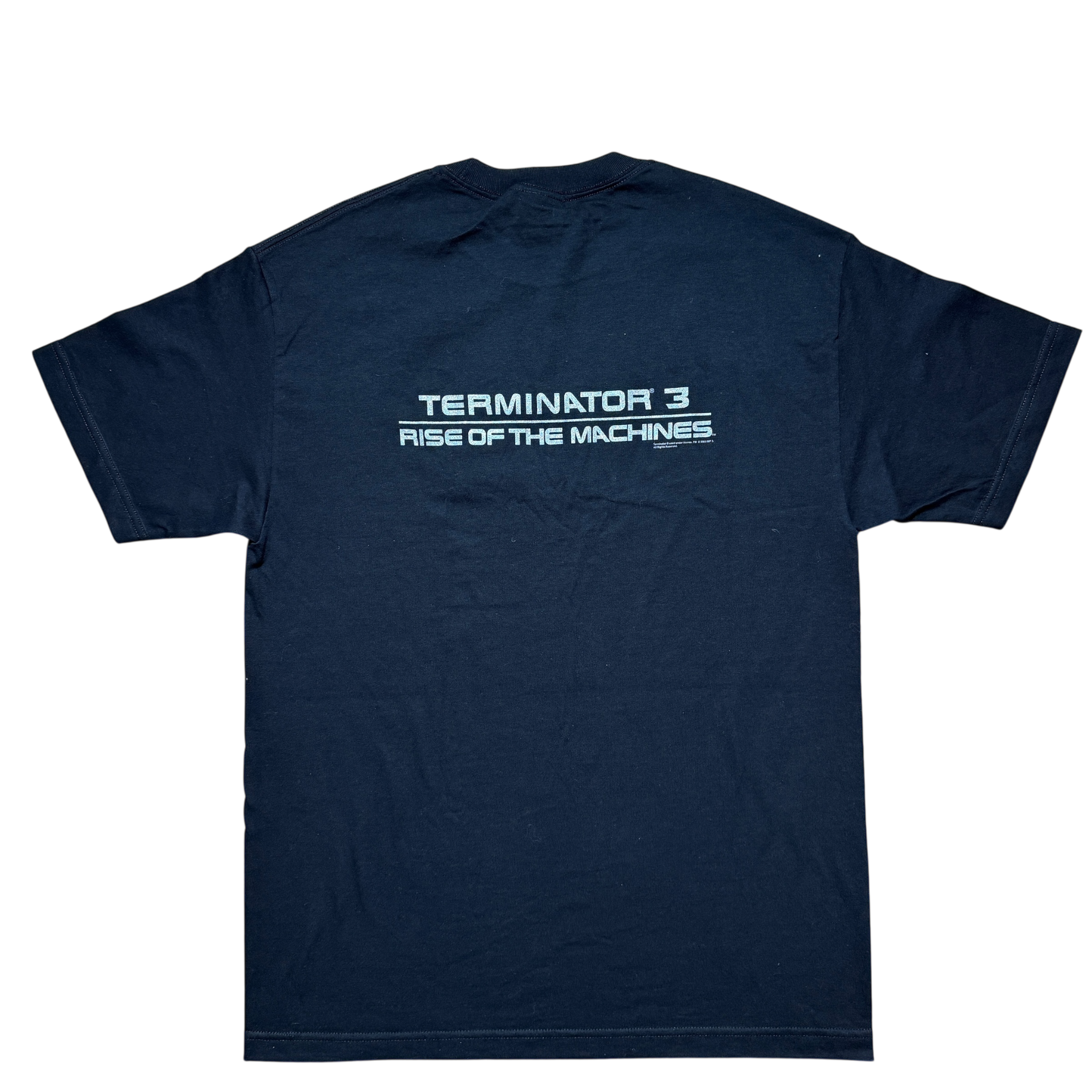 Promo-tee fra “Terminator 3: Rise of the Machines”, udgivet i forbindelse med filmens premiere i 2003 – tredje kapitel i den ikoniske sci-fi-franchise, hvor Arnold Schwarzenegger vender tilbage i sin mest berømte rolle. Minimalistisk frontprint med “T3”-logoet og et simpelt rygprint med filmtitlen, et designvalg der lader filmens navn tale for sig selv. 2003 Terminator copyright. AAA-tag størrelse L. Fitter Large.