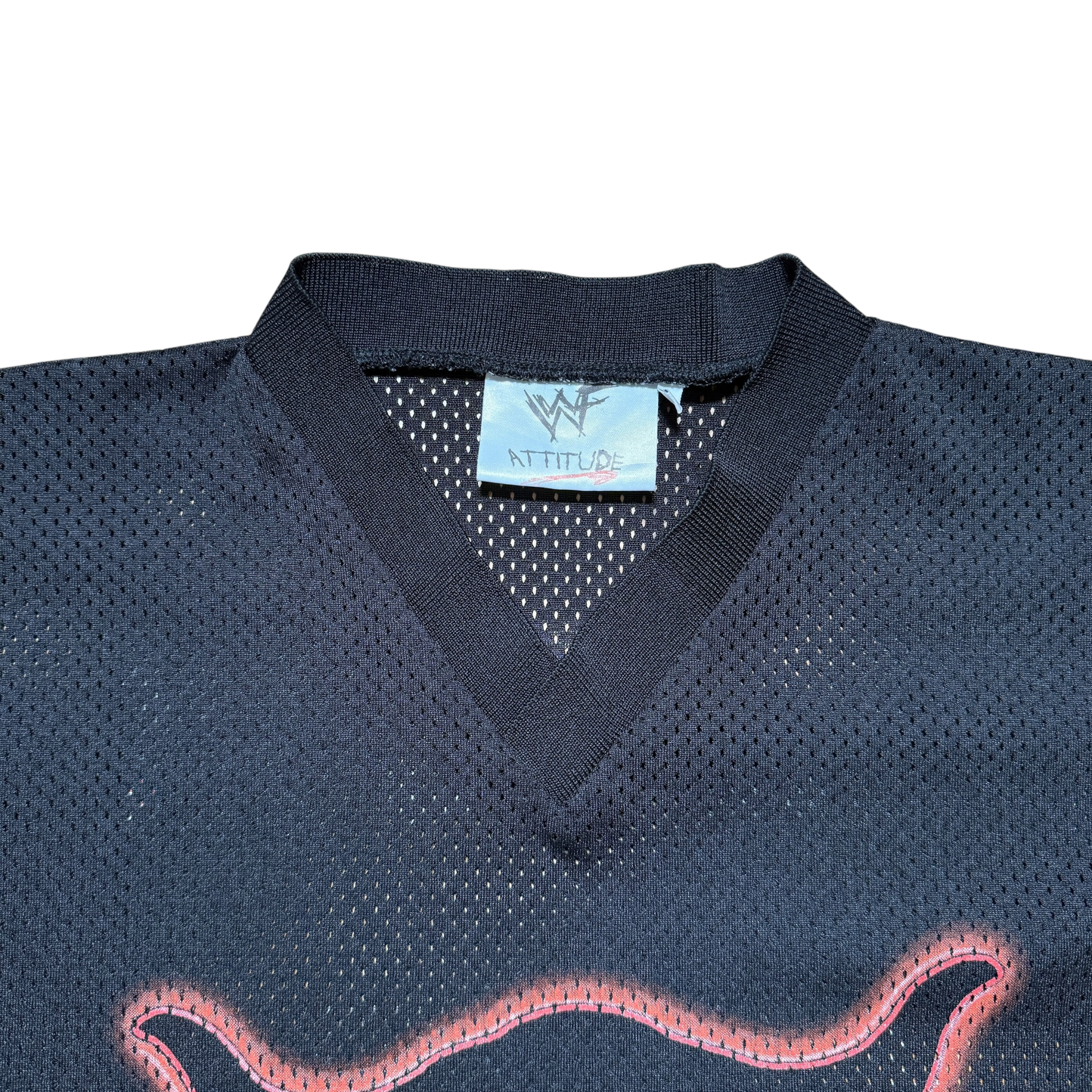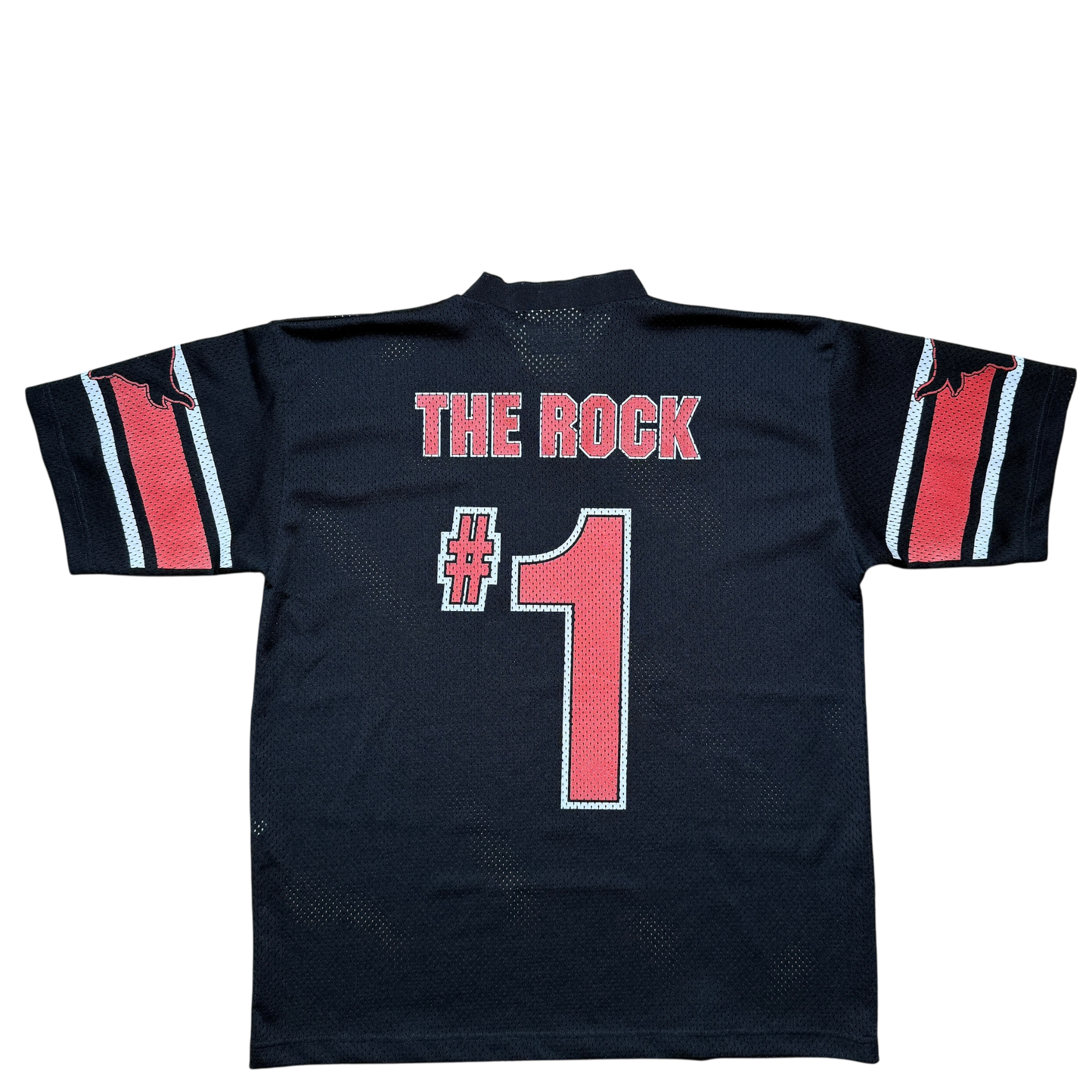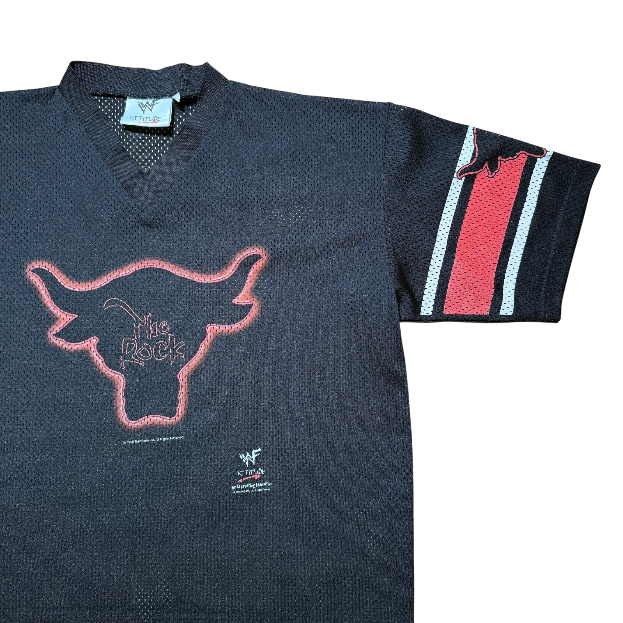 Black WWE mesh jersey from 1999 celebrating wrestling icon The Rock, famous for his signature phrase “Can you smell what The Rock is cooking?”. Features the iconic Brahma Bull graphic on the front and bold “The Rock #1” lettering on the back. WWF Attitude Era tag. Size XL, fits XL.