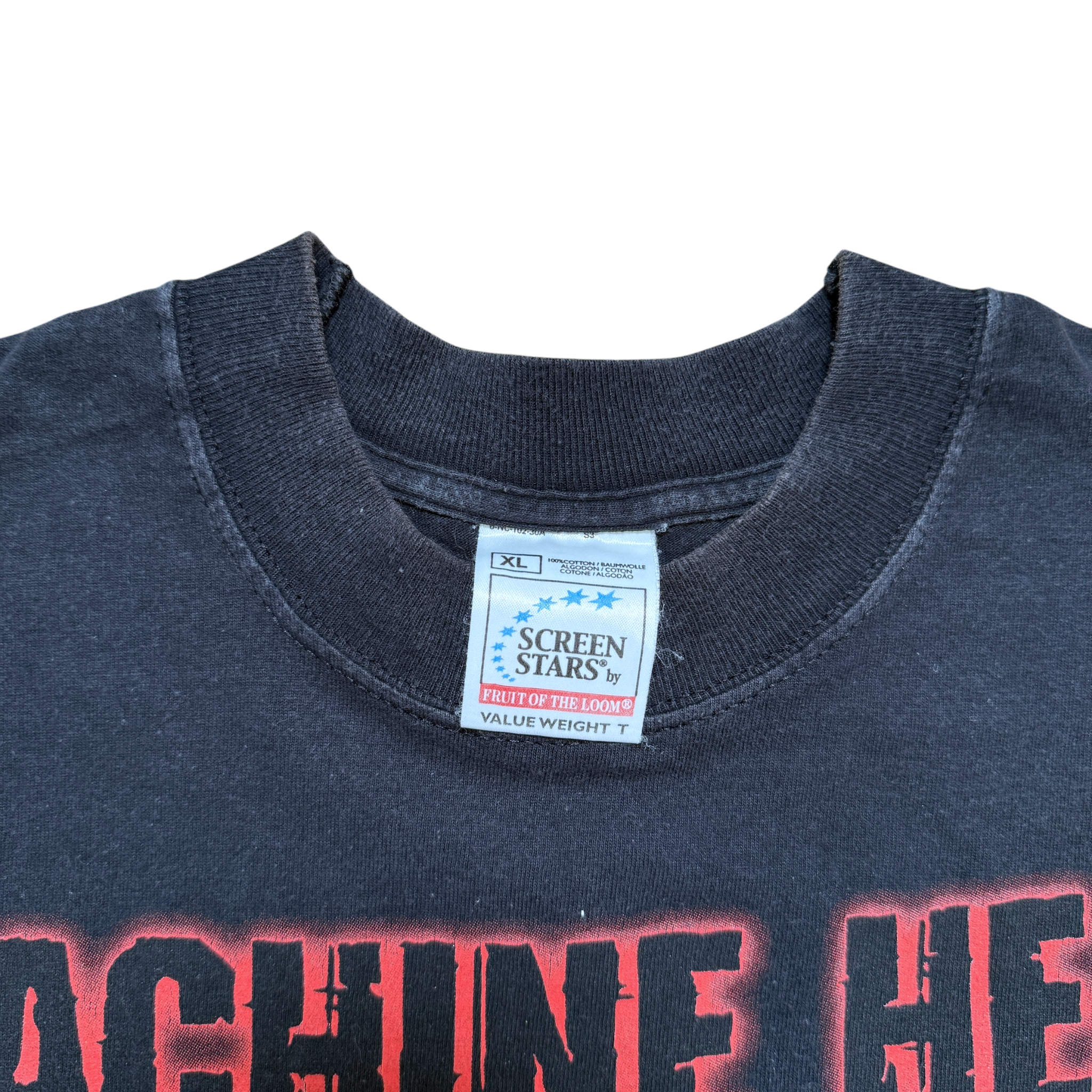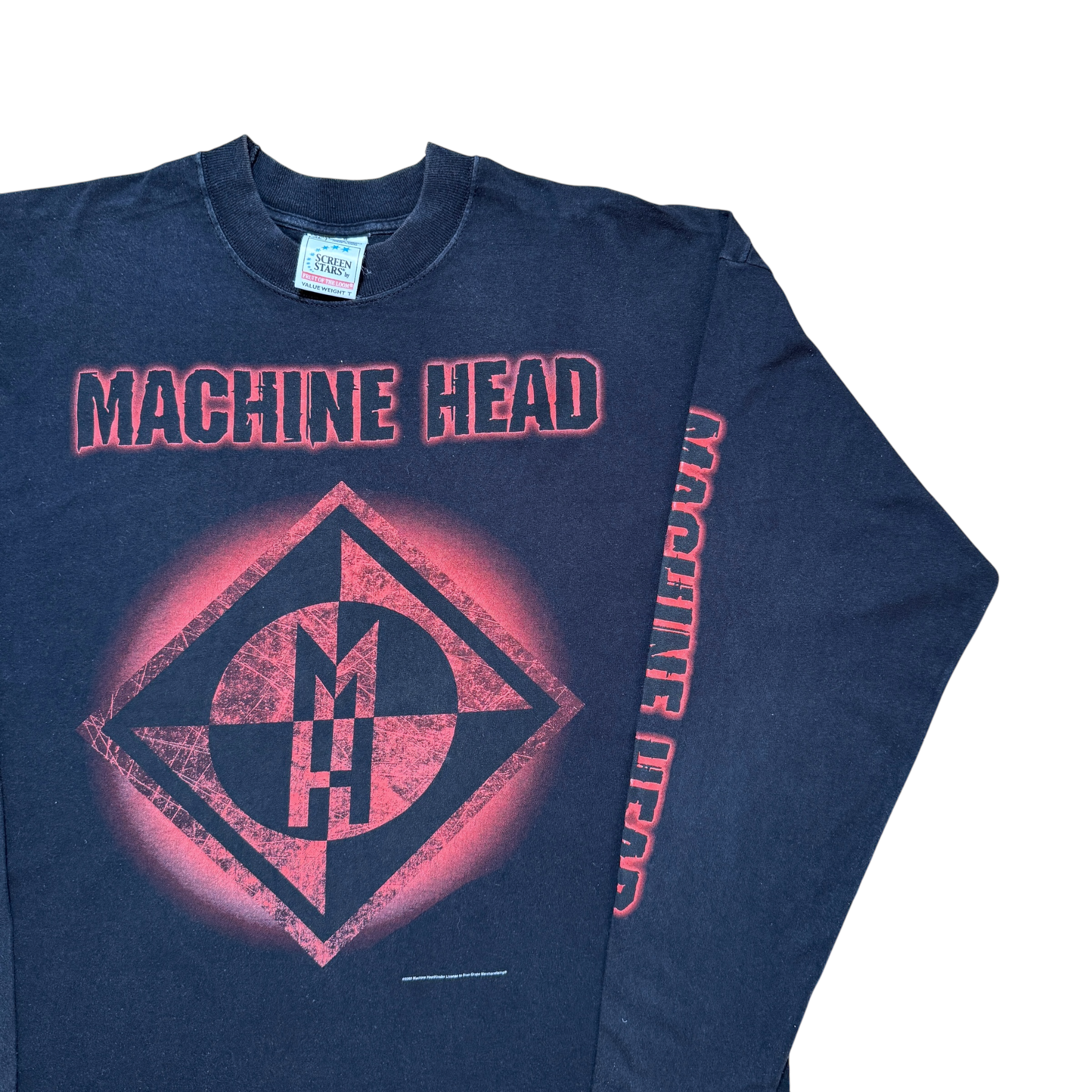 Long sleeve Machine Head shirt from 2000 featuring the bold MH logo in distressed red on the front and sleeve prints running down the arm. Captures the band’s heavy industrial aesthetic from The Burning Red era, marking a key stylistic shift in their sound. 2000 Machine Head copyright. Screen Stars tag size XL. Fits XL.