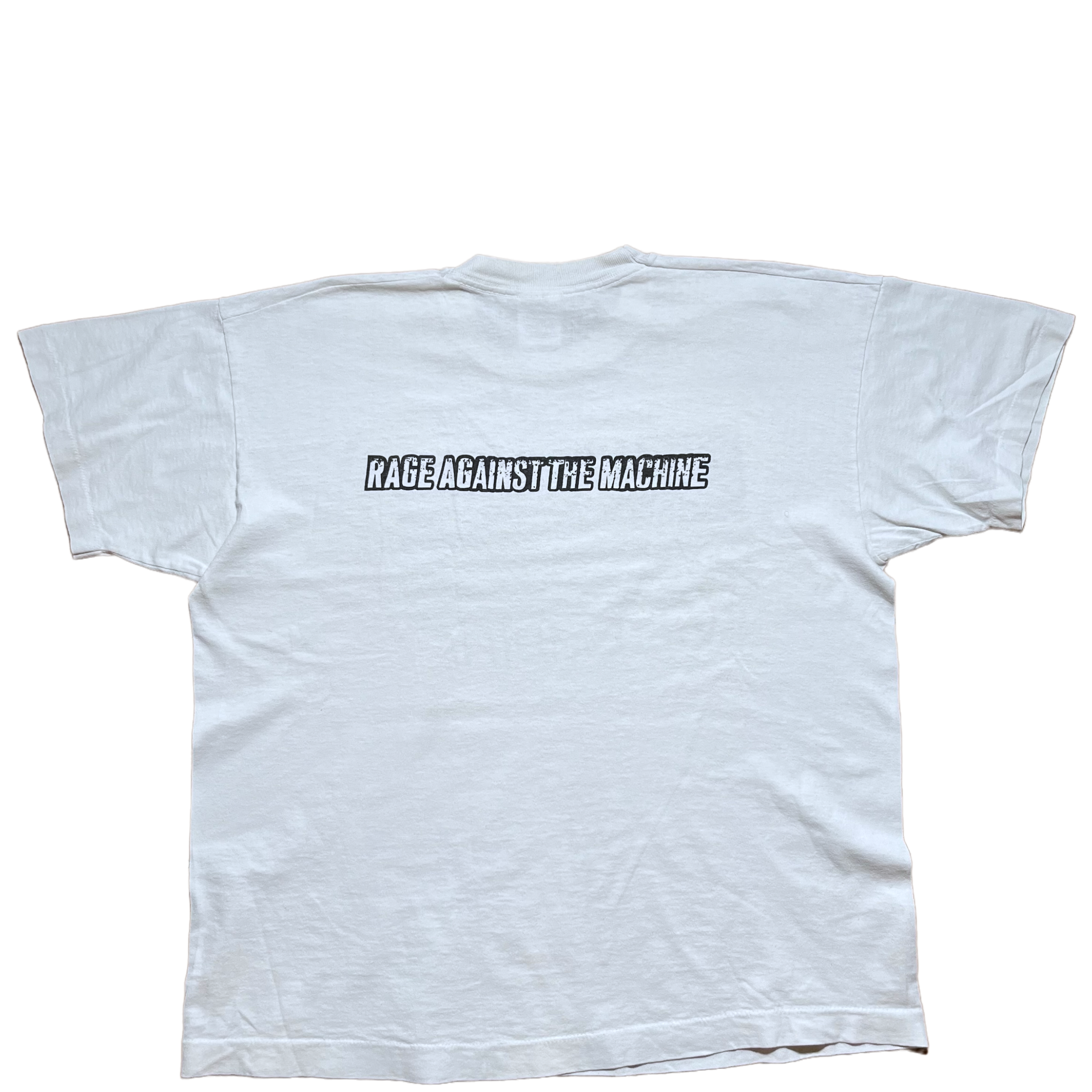 Rage Against The Machine t-shirt from their 1996 album Evil Empire. Rage Against The Machine copyright. Licensed to Giant. Screen Stars tag size XL. Fits boxy XL. Single stitch.