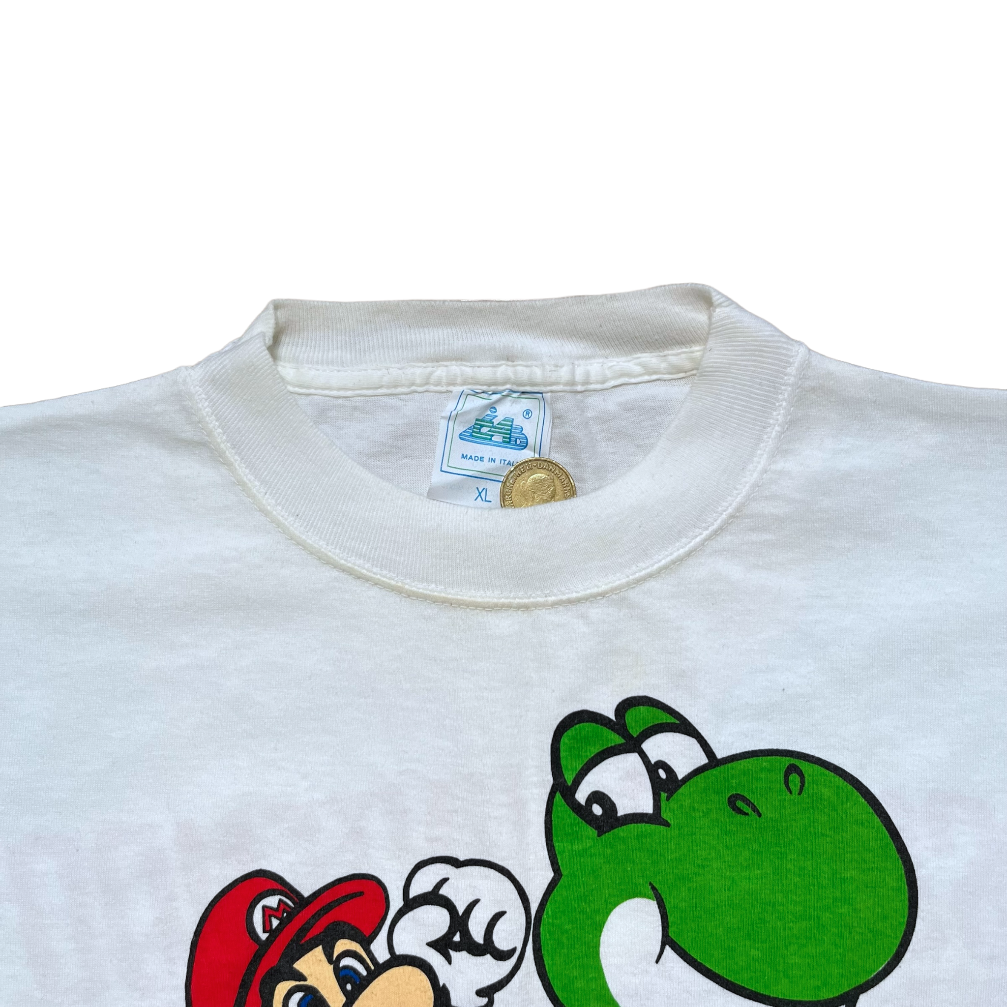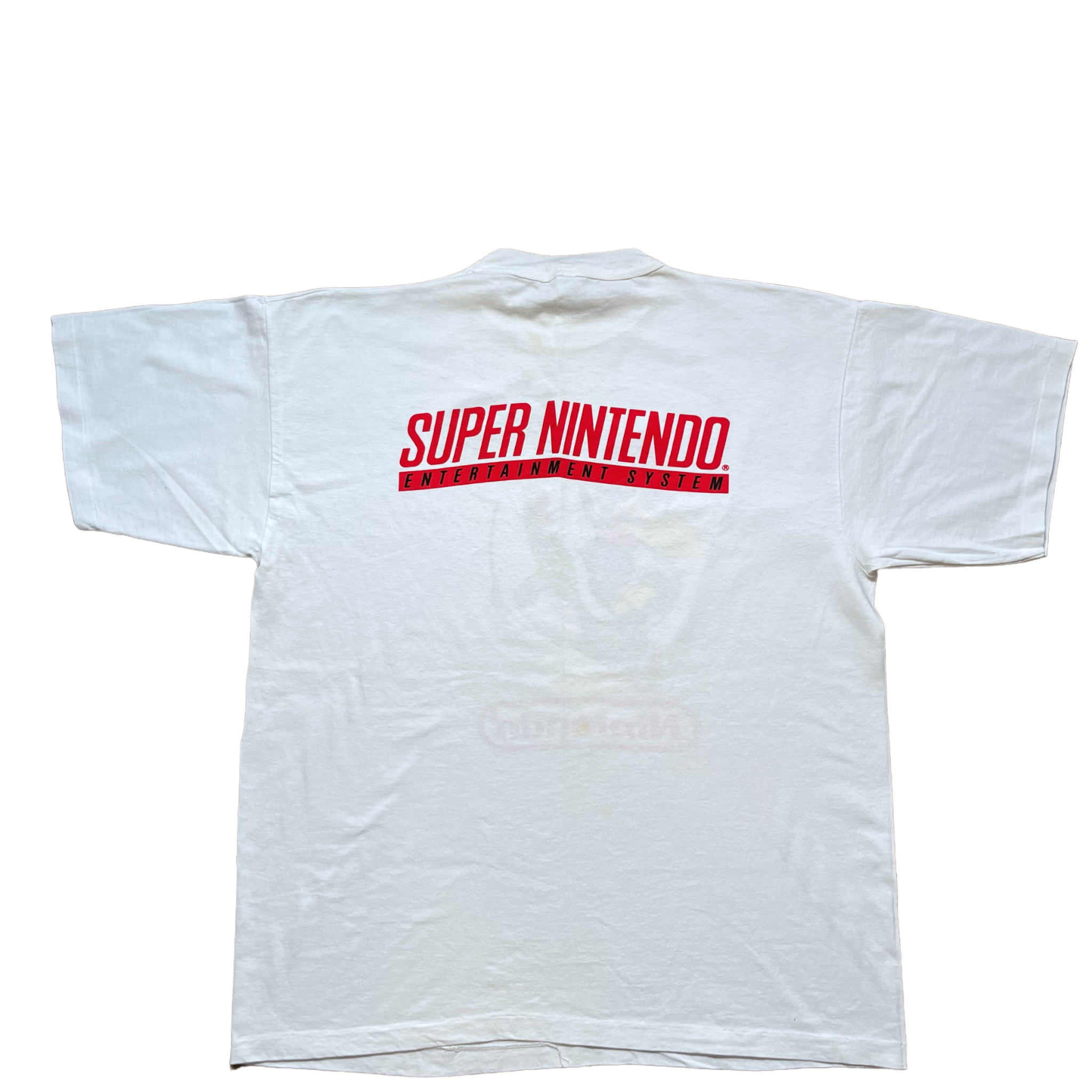 Epic Super Nintendo from the early '90s with Mario riding on Yoshi on the front and spellout Super Nintendo logo on the back. A true grail for the gamers. CAB tag size XL. Fits Large. Single stitch.