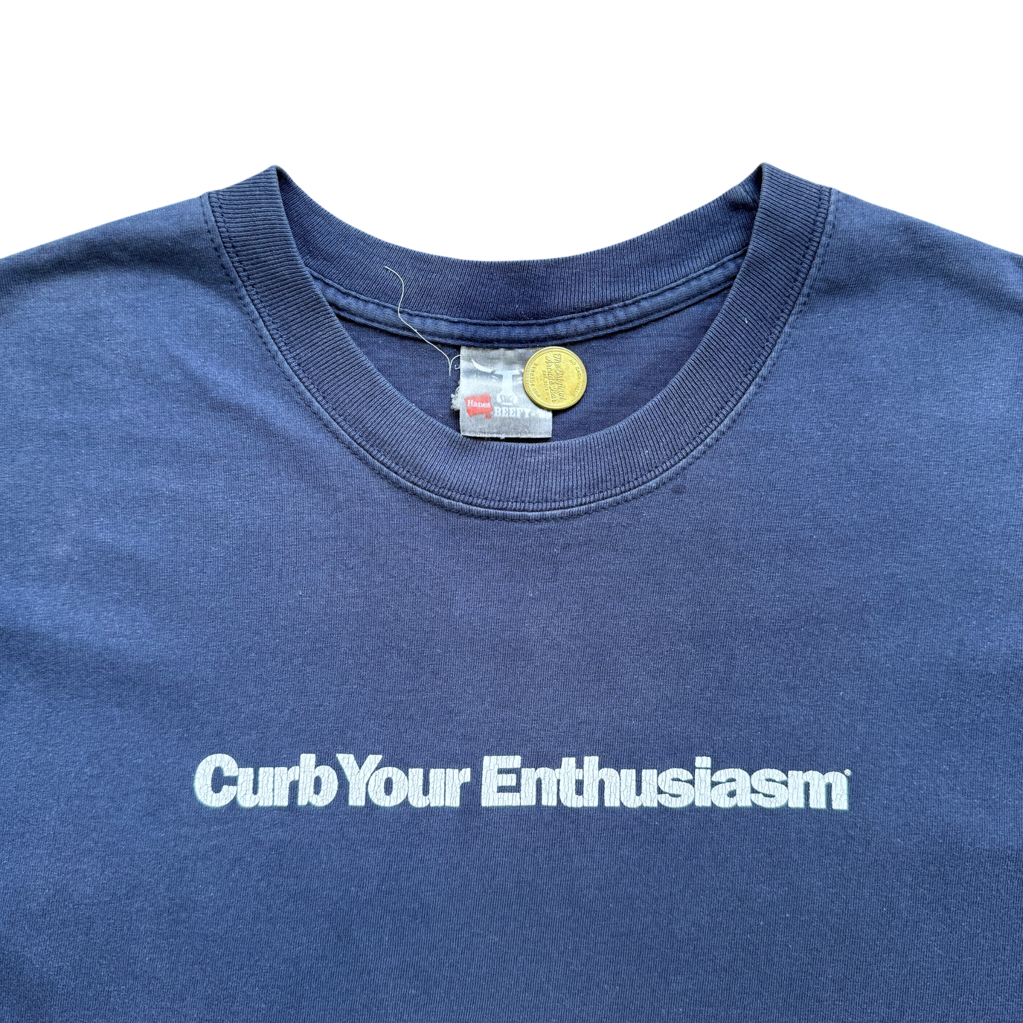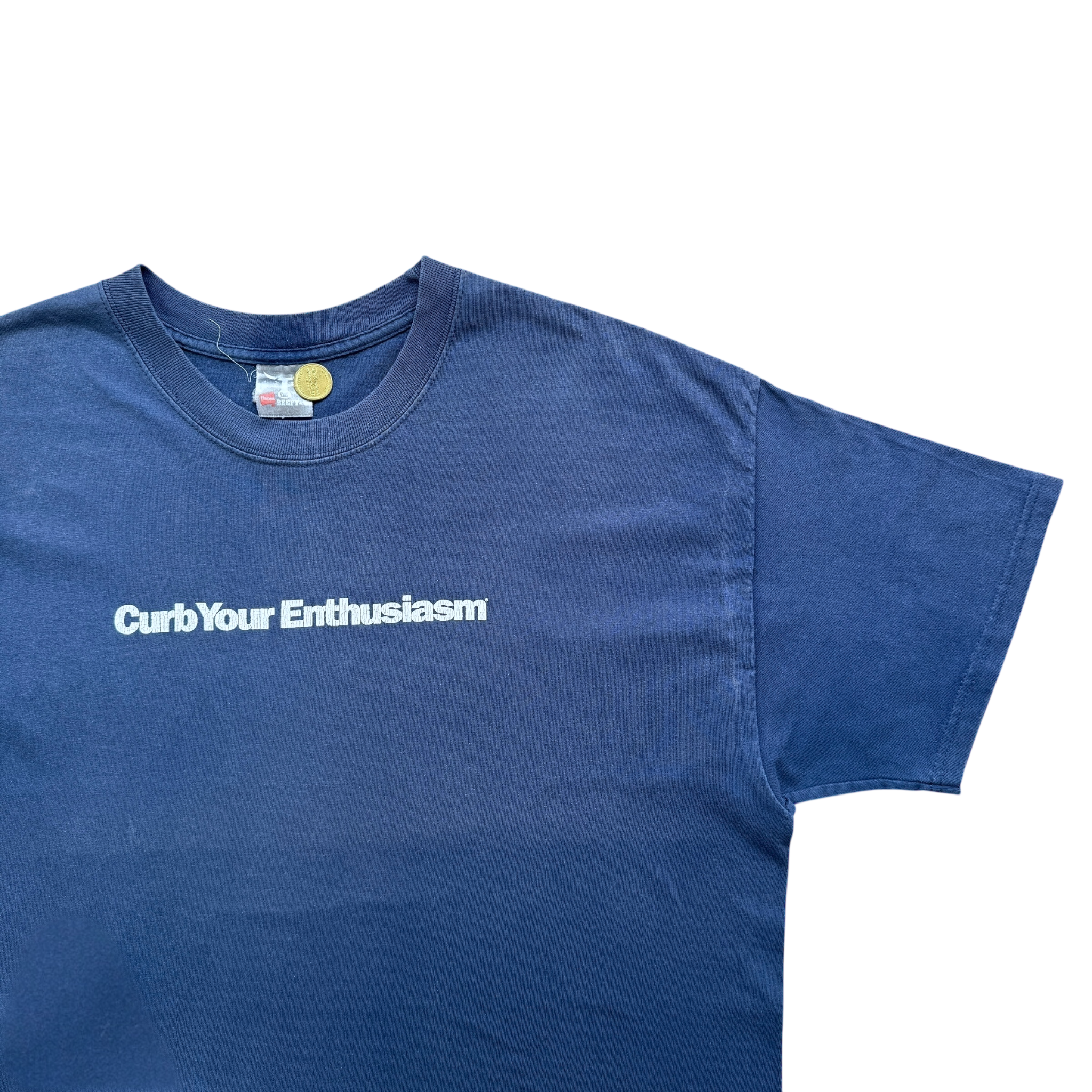 Curb Your Enthusiasm t-shirt med stort “Curb Your Enthusiasm” spellout på fronten og HBO-logo printet i nakken – en stærk tee fra en af de mest indflydelsesrige komedieserier nogensinde. Hanes Beefy tag størrelse XL. Fitter XL.