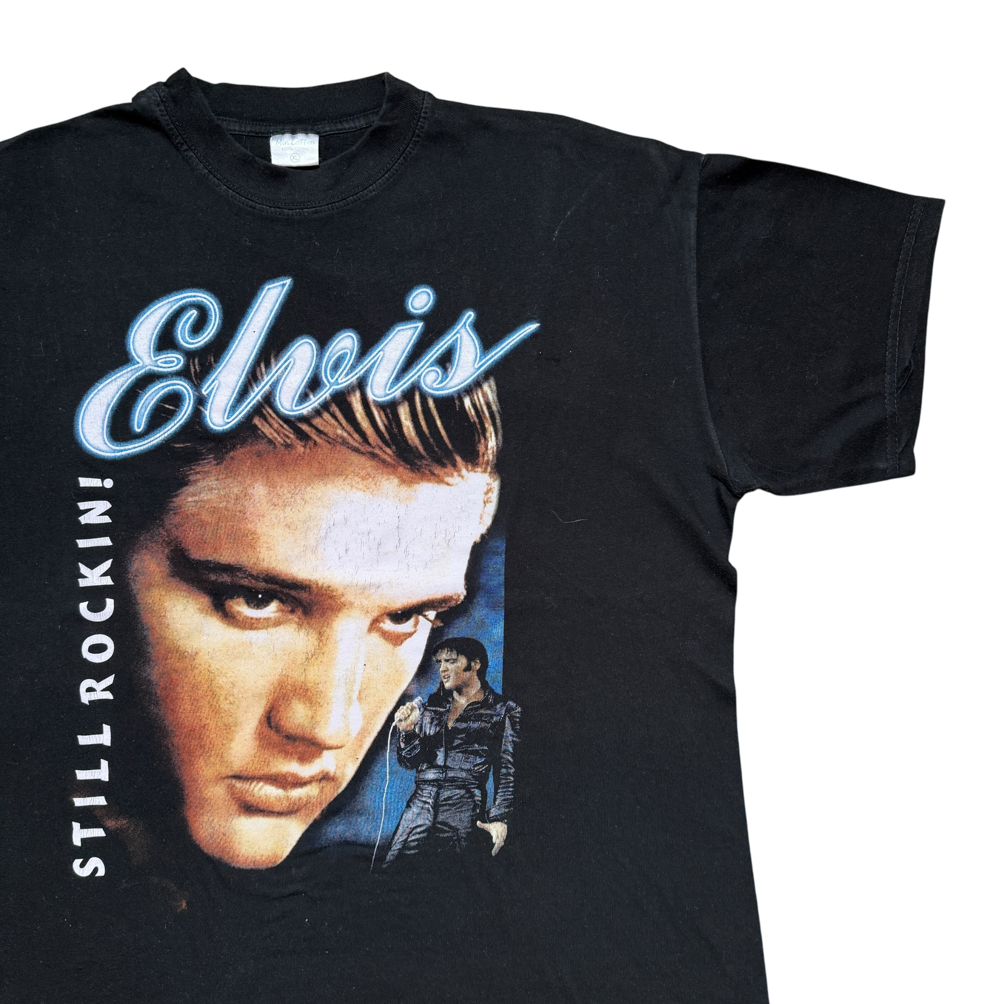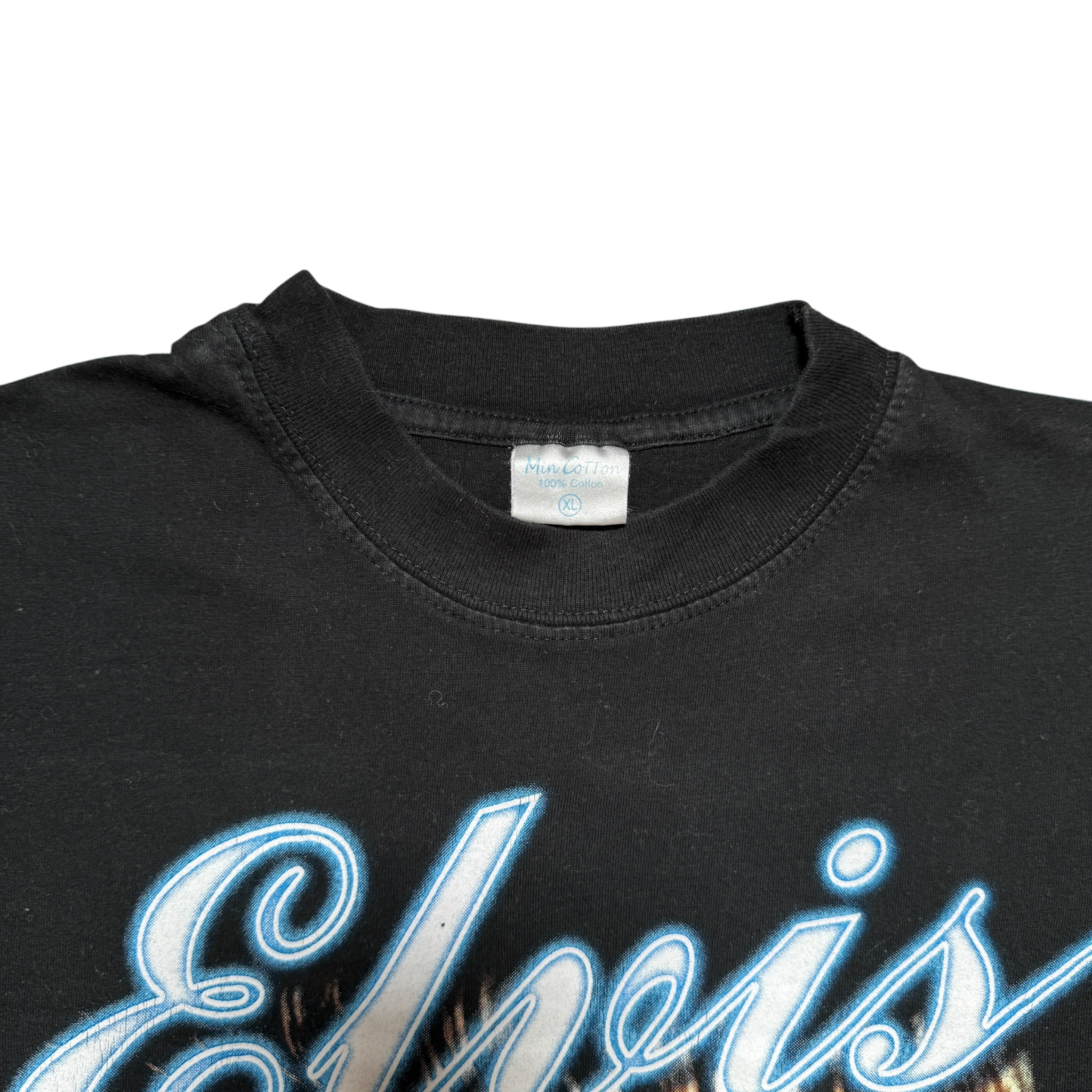 Tour-merch fra Elvis’ “Legends Live Forever”-turné i 2001, en hyldest til The King og hans udødelige musik. Frontprintet viser et ikonisk portræt af Elvis med “Still Rockin’” langs siden, mens bagsiden præsenterer et farverigt tourmotiv med billeder fra hans legendariske sceneoptrædener og en komplet liste over turnéstop i Europa. 2001 copyright. 100% bomuld-tag størrelse XL. Fitter XL.